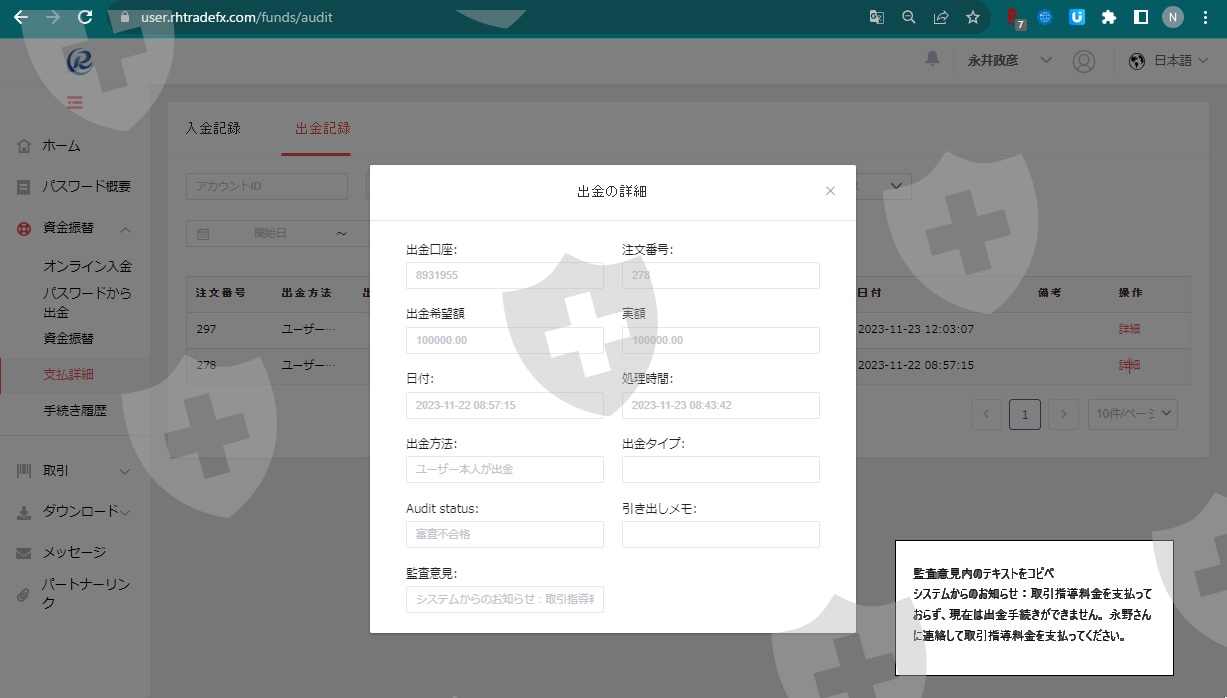 我们能够继续进行需要保留到 11 月 21 日的原油交易。当我们提前检查时,我们被告知可以使用杠杆预算,但半途我们被告知我们需要实物资金。还有一个条款规定,如果不能履行协议,将收取“30%的违约金”,所以我们设法筹集了足够的资金,变成了实物资金。我已经确认,一旦11月21日的付款完成,我就可以在11月22日自由取款,所以此时不知为何我心里松了口气。然后,当截止日期到来并且付款成功完成时,我要求提款,但提款被拒绝,因为我被告知要支付交易指导费。我存入的资金不足以支付所要求的实物资金,但我在代表的交易指导下通过虚拟货币FX筹集了不足的部分,因此不需要提前收取任何指导费。我没有听说过是的,但我觉得没办法了,就付了钱。付款时,我已确认不会再收取任何费用,但现在我被告知,除非我缴纳购置税,否则我将无法提取这笔钱。当然,我们不可能交购置税,所以我们就跟他们商量了。这是一笔非常大的资金,因此我们非常感谢您的帮助。