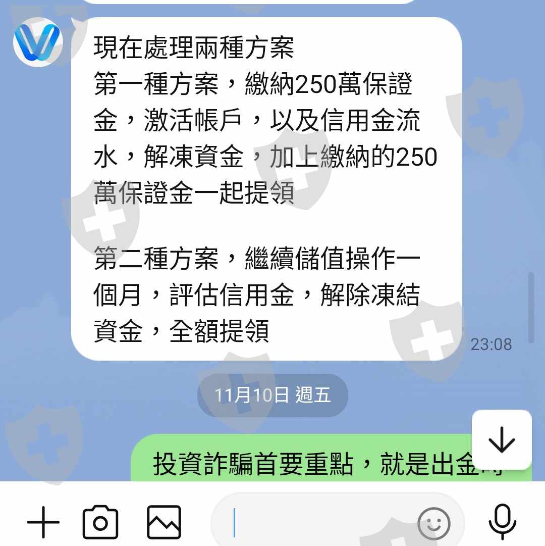 11月初加入以郭振榮老師領軍名為寶鑫投顧菁英團隊的匡世濟俗複利計畫,Vistova為交易商,以陳經理為客服,我個人投入資金台幣510萬,操作原油及黃金差價合約,帳面上每次操作皆有獲利,且老師口口聲聲標榜可隨時提領天天提領,愛提領多少皆隨人自由,本人前後共提領兩次共170萬,但就在第三次提領時,被告知資金遭凍結無法出金,必須繳納投入成本資金500萬的1/2即250萬,方可出金,個人驚覺遭受詐騙,堅決不再付款,只希望能將剩餘本金340萬提領出來,對方拒絕同意,執意要我繳入保證金250萬,說只要繳入保證金就就可成本連同保證金一起提領出來...一堆理由藉口阻止出金,詐騙行為另人不齒!