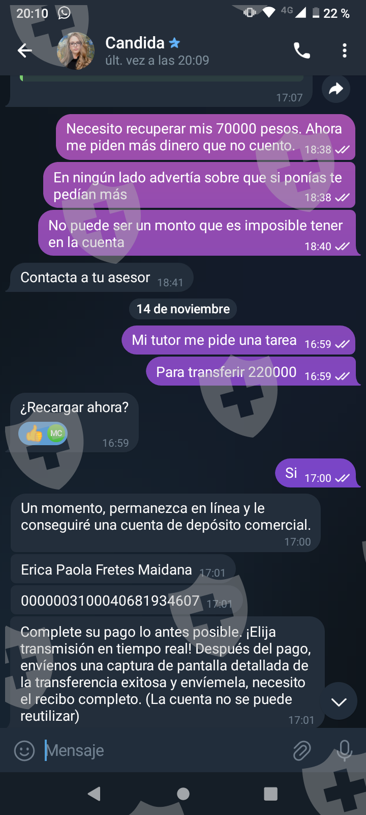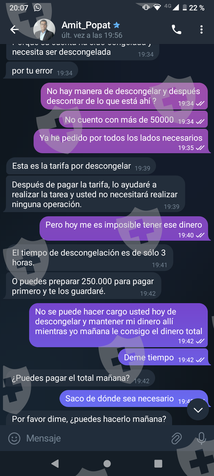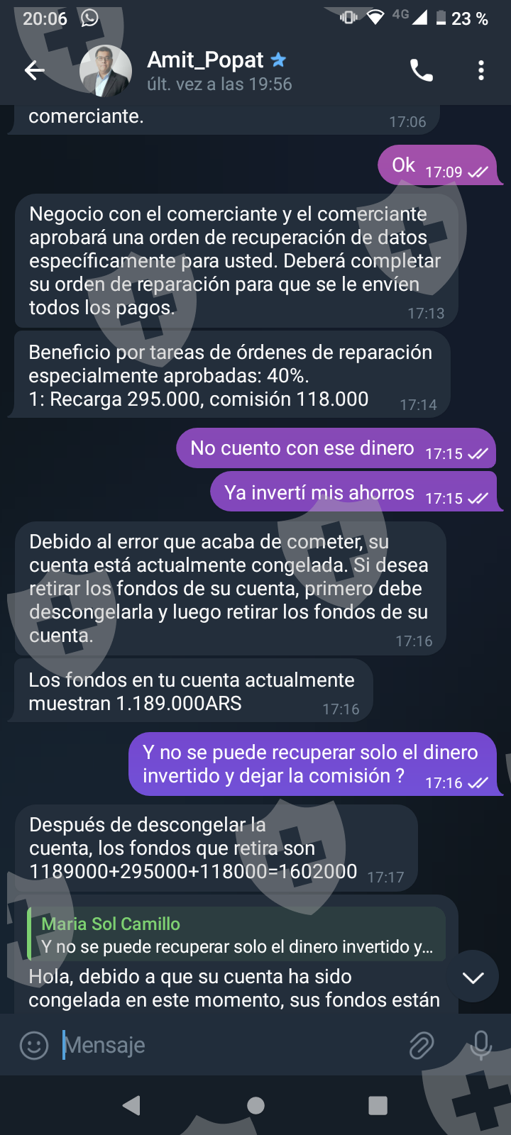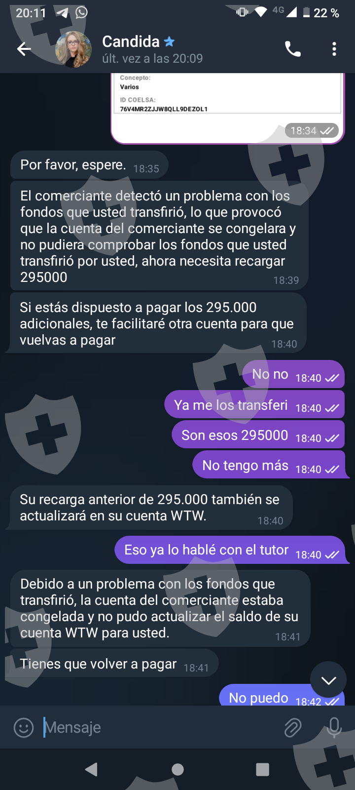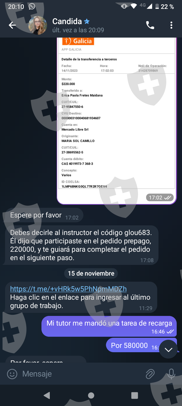 他们首先在 WhatsApp 上与我交谈,然后将我转至 Telegram,并要求我进行少量投资以换取佣金。前两项投资符合要求,并连同佣金一起转让给我。随着金额的增加,他们向我索要的钱越来越多,以便能够完成他们所谓的家庭作业,并能够得到我的钱和佣金。最终这一切都没有发生,他们要求越来越多,投资额或多或少为 1,500 美元。我想至少拿回我投入的钱。