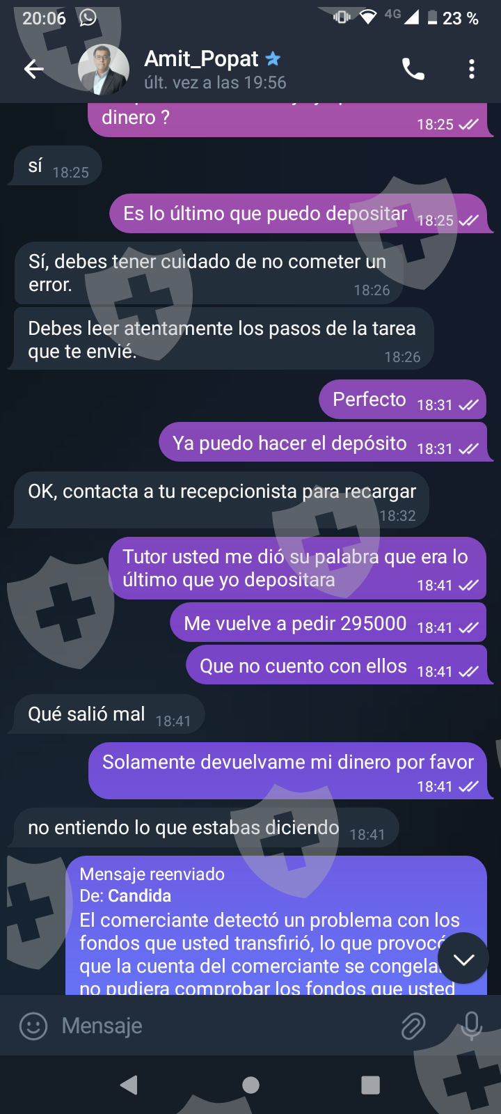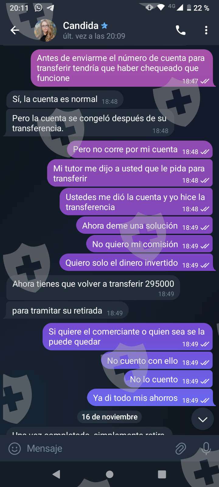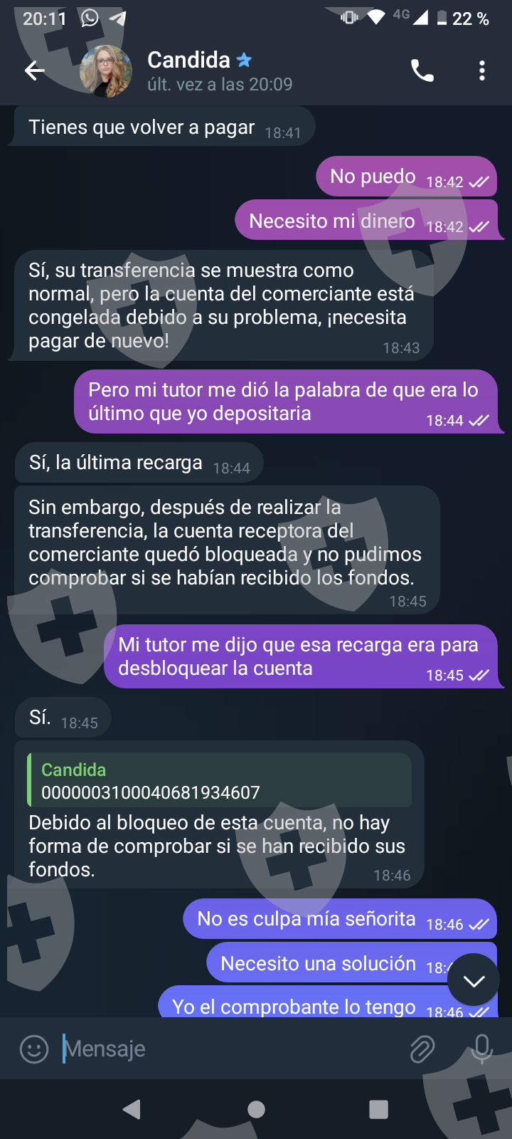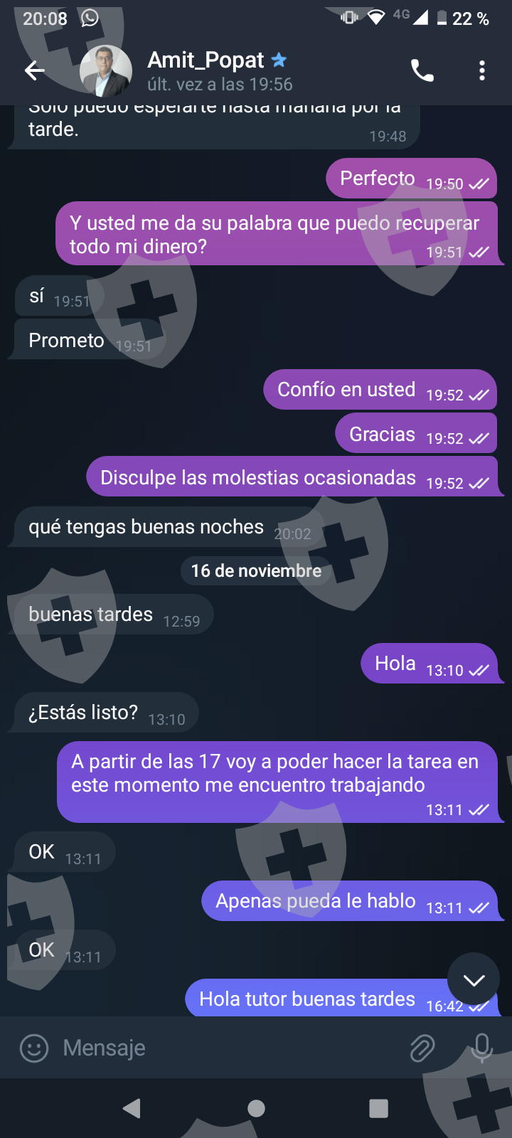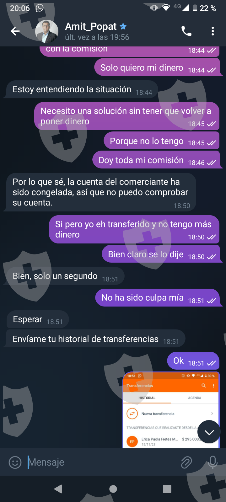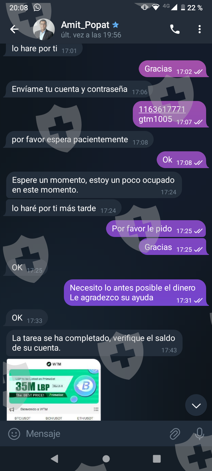他们首先在 WhatsApp 上与我交谈,然后将我转至 Telegram,并要求我进行少量投资以换取佣金。前两项投资符合要求,并连同佣金一起转让给我。随着金额的增加,他们向我索要的钱越来越多,以便能够完成他们所谓的家庭作业,并能够得到我的钱和佣金。最终这一切都没有发生,他们要求越来越多,投资额或多或少为 1,500 美元。我想至少拿回我投入的钱。
