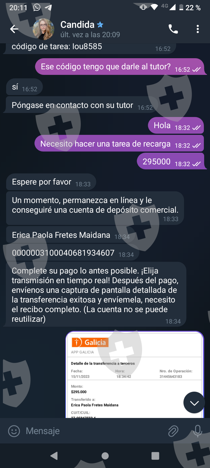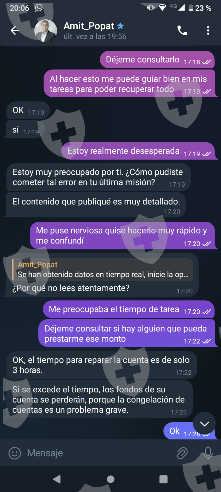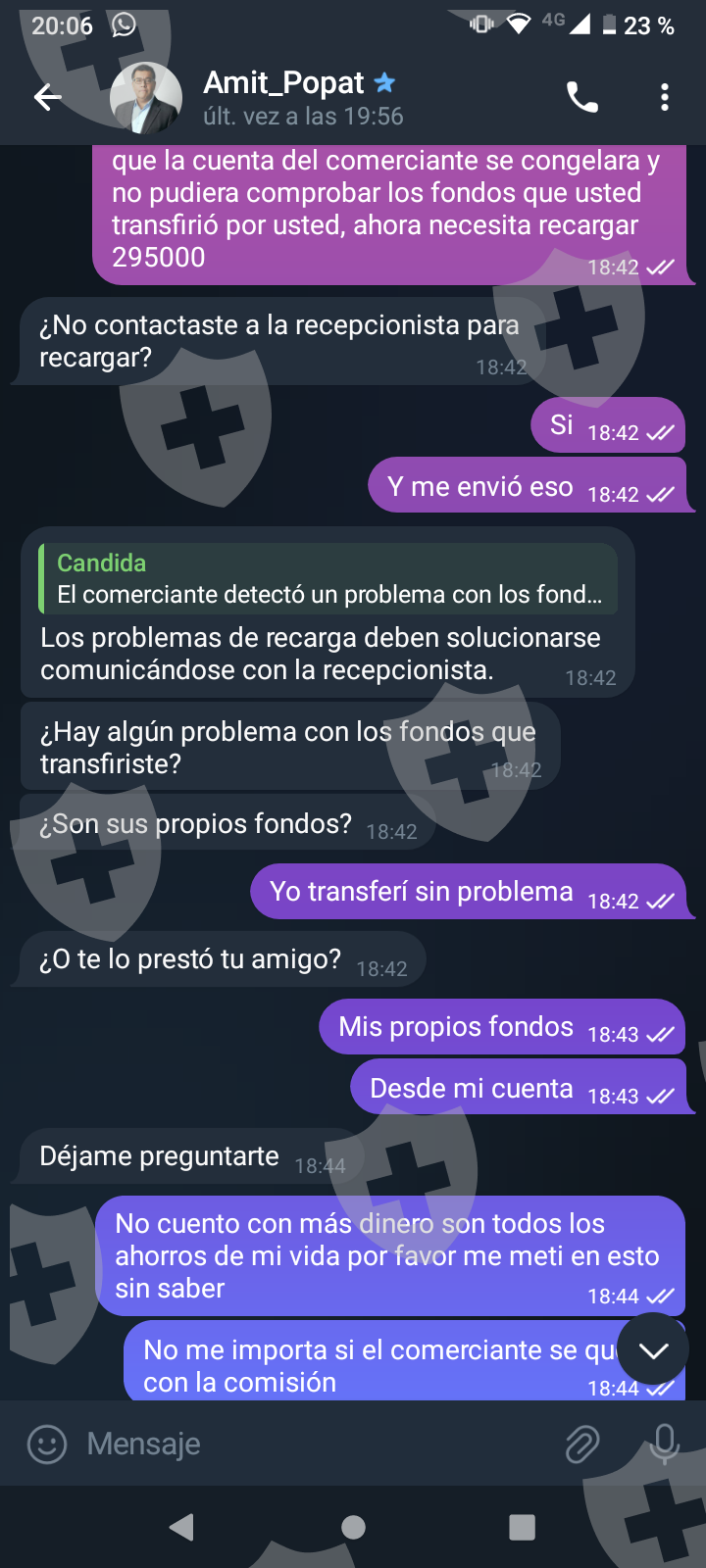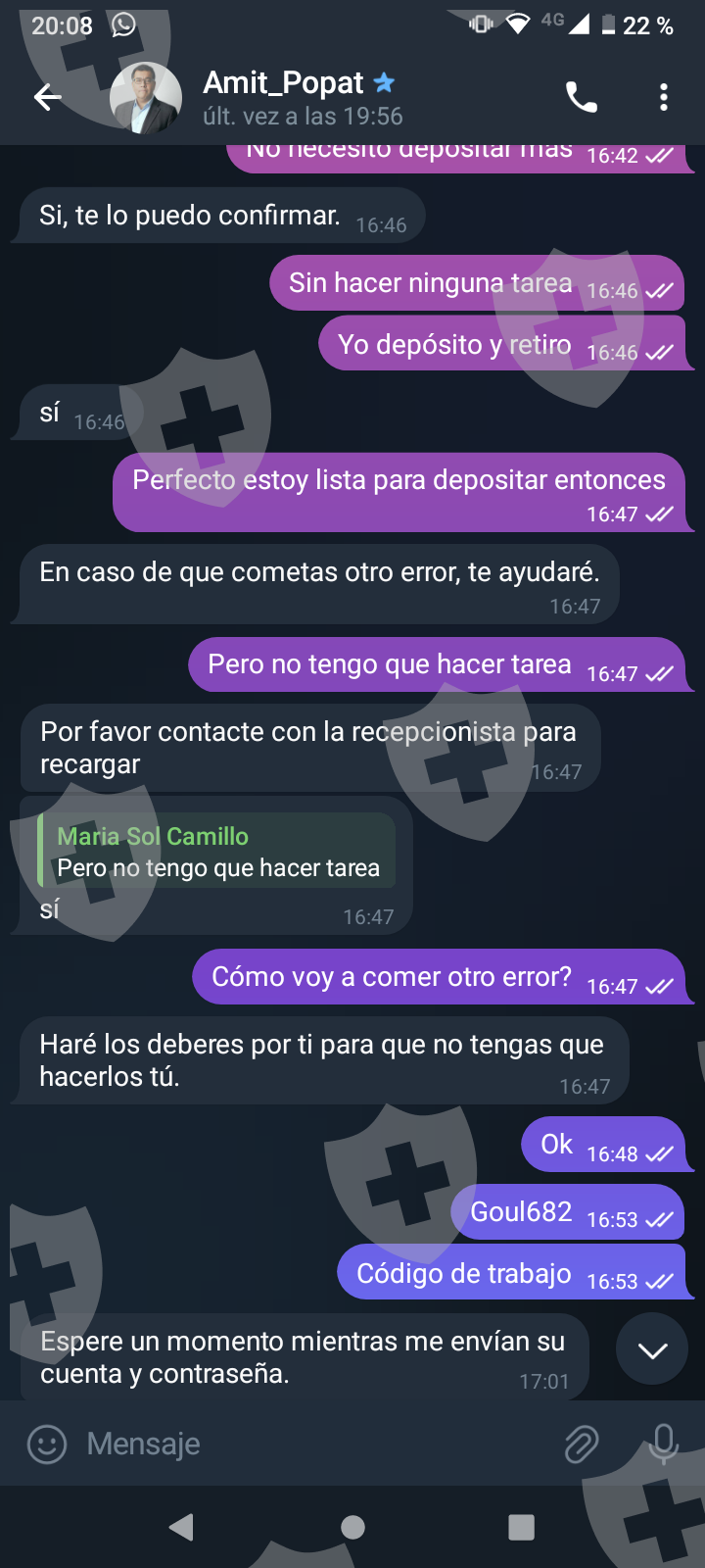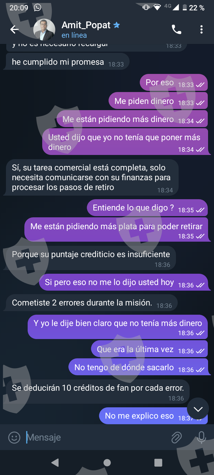 他们首先在 WhatsApp 上与我交谈,然后将我转至 Telegram,并要求我进行少量投资以换取佣金。前两项投资符合要求,并连同佣金一起转让给我。随着金额的增加,他们向我索要的钱越来越多,以便能够完成他们所谓的家庭作业,并能够得到我的钱和佣金。最终这一切都没有发生,他们要求越来越多,投资额或多或少为 1,500 美元。我想至少拿回我投入的钱。