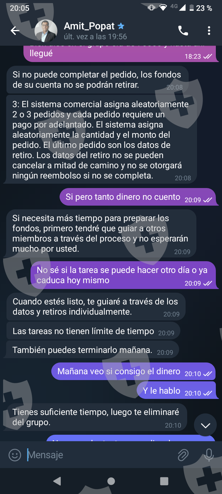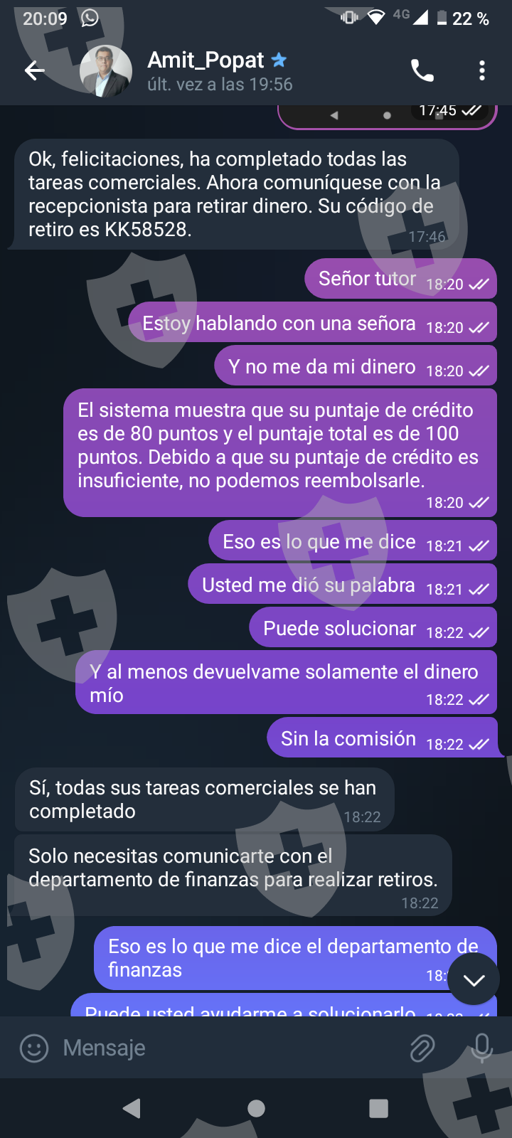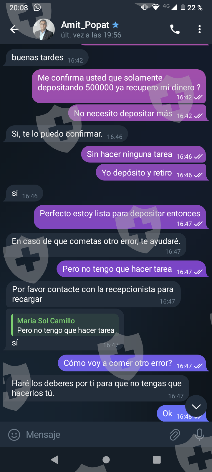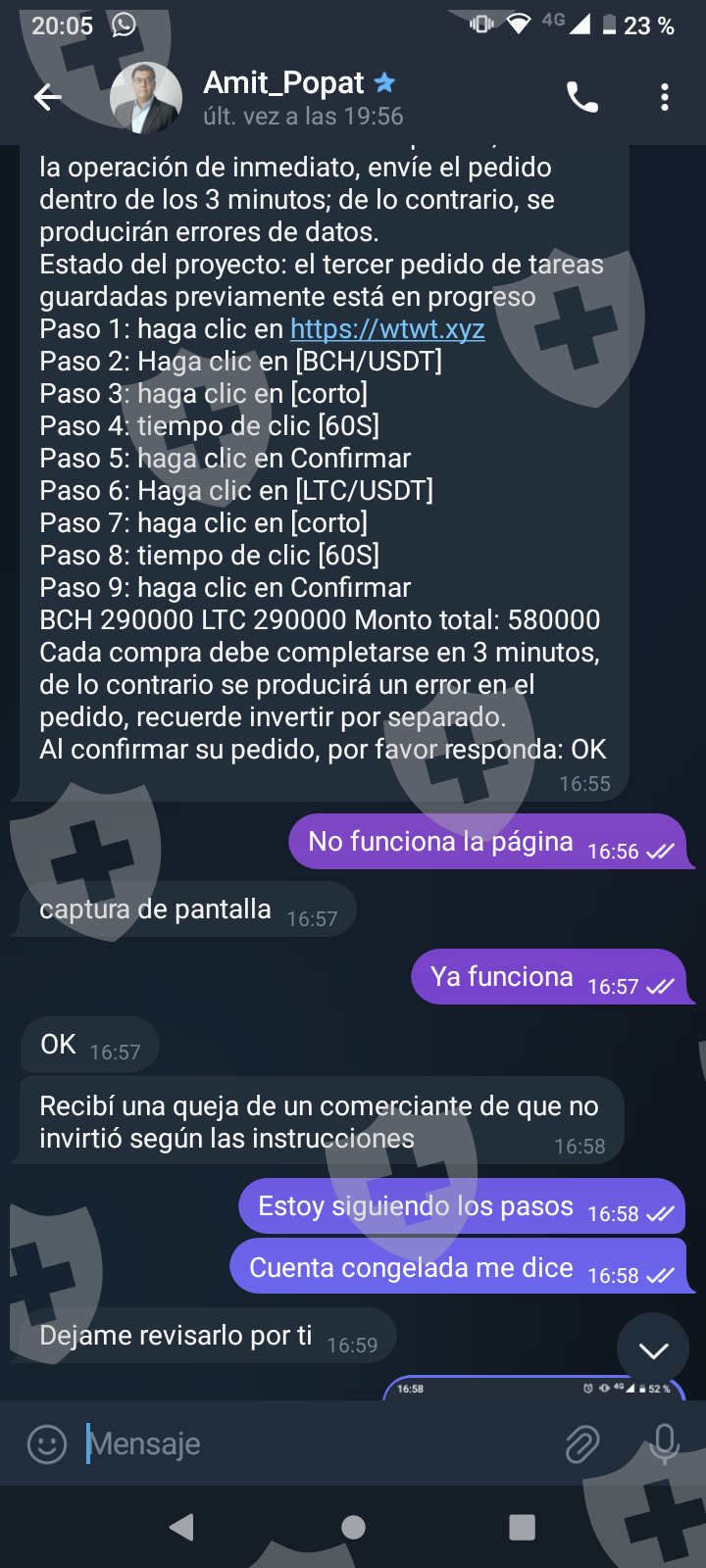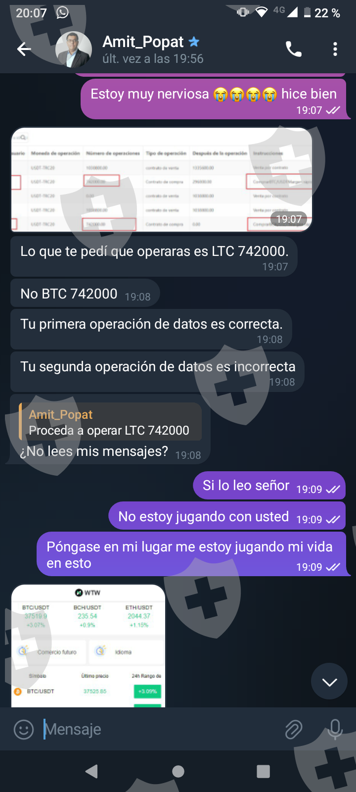 他们首先在 WhatsApp 上与我交谈,然后将我转至 Telegram,并要求我进行少量投资以换取佣金。前两项投资符合要求,并连同佣金一起转让给我。随着金额的增加,他们向我索要的钱越来越多,以便能够完成他们所谓的家庭作业,并能够得到我的钱和佣金。最终这一切都没有发生,他们要求越来越多,投资额或多或少为 1,500 美元。我想至少拿回我投入的钱。