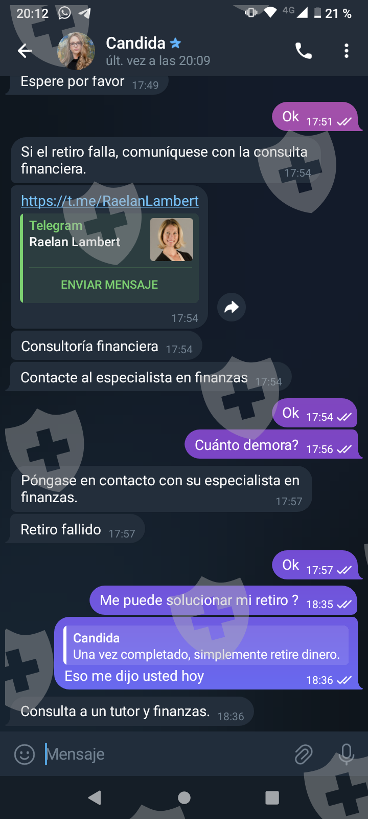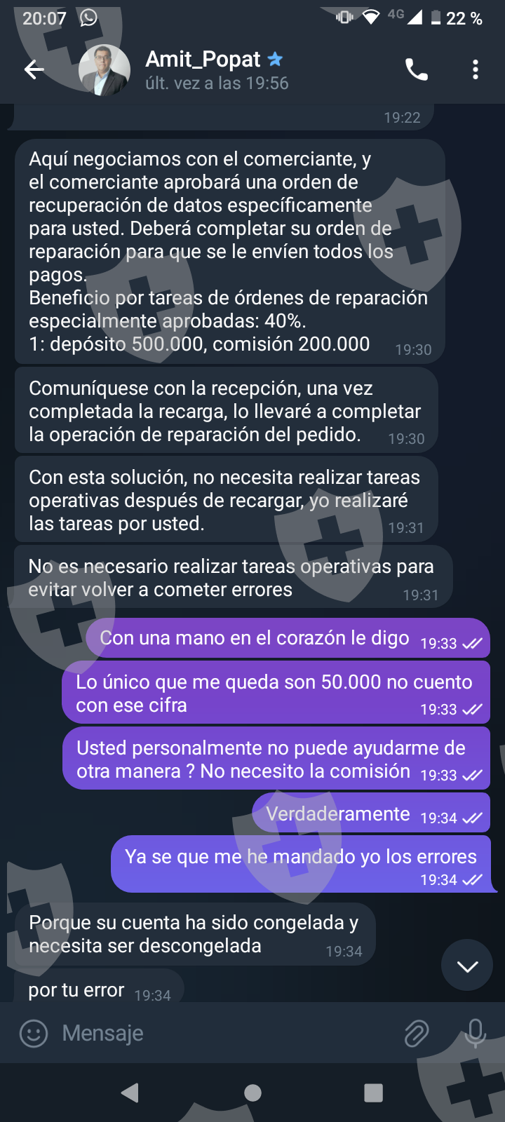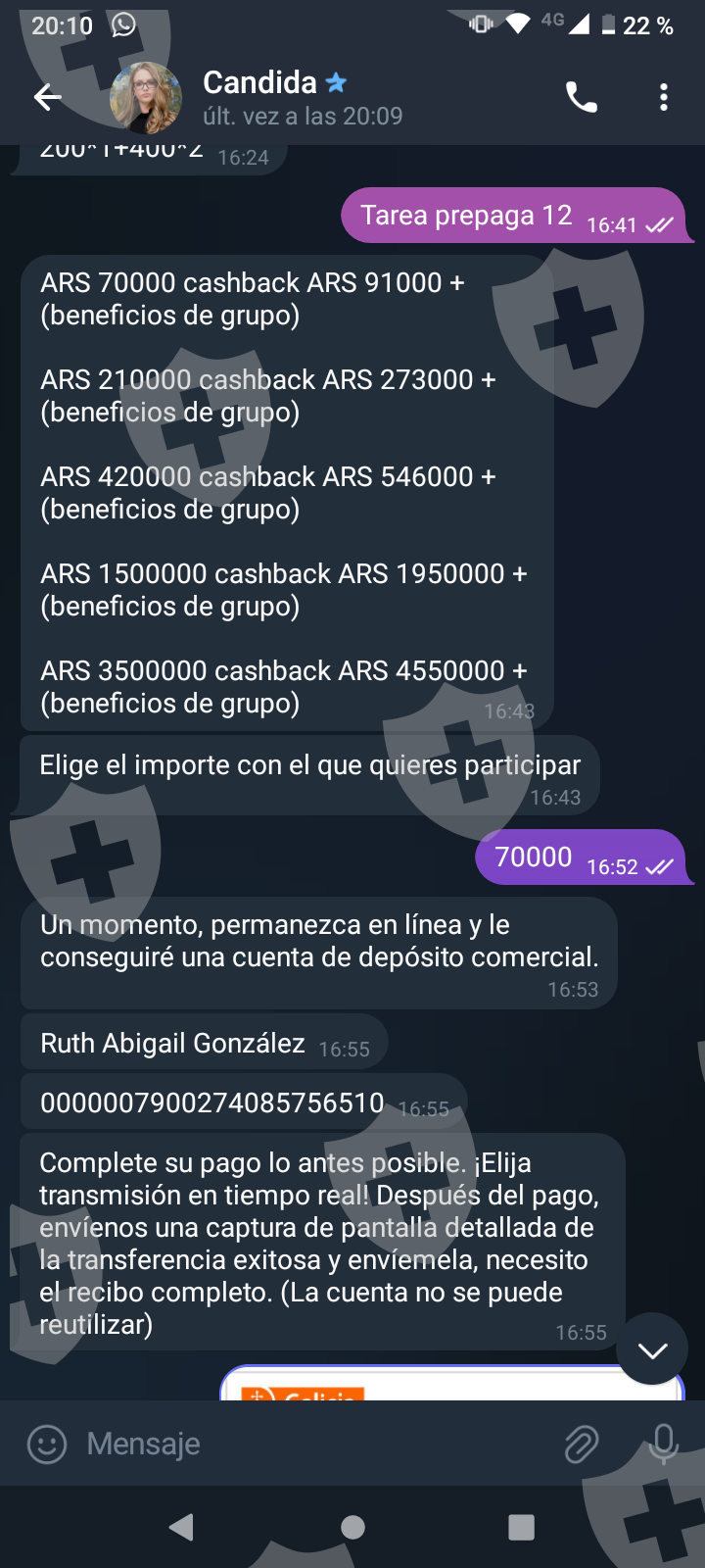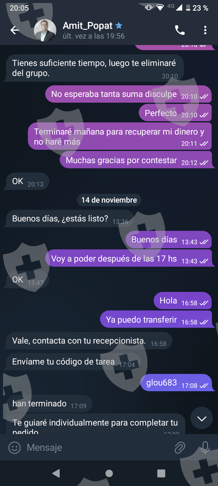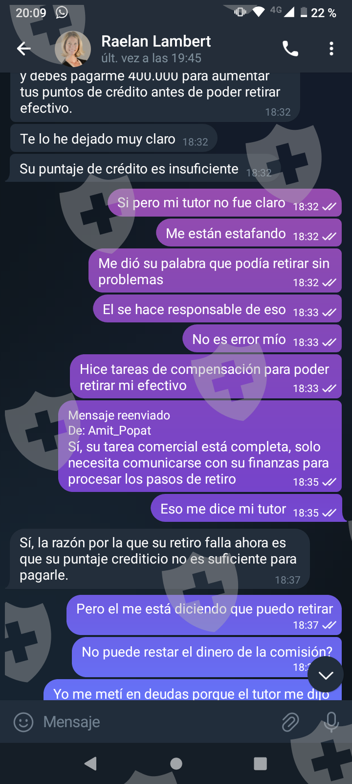 他们首先在 WhatsApp 上与我交谈,然后将我转至 Telegram,并要求我进行少量投资以换取佣金。前两项投资符合要求,并连同佣金一起转让给我。随着金额的增加,他们向我索要的钱越来越多,以便能够完成他们所谓的家庭作业,并能够得到我的钱和佣金。最终这一切都没有发生,他们要求越来越多,投资额或多或少为 1,500 美元。我想至少拿回我投入的钱。
