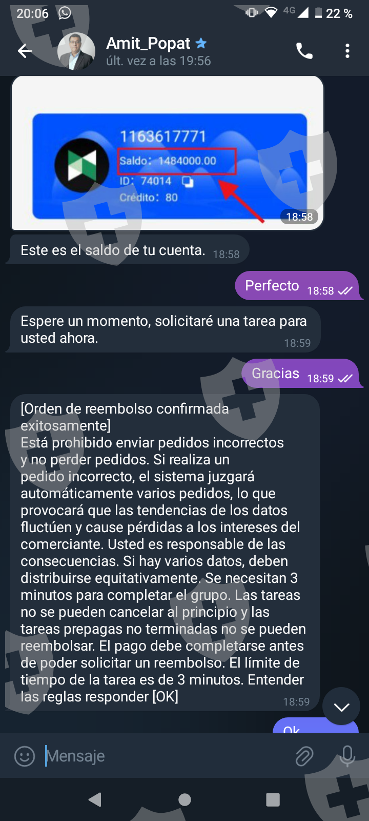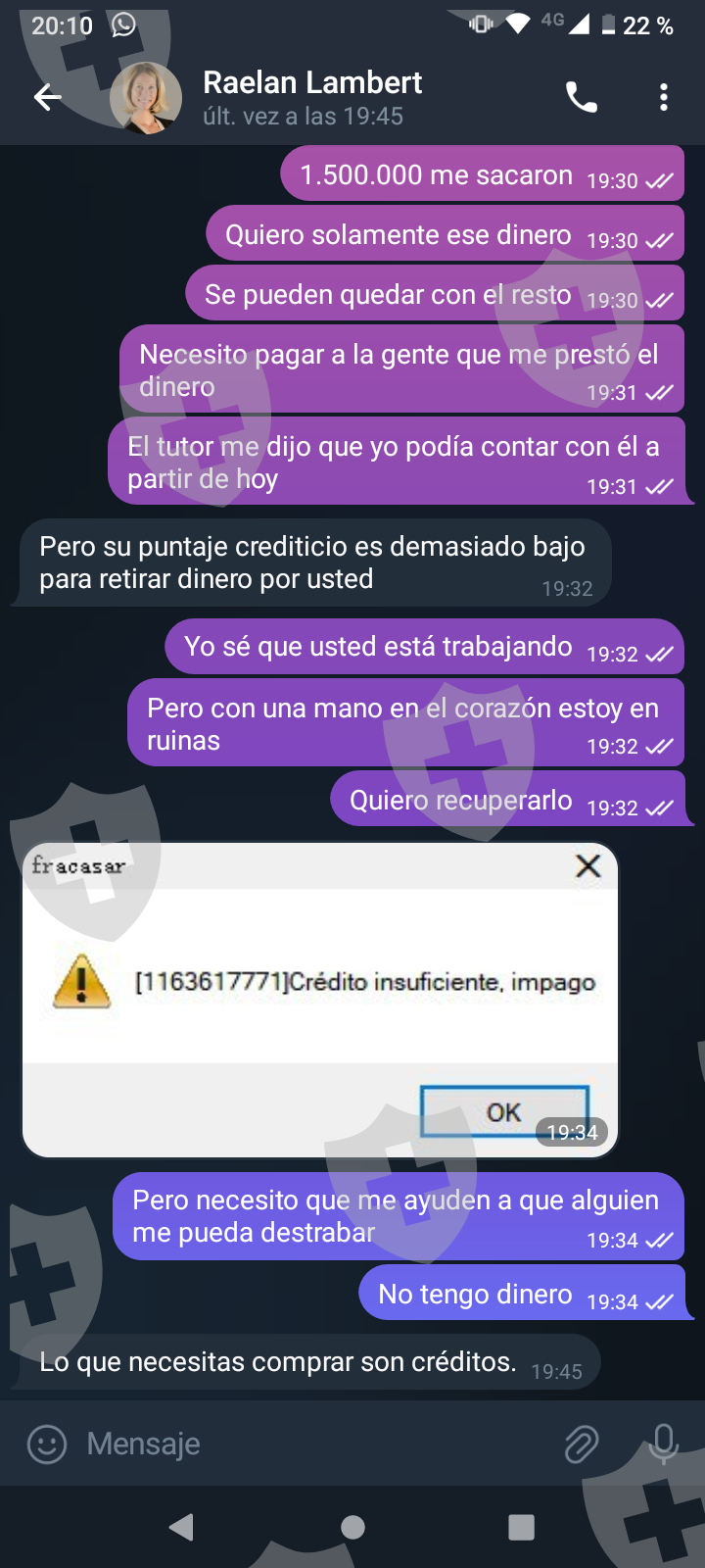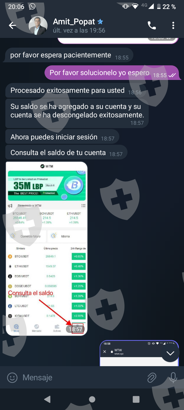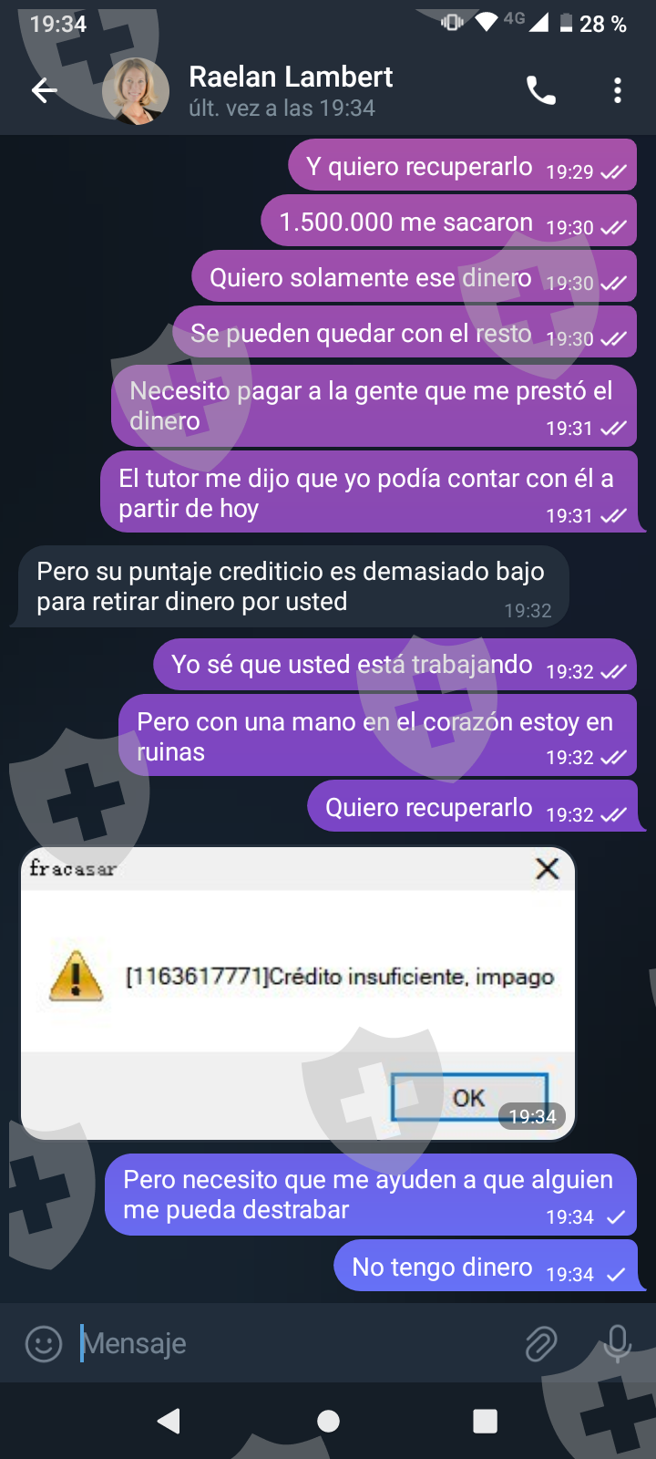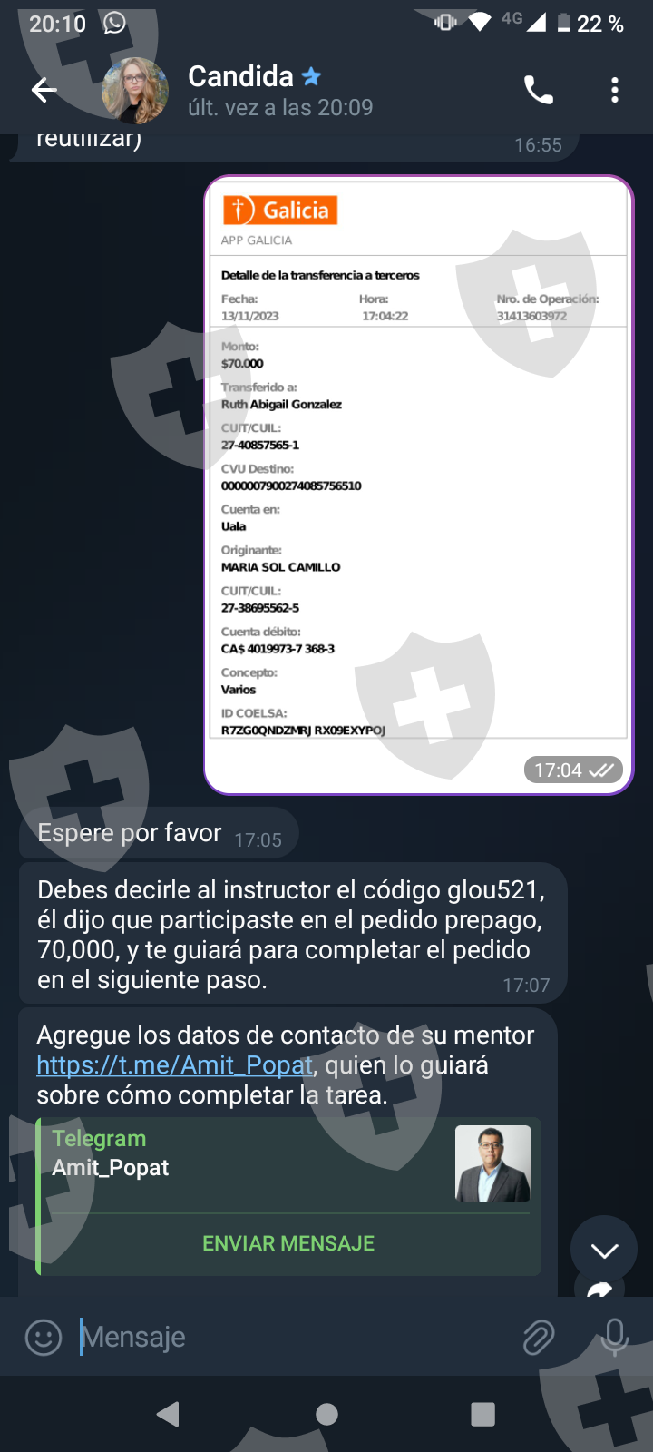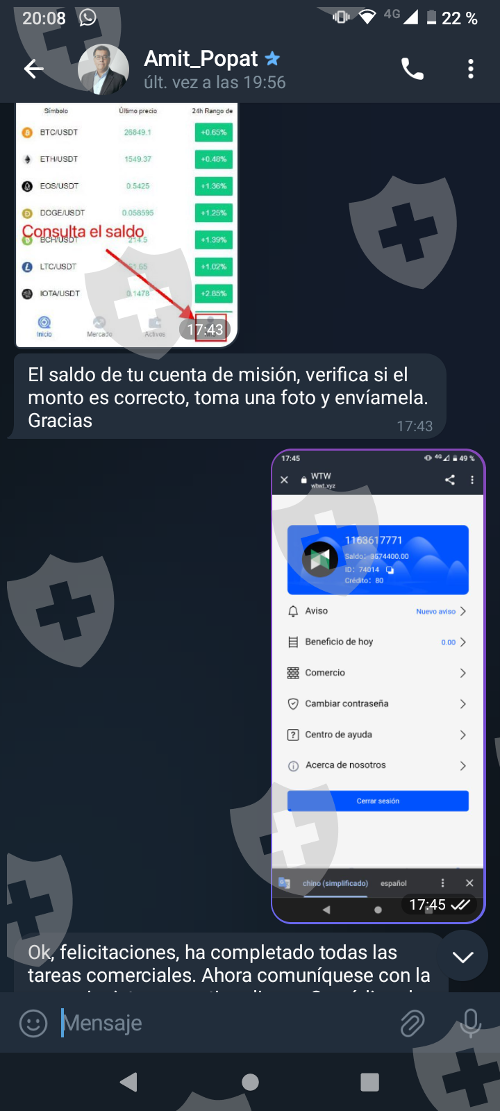 他们首先在 WhatsApp 上与我交谈,然后将我转至 Telegram,并要求我进行少量投资以换取佣金。前两项投资符合要求,并连同佣金一起转让给我。随着金额的增加,他们向我索要的钱越来越多,以便能够完成他们所谓的家庭作业,并能够得到我的钱和佣金。最终这一切都没有发生,他们要求越来越多,投资额或多或少为 1,500 美元。我想至少拿回我投入的钱。
