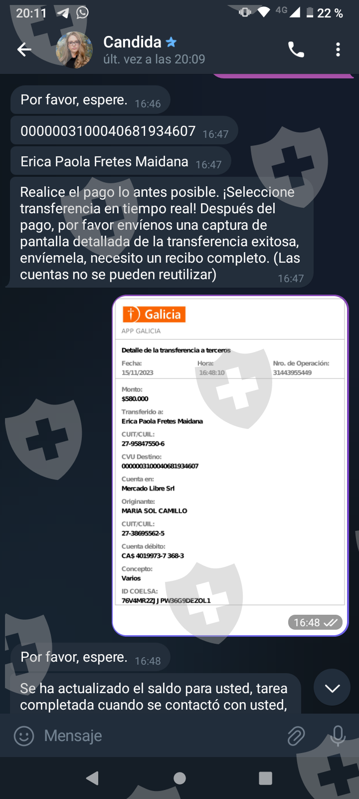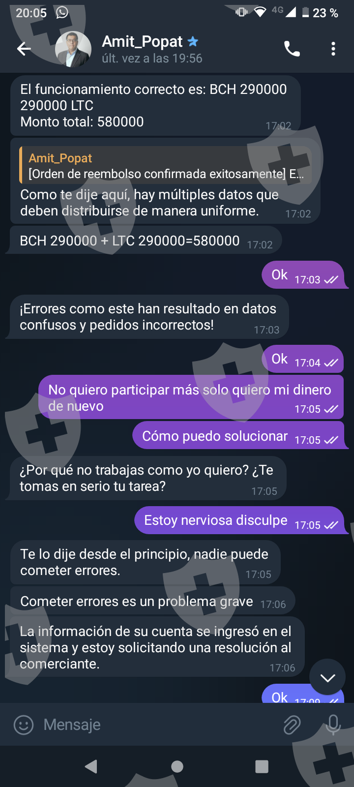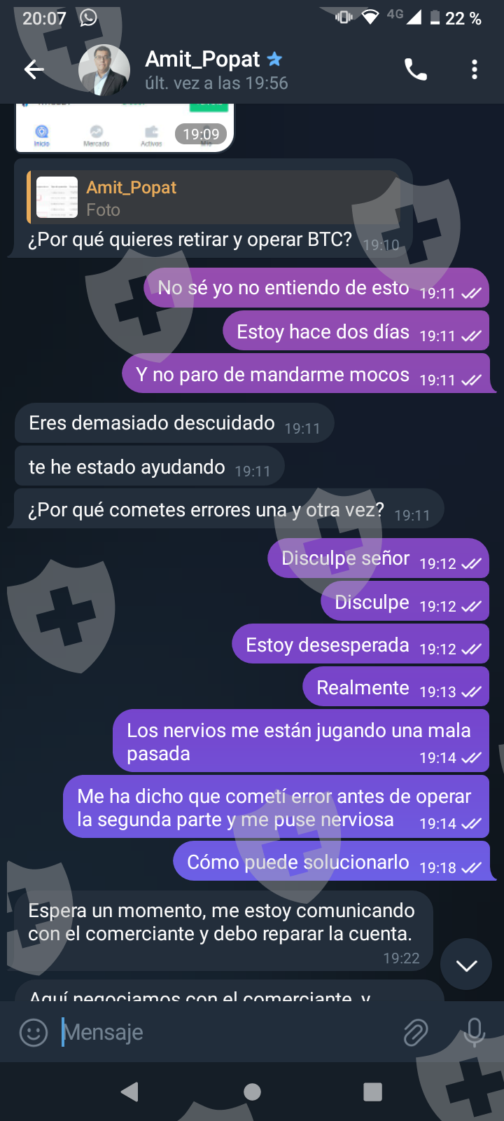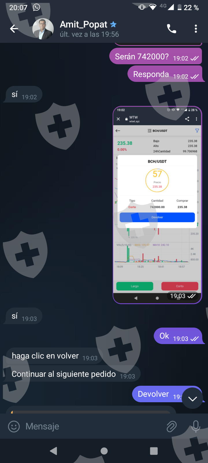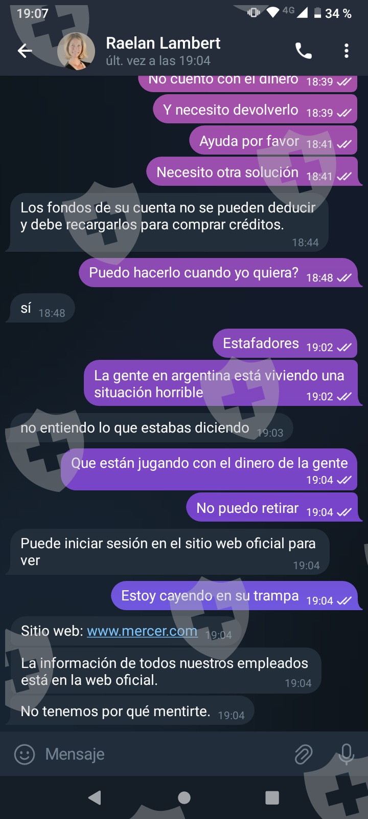 他们首先在 WhatsApp 上与我交谈,然后将我转至 Telegram,并要求我进行少量投资以换取佣金。前两项投资符合要求,并连同佣金一起转让给我。随着金额的增加,他们向我索要的钱越来越多,以便能够完成他们所谓的家庭作业,并能够得到我的钱和佣金。最终这一切都没有发生,他们要求越来越多,投资额或多或少为 1,500 美元。我想至少拿回我投入的钱。