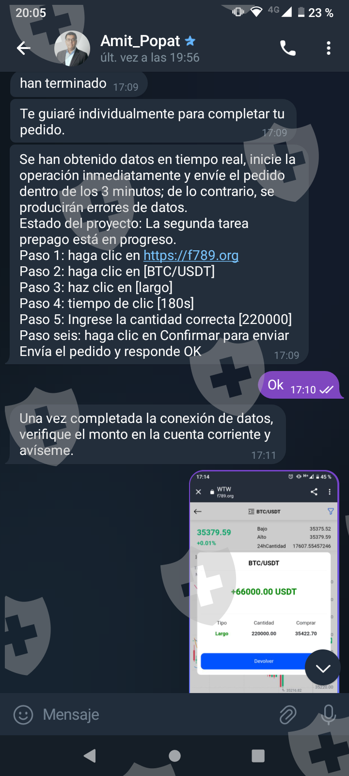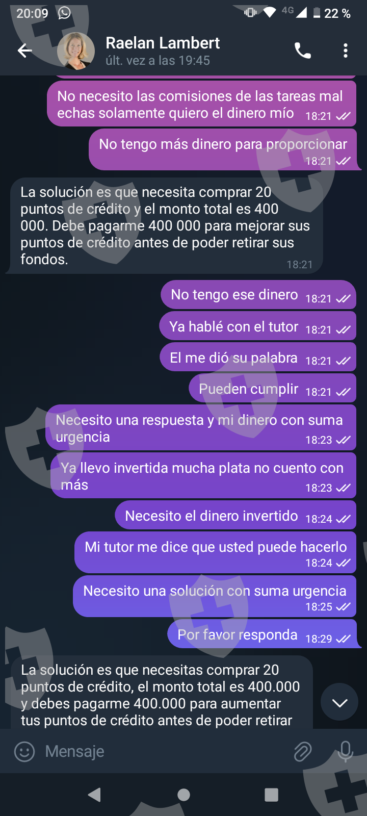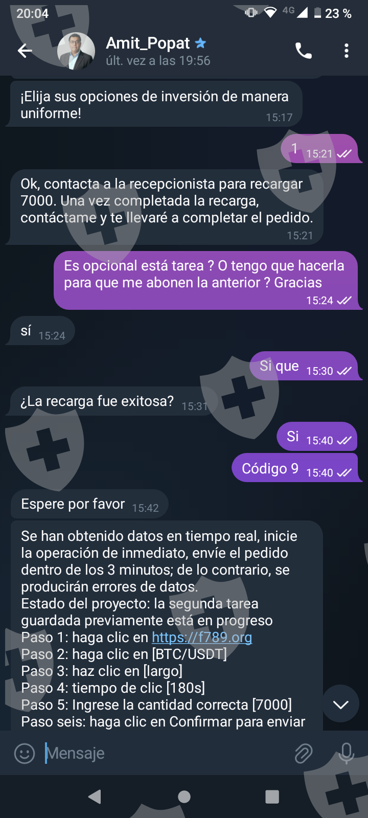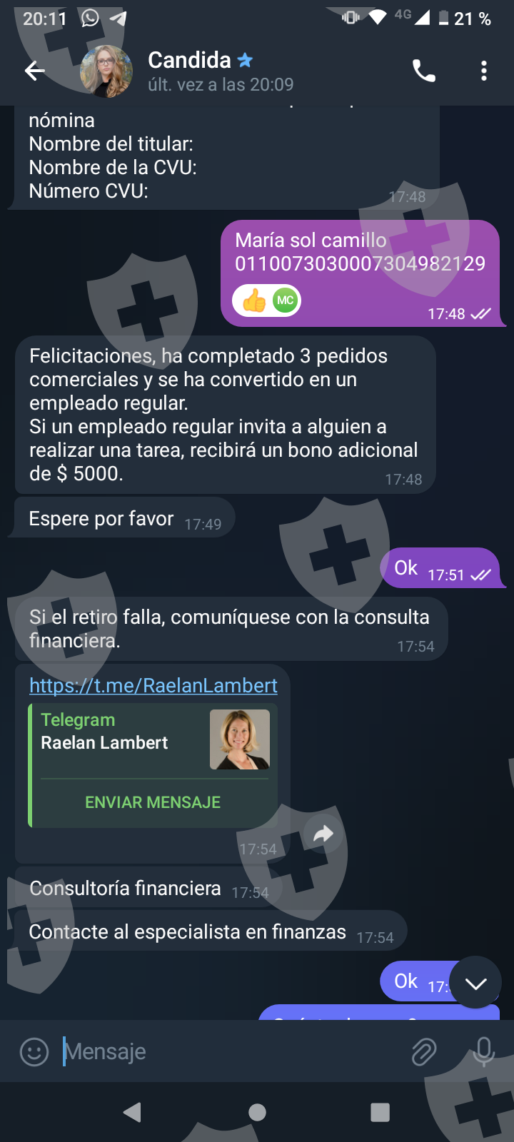 Primero me hablaron por Whatsapp me pasaron a telegram y me pidieron una pequeña inversión a cambio de una comisión. Las dos primeras inversiones cumplieron y me transfirieron con comisión incluida. A medida que el monto crecía me pedían cada vez más para poder terminar lo que llaman tarea y poder tener mi dinero más mi comisión. Al final eso nunca pasó y cada vez piden más y más con una inversión de más o menos 1.500 USD . Quisiera recuperar mi dinero invertido al menos.