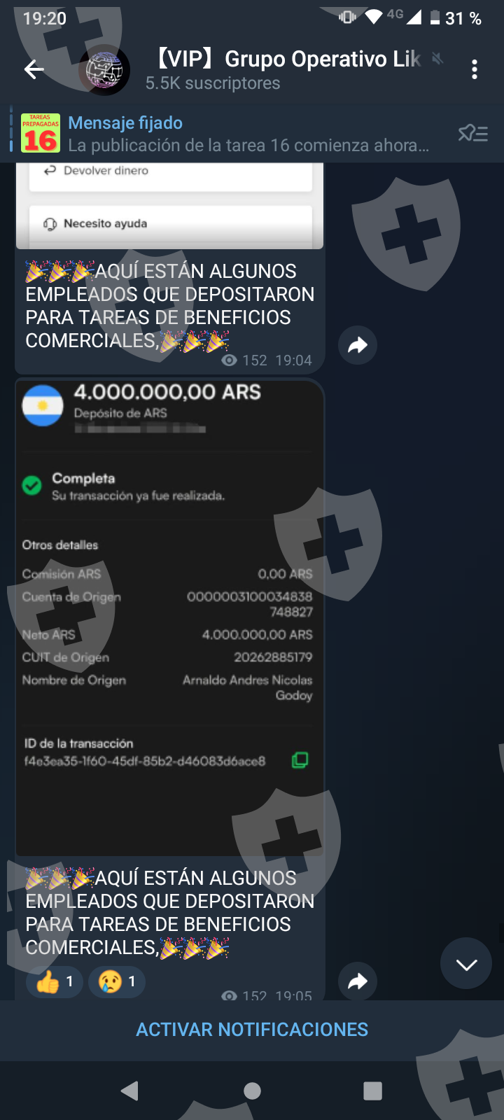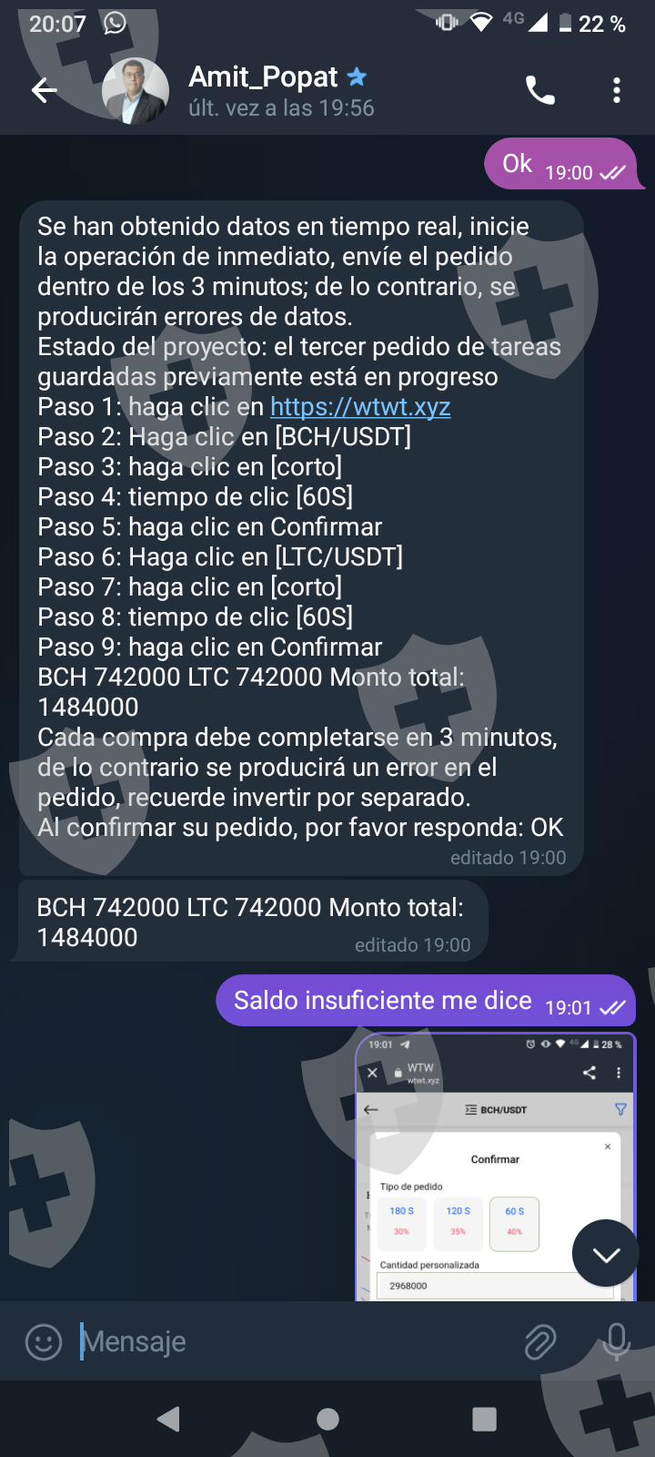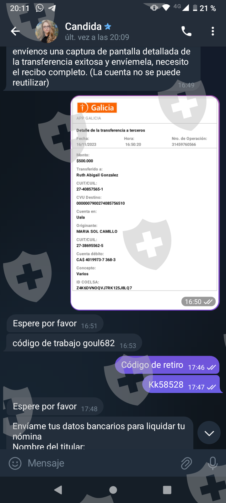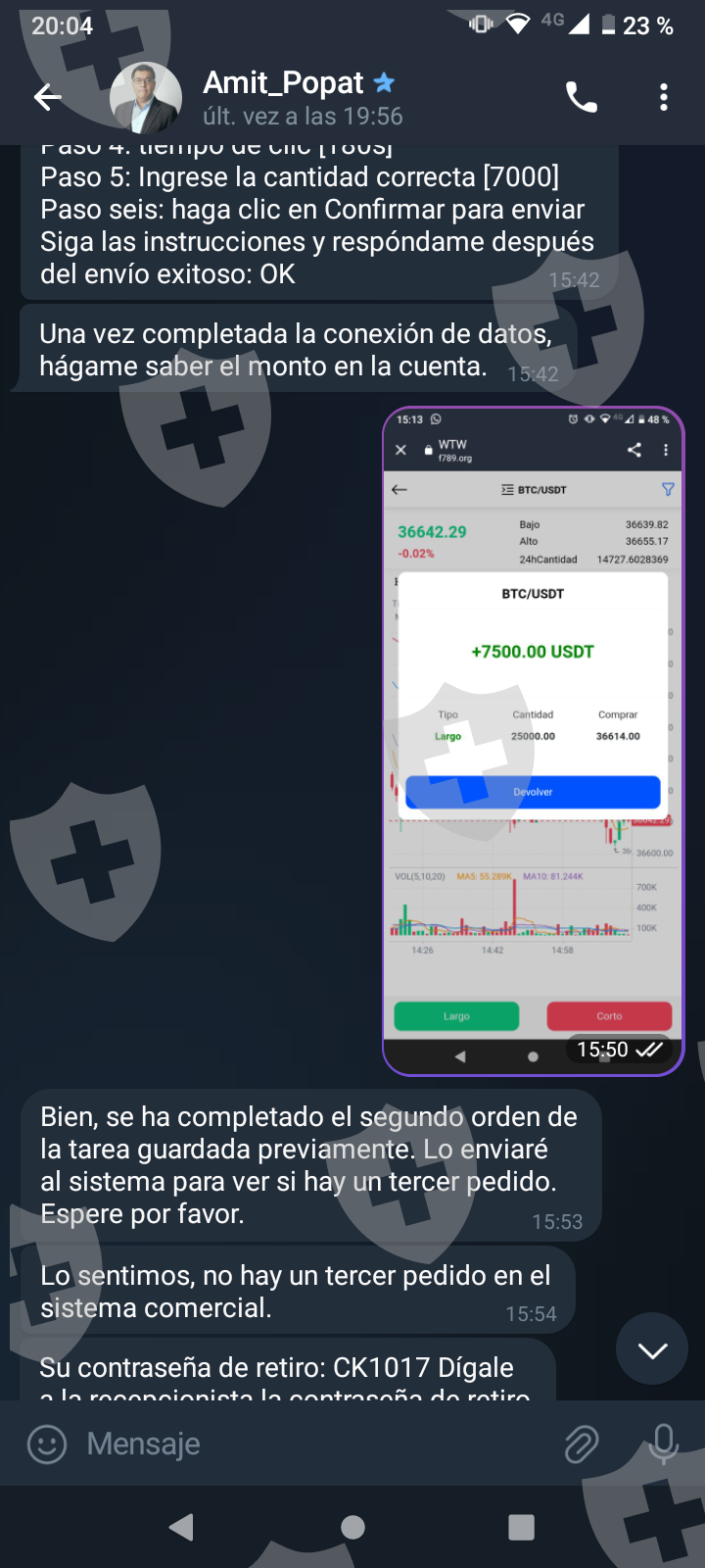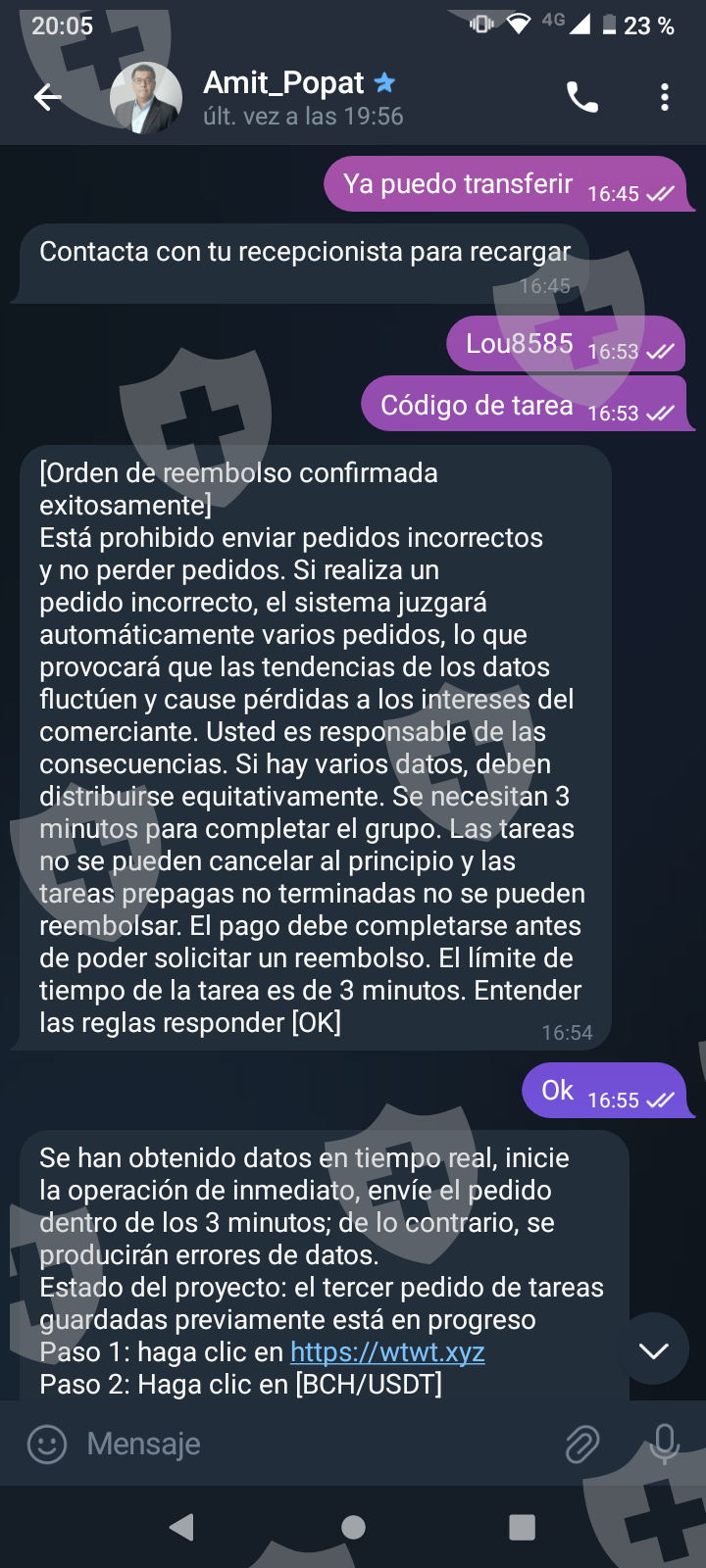 Primero me hablaron por Whatsapp me pasaron a telegram y me pidieron una pequeña inversión a cambio de una comisión. Las dos primeras inversiones cumplieron y me transfirieron con comisión incluida. A medida que el monto crecía me pedían cada vez más para poder terminar lo que llaman tarea y poder tener mi dinero más mi comisión. Al final eso nunca pasó y cada vez piden más y más con una inversión de más o menos 1.500 USD . Quisiera recuperar mi dinero invertido al menos.
