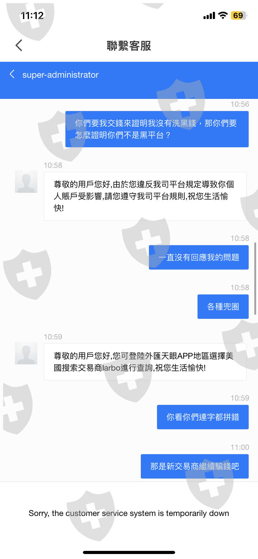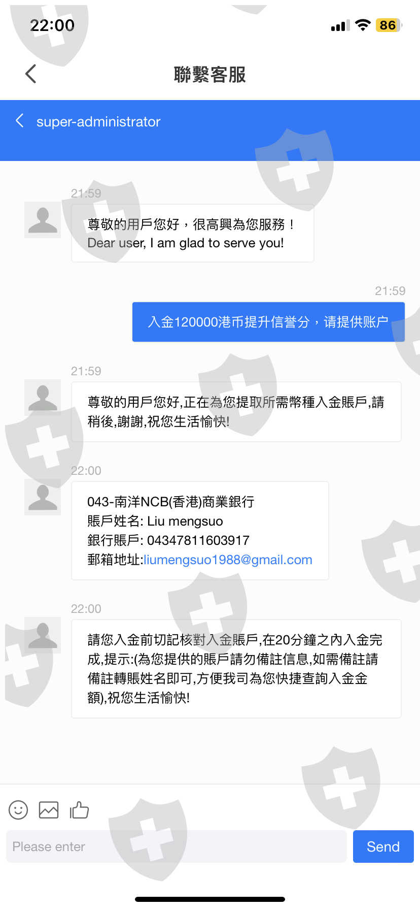 在香港區App Store下載Soontrade5(此app已在香港下架),一開始使用交易商Gomax(這交易商消失了),後來被要求轉用交易商Larbor。第一次能正常入錢交易出金。參加10萬美元新人活動客服不讓取消;完成新人活動後客服才說不能他人代入金;獨自完成10萬美元入金後客服又說逾期完成要再入10萬美元提升信譽分;完成提升信譽分後客服又說帳戶裡面的是黑錢要我再入9萬美元風險預留金來表示清白。整個過程客服都沒有提供任何條款及細則,一切都是事後客服說了算,期間不斷威脅若不完成就是違法違規要處罰。最後因資金不足沒有交保證金,也沒有遇到任何客服聲稱會發生的後果。入帳帳戶都是中國人開的私人帳戶,向香港有關部門查詢過,說是影子帳戶,是用來非法騙取財產及洗黑錢的帳戶。