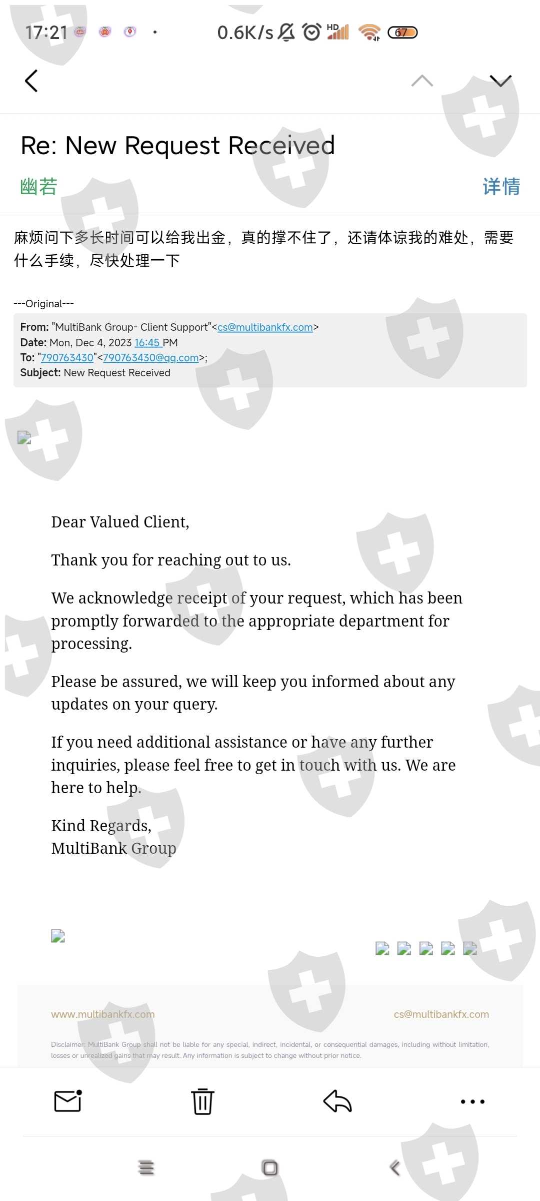 2021年10月开始出不了金,至今已两年时间,在此期间无法出金入金,无人对接出金事宜,发邮件只是回复搪塞,就是不处理,资金由1万美金亏损只剩3000美金。本人由于负债压力巨大,身心焦瘁,身体出现严重问题,心脏要做手术,最后的3000美金还希望给予出金,付医疗费!