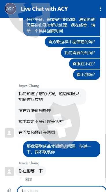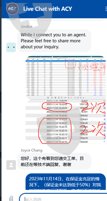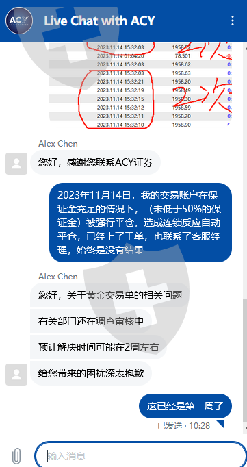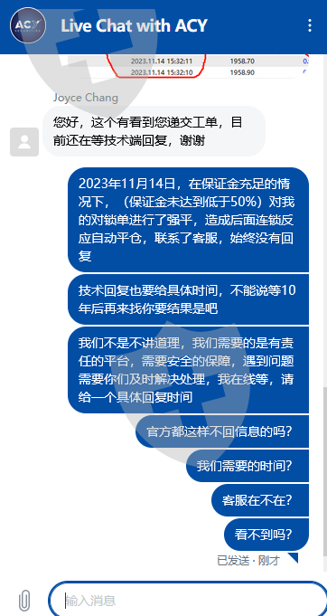 2023年11月14日,本人所在ACY稀万国际MT5账户上对锁单后剩余可用金额2100美元元左右,可用保证金1500美元左右,在11月14日(北京时间9.30分、澳大利亚时间15.30:0.1)一秒钟系统后台恶意平仓6单后带来连锁平仓,最后造成爆仓,造成7000美金经济损失,和ACY客户经理沟通,听到时出问题,就回复之前的人离职了,我尝试联系,不回信息,骂他祖宗回复没有看到信息。现在对接新的客户经理,几个联系人为同一个人方式拖延时间欺骗客户!和ACY稀万平台联系需要2周时间,平台客服也是言而无信,拖着不办原来是公司举办13周年庆,担心影响到他们举办庆祝,现在平台始终回复请耐心等待,没有时间,今天拖明天,明天拖后天,对这种厚颜无耻的欺骗行为需要及时曝光,不要让后来者再受骗,平台卡顿、卡点都忍了,现在直接平仓,让你血本无归!