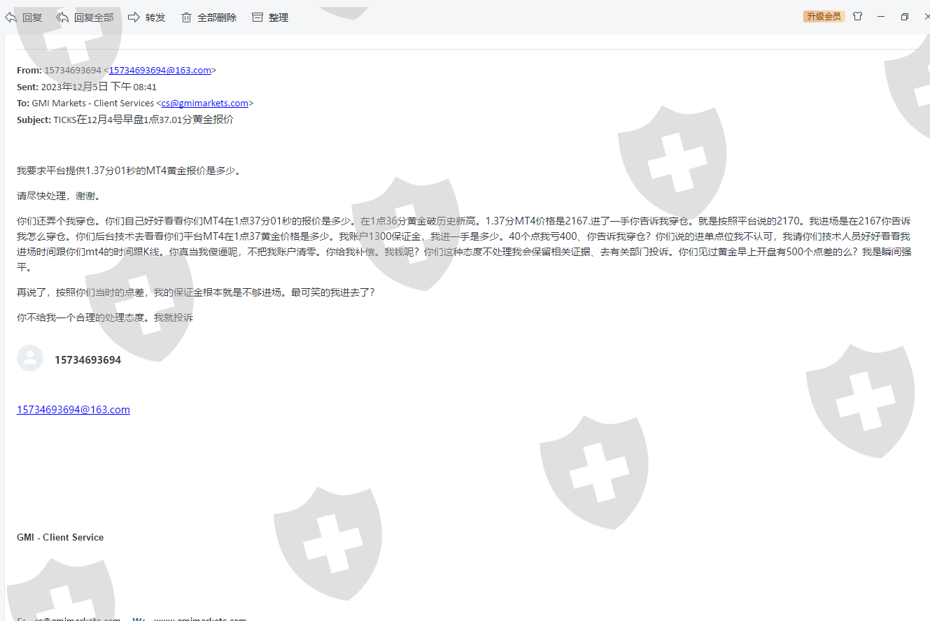 交易账户311435服务器04目前诉求如下 1 本人王迪在黄金价格2168进单MT4时间是1点37分01当时因为报价错误拉大点差导致爆仓强平。如果按当时的巨大点差本人账户我资金是不够进场建仓的.而不是进场之后扩大。导致我不到1秒爆仓9392美金2 就是在MT4上看K线图看,GMI MT4也是在1点36分黄金价格就上到2168了.而我是在1点37分01秒建仓进单正常价格应该是在2166.可在之后爆仓的账户看我的进单点位确实在2121.当时MT4 1点37分01秒就没有这个价格,{下面我会把进单时间记录还有当时的MT4K线图附上,请平台做出合理不补偿。如果当时平台正常不是拉大点差,我在2166建仓1点37分进场我的交易账户是不会爆仓因为1点36是高点。2166进场一手的利润不用我说平台可以自己去拉K线自己看]3 我的诉求很简单,不说如果不是因为平台报价出现问题导致我进单是在2121进场,我的利润是多少。简单说就是请平台按照1点37分01秒的K线去给我结算 .当时MT4正常报价.如果不是报价有问题平台强制平仓价格在2215.我进场是在2166。还有就是平台穿仓导致我账户直接负9392美金。我现在没其他要求就是想把我亏损的资金补偿给我,前提是账户先给我清零. 不管是在2167或者2121 公司给出的扩大点差是300 在怎么样 我都不会穿仓而当时扩大点差情况 按照道理你是无法进场1手的 保证金不足怎么会让你进场后 进去出来不到1秒钟亏损9000多美金?行情会扩大点差能理解 但擴大至2215属实已经太离谱了 我本金1300美金 在怎么扩大 都应该强平后 保有馀额! 请恢复馀额请恢复补偿 先清零我的帐户 并且恢复我强平后的馀额我对于GMI 10几年的公司 还是保有信任 并且想持续在入金交易本人已在平台亏损1万多美金了,请尽快清零我的帐户 并且完成补偿