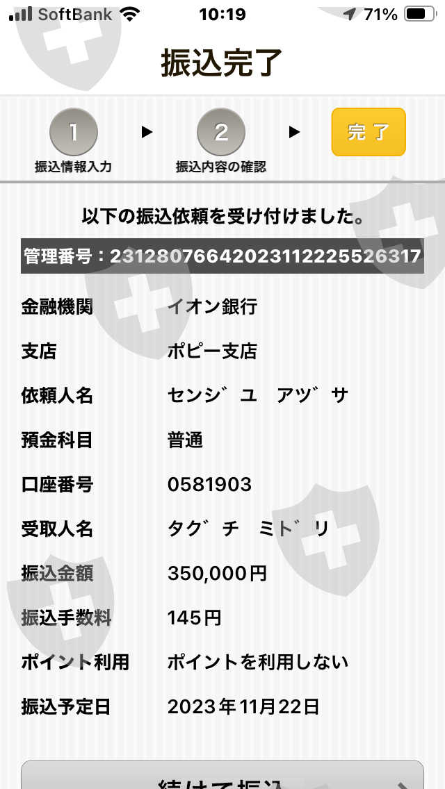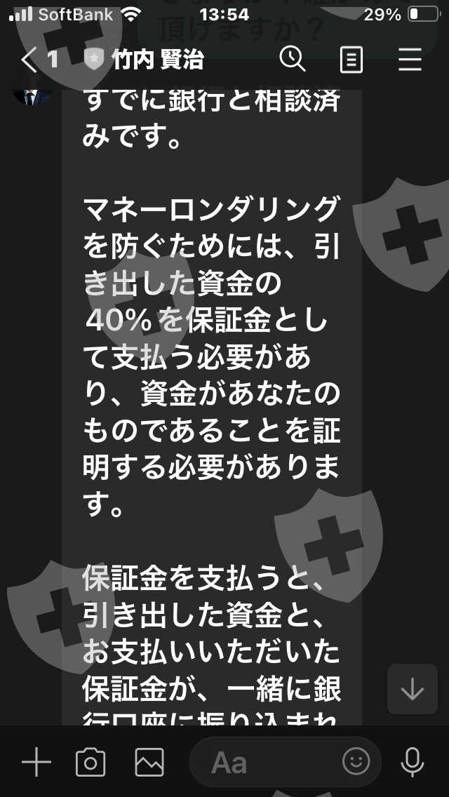 AMERIPriseに騙されて、途方に暮れる私に2週間で損失は取り戻せるので竹内賢治に任せてくださいと言われ、以前スムーズに出金してくれたら竹内さんの指示で、トミナガヤスヒロの口座に40万円を振り込み彼がAIでFXを始め最初はロット数も少なかったけど、いきなりロットが増え彼からミスをしたので自分の給料から立て替えてするからと言わ彼が再開しましたが想定以上の進み方で11月20日には¥9868.68になり、かねてから仕事で必要なので出金したいと申し出ると自分が立て替えた金を返金したら出金出来ると言われ不本意でしたが、35万円を竹内の口座ではなくタグチミドリと言う女性の口座に振り込みしゅっきんを願い出ると、今度は取引銀行(三菱UFJ銀行、三井住友銀行、みぞえ銀行)3社からマネーロンダリングと脱税の調査で監査が入るので儲けの40%を振り込まなければいけない。その金額を振り込んだら出資金、儲けと一緒に全額を出金出来ると何度もLINEにメールがあり期日が12月5日までとしながら今も催促が続いています