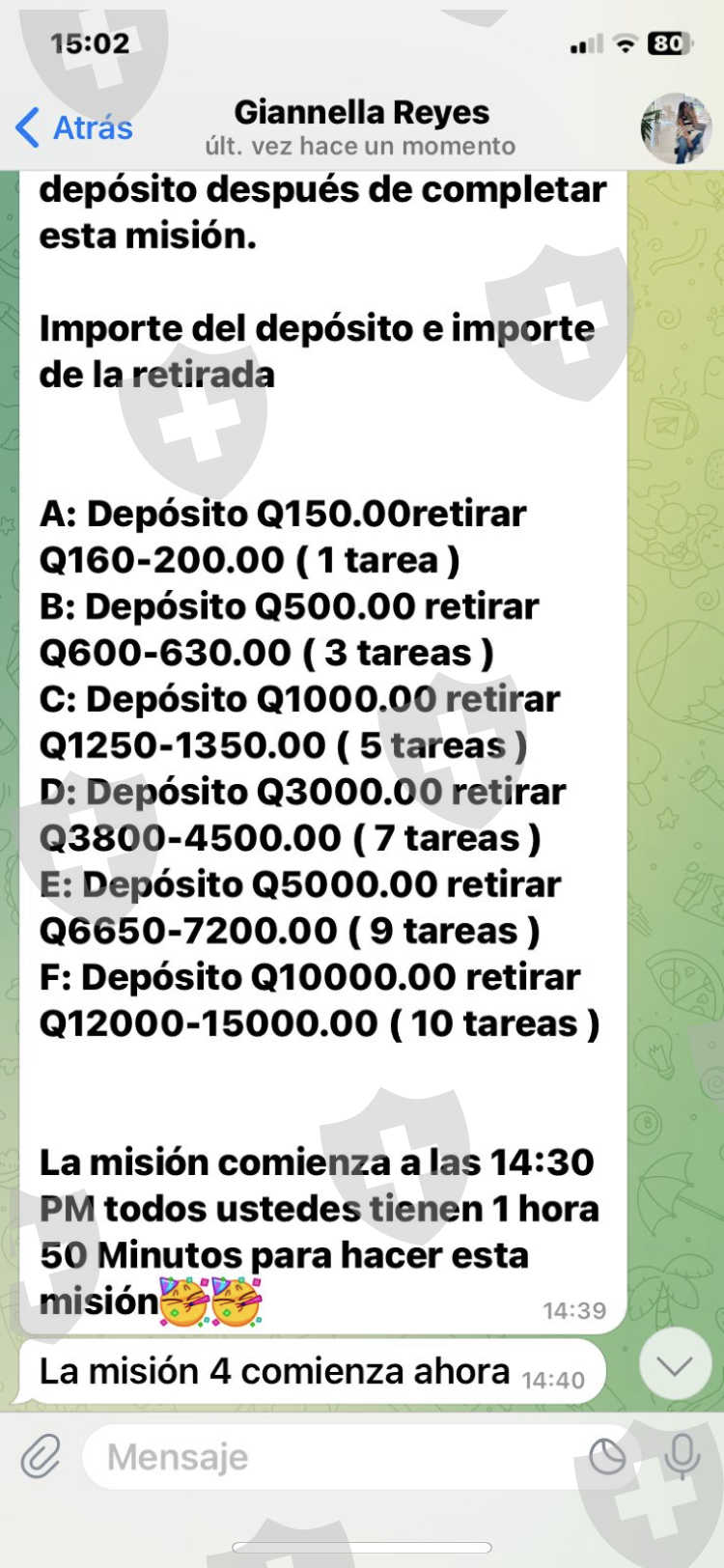 首先,我想解释一下按发生的事情顺序排列的图像,基本上是在一个电报组中,他们为我提供了这份工作,我接受了它,我们必须做任务,所以我开始做任务,但在最后一个我必须进行转账,以便他们再次偿还我赚到的钱以及我转账的钱,然后我们都必须发送我们转账的金额,以便他们给我们相应数量的任务和其他任务正在发送他们的结果,我转移了,在最后一张图片中,这是我的帐户,它位于该页面上,我不知道其名称,因为该公司名为“EQUIPO AVENIDA GT”,他们给了我指向该页面的链接钱必须走,我创建了我的帐户,在这里我正在完成任务,最后,我偶然得到一个“特殊”任务,我必须完成它才能提取我所有的钱,但它是通过存入 Q6,167 所以他们给我双倍的利润。 “我不想存那么多钱,因为那是很多钱,我害怕损失更多,直到现在我都无法收回这笔钱,无论如何我都必须存起来,”女人说,“另一件事”就是现在不是Q6,167,现在是Q4,167 女的说我降价是因为她要帮我取钱。他每天都试图提醒我,我必须存款才能取款,尽管我告诉他我没有钱这样做,而且我也害怕这样做。我需要你的帮助才能收回那些 Q500,我不想要利润或任何东西,我只需要我存入的钱,因为我真的需要它。