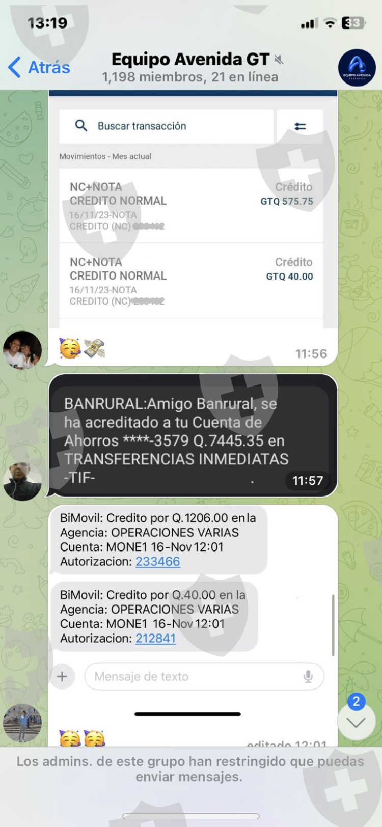 Primero que nada quiero explicar las imágenes que están en orden de lo qué pasó, básicamente en un grupo de telegram me ofrecieron este trabajo y lo acepté y teníamos que hacer tareas, entonces comencé a hacer las tareas pero en la última tenía que hacer una transferencia para que me reembolsen de nuevo el dinero ganado junto con el dinero que transferí, y entonces luego todos teníamos que enviar cuanto transferimos para q nos den ese número de tareas correspondientes y los demás estaban mandando sus resultados y yo transferí, en la última imagen está mi cuenta y está en esa página que desconozco de su nombre porque la empresa se llama “EQUIPO AVENIDA GT” y me pasaron el link de esa página en dónde tenía que llegar mi dinero y cree mi cuenta y ajá estuve completando las tareas y en la última de casualidad me sale una tarea “especial” en donde tengo q completarla para retirar todo mi dinero pero es depositando Q6,167 para que me den el doble de la ganancia. Yo no quiero depositar esa cantidad porque es muchísimo dinero y tengo miedo de perder más, hasta ahora no he podido recuperar ese dinero y tengo q depositar sí o sí dice la mujer, otra cosa es que ahora no son Q6,167 ahora es Q4,167 la mujer dice q le bajo el precio porque me quiere ayudar a retirar mi dinero. Todos los días intenta recordarme que tengo q depositar para poder retirar aunque le he dicho que no tengo el dinero para hacerlo y además me da miedo de hacerlo. Necesito su ayuda para poder recuperar esos Q500 no quiero ganancias ni nada, sólo necesito el dinero que deposite porque en verdad lo necesito.
