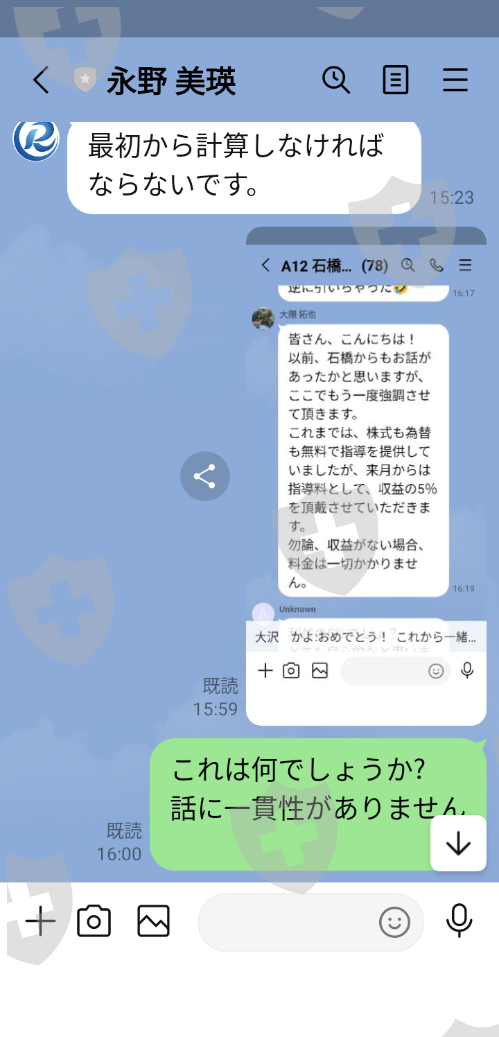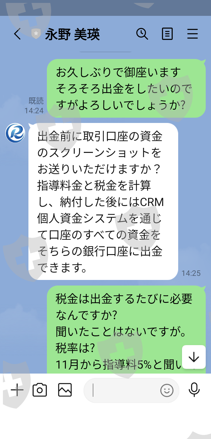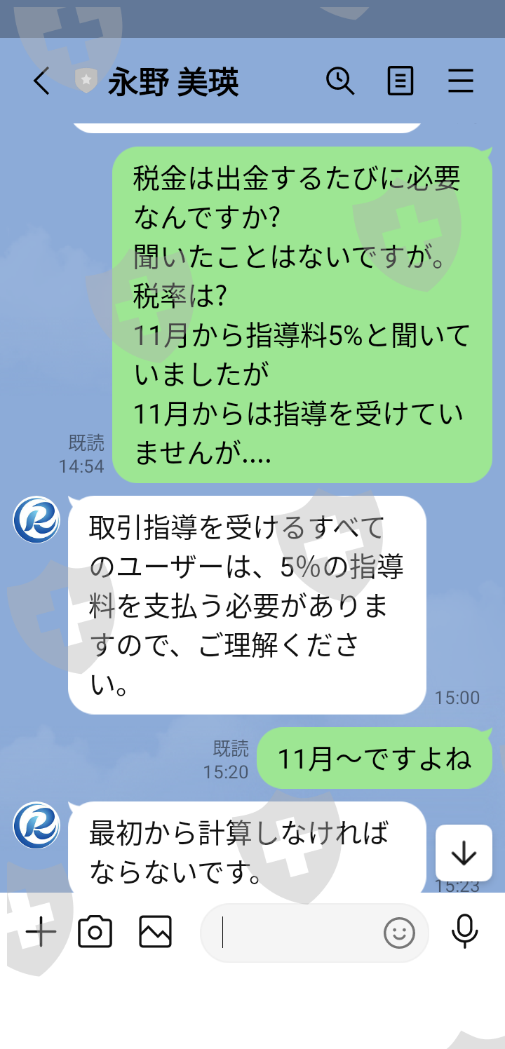 这是我第二次无法提取账户中剩余的约10,600美元。第一次是在11月9日,当时我被告知系统不批准提款。原因似乎是我大约10天没有登录或进行任何交易。当我问我该怎么办时,我被告知只要我连续15天登录并进行交易就可以了。从第二天到12月10日,我每天都登录并自行交易,没有任何指导。现在情况应该很清楚了。我再次要求提款。这次他们要求我交税费。当我问我每次提款是否都要缴税,税率是多少时,这个问题就消失了,我被告知除非我支付5%的学费,否则我不能来上班,他们不会不用办理手续。我被告知我将获得利润的5%。然而,我被告知我不能教书,因为我的账户余额很低。当时,我的账户里大约有 10,900 美元。指导我的石桥先生让我在账户余额达到 20,000 美元时联系他。换句话说,我被要求缴纳额外的押金。我没有那么多钱,所以我不能存款。我放弃了指示并完成了提款程序。这家公司所说的每一次都在变化。我认为他们不想提款。顺便说一句,我被告知5%的指令费是总资产的5%,而不是利润的5%。
