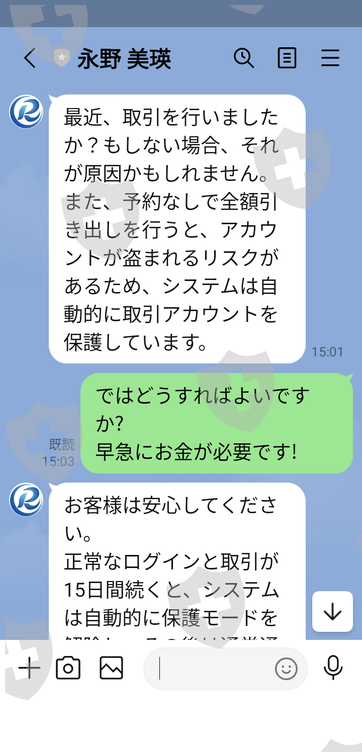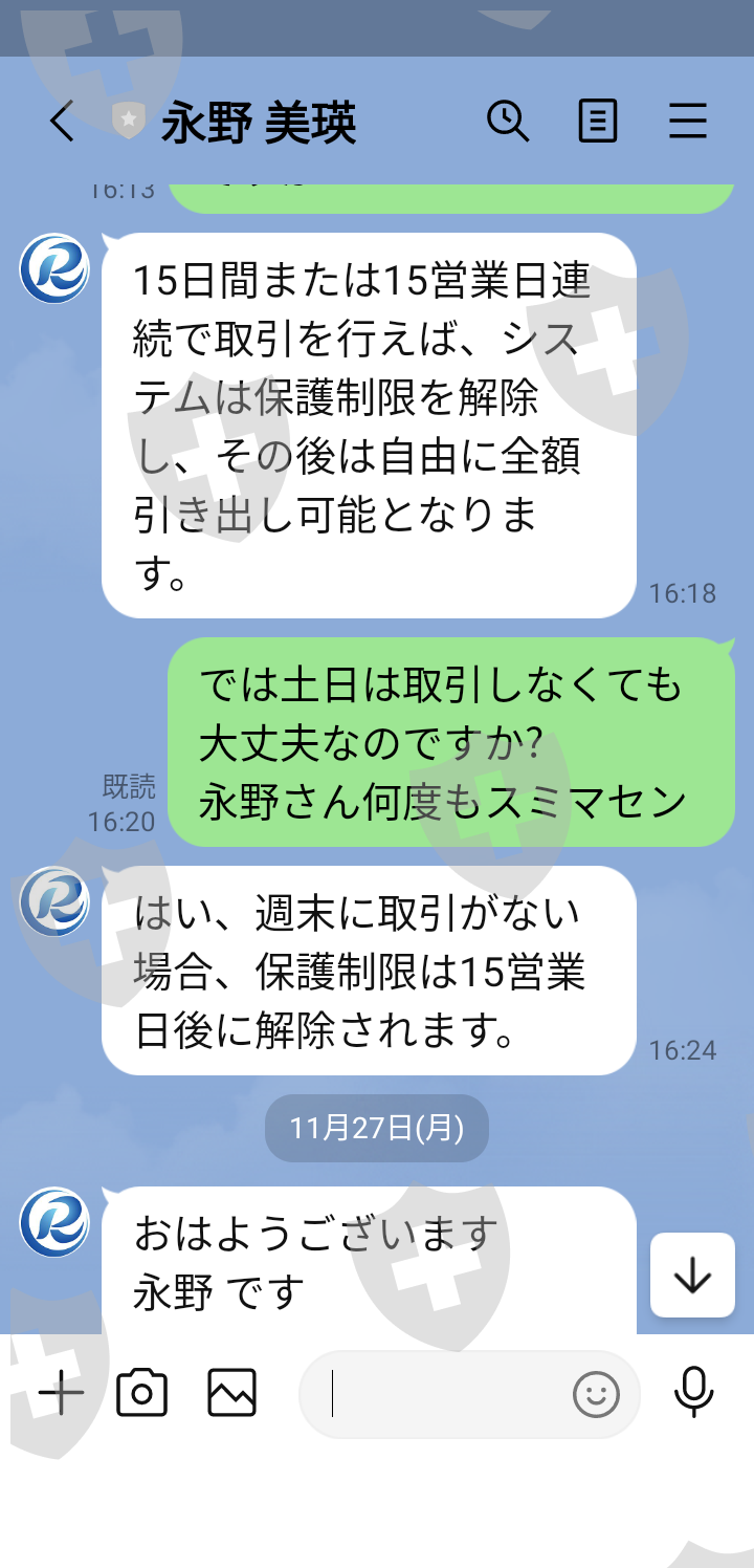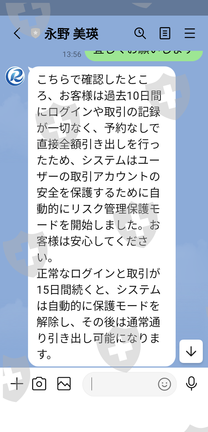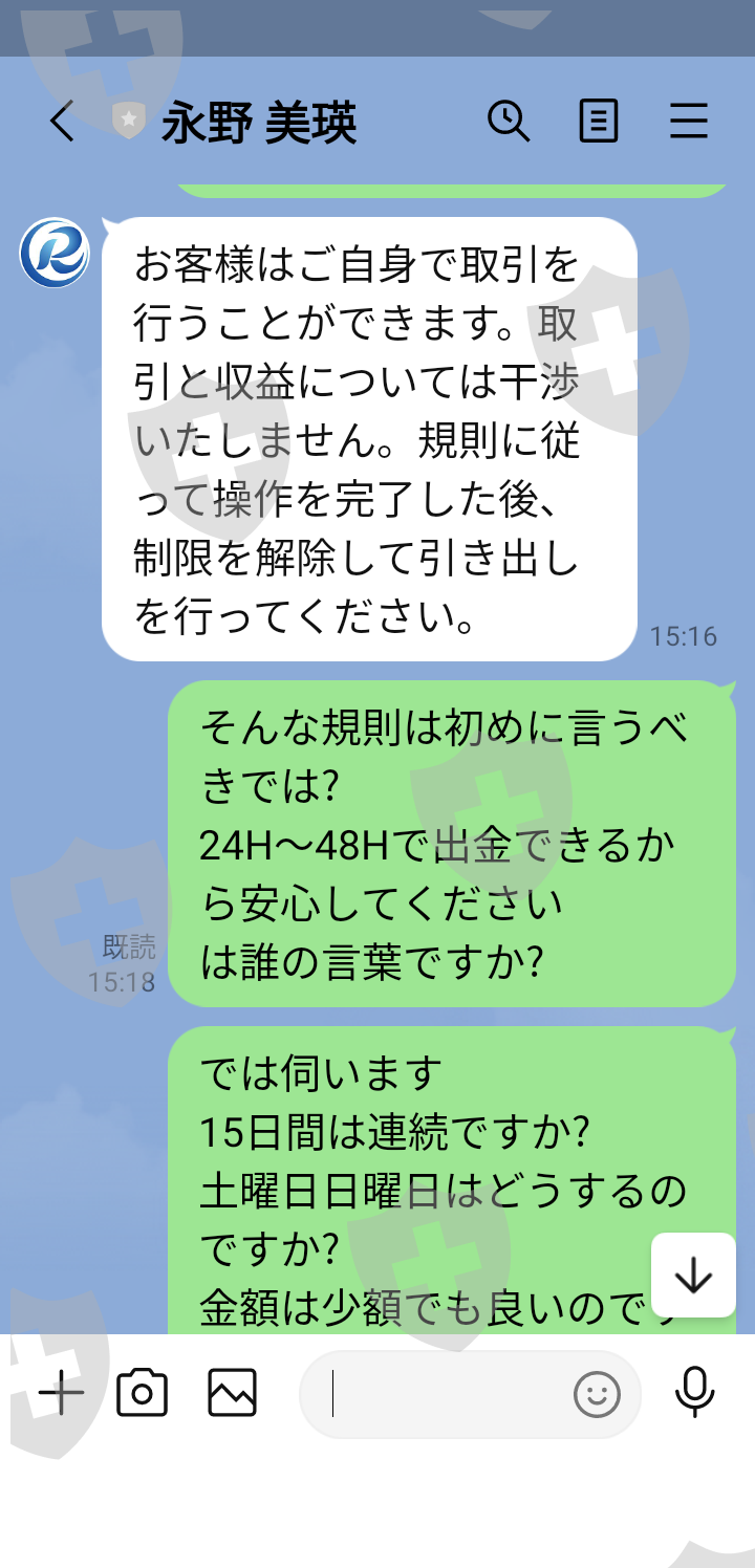 这是我第二次无法提取账户中剩余的约10,600美元。第一次是在11月9日,当时我被告知系统不批准提款。原因似乎是我大约10天没有登录或进行任何交易。当我问我该怎么办时,我被告知只要我连续15天登录并进行交易就可以了。从第二天到12月10日,我每天都登录并自行交易,没有任何指导。现在情况应该很清楚了。我再次要求提款。这次他们要求我交税费。当我问我每次提款是否都要缴税,税率是多少时,这个问题就消失了,我被告知除非我支付5%的学费,否则我不能来上班,他们不会不用办理手续。我被告知我将获得利润的5%。然而,我被告知我不能教书,因为我的账户余额很低。当时,我的账户里大约有 10,900 美元。指导我的石桥先生让我在账户余额达到 20,000 美元时联系他。换句话说,我被要求缴纳额外的押金。我没有那么多钱,所以我不能存款。我放弃了指示并完成了提款程序。这家公司所说的每一次都在变化。我认为他们不想提款。顺便说一句,我被告知5%的指令费是总资产的5%,而不是利润的5%。