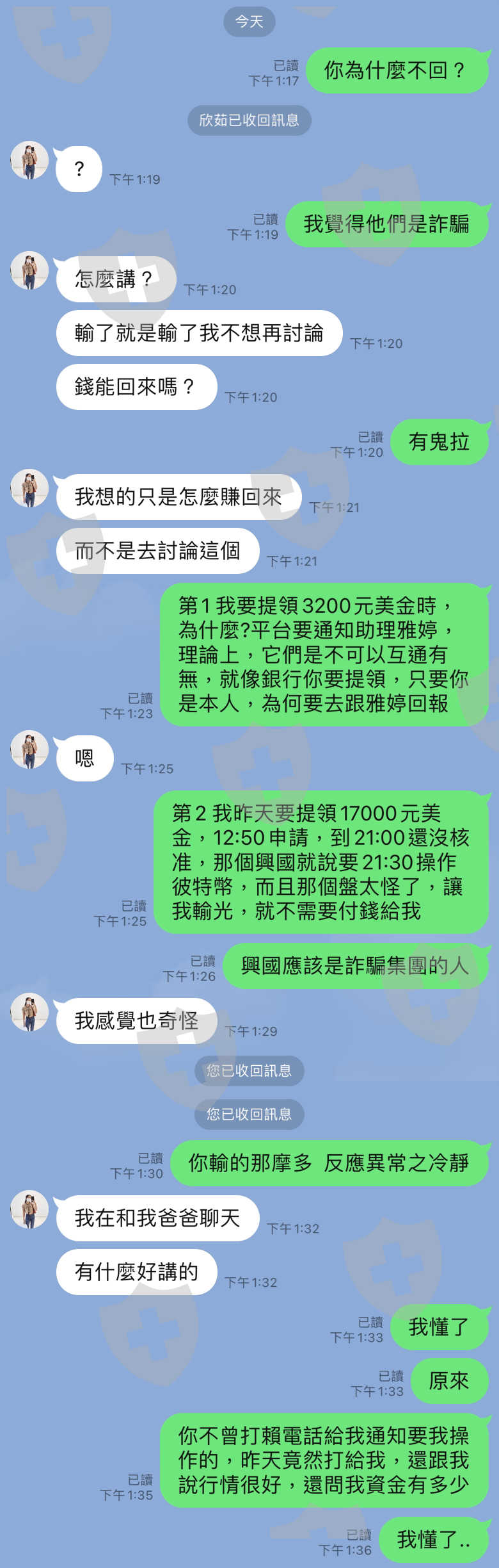 我被詐騙了,有一大個大群約70人,裡面都在講黃金的行情操作,1天都可以賺個10幾萬台幣,然後我一開始,有一位女生每天籟我,聊阿,說這個很好賺,要我趕快投入資金跟他一起賺,起初我都沒有同意,後來在群組上看到每天的那麼高獲利,我猶豫了,就在我投入12萬台幣,一開始就有高額獲利,然後又分等級並按照等級分成收傭金,青銅戰隊1~100萬 100萬~300萬白銀戰隊,以此類堆,會說盡快投資到白銀戰隊會有500萬以上獲利,財迷心竅的我,就一頭栽了進去,我前後4次共投資了100萬,第1次提領100元美金,第2次提領3200元美金,但因第2次提領就被通知要先扣儲值金額再扣獲利,我就開始覺得奇怪,都是我的錢還要分儲值跟獲利,就開始想要側資了,所以第3次提領我就想要1次領回多一點,達17000美金,到晚上21:30都未核准,之前是18:00前就會核准了,然後這個70個人群組的人,有其中一位女生欣茹邀我進去一個小群組,說這個小群組都有在操作比特幣賺錢,不需要分成,然後就在這個小群,在要進入操作之前,有一個女生欣茹打賴電話給我,通知我要進去操了嗎?還問我手上有多少資金?然後由一個名叫興國的人帶領操作比特幣,結果輸光100萬(3萬5千多美金),隔天提領的1萬7000美金,全部失效,一個大群,在分小群,然後找一個人每天接近聊天,目的是了解你做投資時的狀況,方便了解你的想法