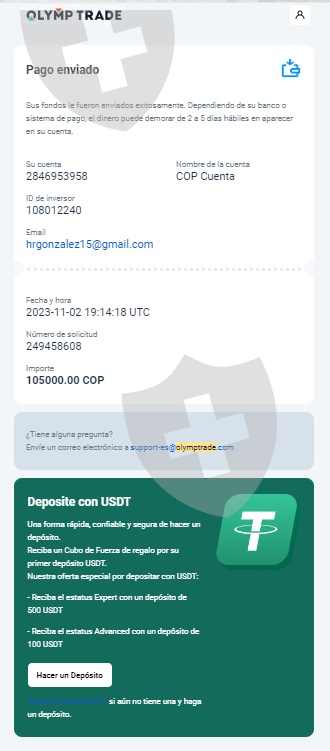 11月2日,退出经纪商 Olymp Trade,令人惊讶的是,它没有将资金存入我用手机号码注册的 nequi 帐户。拉斐尔·冈萨雷斯·富恩特斯的公民身份证明号码为: 17,973,759,也在经纪商有账户 Olymp Tradeid:#2846953958,我克制地附上交易的支持证明,以验证其当前状态并收回我的钱。