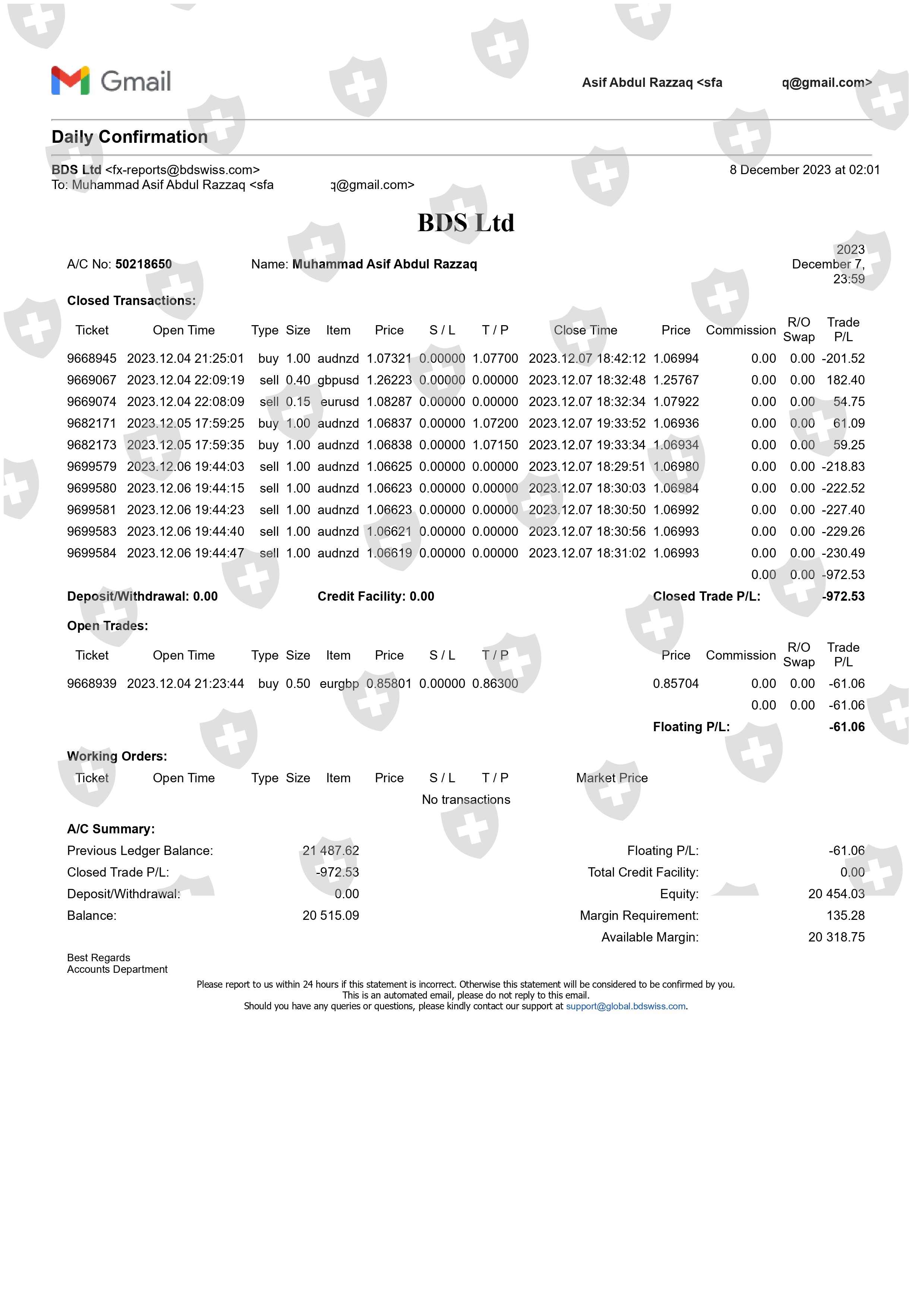我在BDSwiss遇到严重问题。 我在BDSwiss 进行交易,一切都很顺利。 突然,当我要求出利润时,BD Swiss 从我的 MT4 账户中扣除了我所有利润,并向我发送了账户停户通知。 他们从我的交易账户中扣除17492 美元,还终止我的帐户,这些都难以接受。要求将已扣除的入金和利润退回。