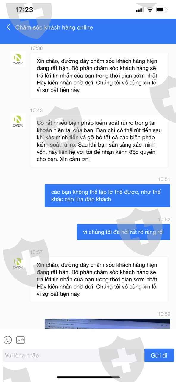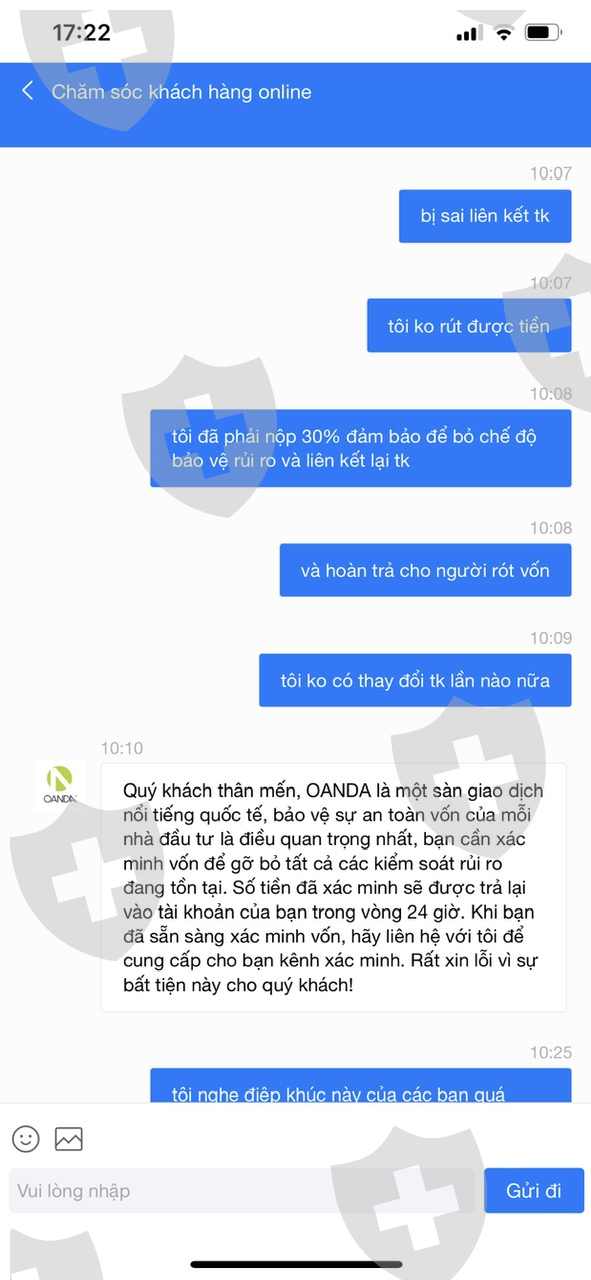 Sau nhiều lần hỏi bộ phận cskh họ đã không thừa nhận nền tảng tôi đang giao dịch là nền tảng của họ liên kết, Vậy tôi đang trao đổi với bộ phận chăm sóc khách hàng ma hả? Họ không cho tôi rút tiền, tôi đã phải nâng TK lên VIp, nộp 30% tiền đảm bảo tài khoản và trả khoản vốn vay cho người rót vốn với câu hỏi muôn thuở tôi có rút được tiền không? Tôi nhận được câu trả lời bạn rút được và cái kết : BẠN KHÔNG RÚT ĐƯỢC TIỀN BẠN CẦN PHẢI NỘP 1 KHOẢN TIỀN ĐẢM BẢO TÀI KHOẢN...v..v.. Đúng là bọn lừa đảo.