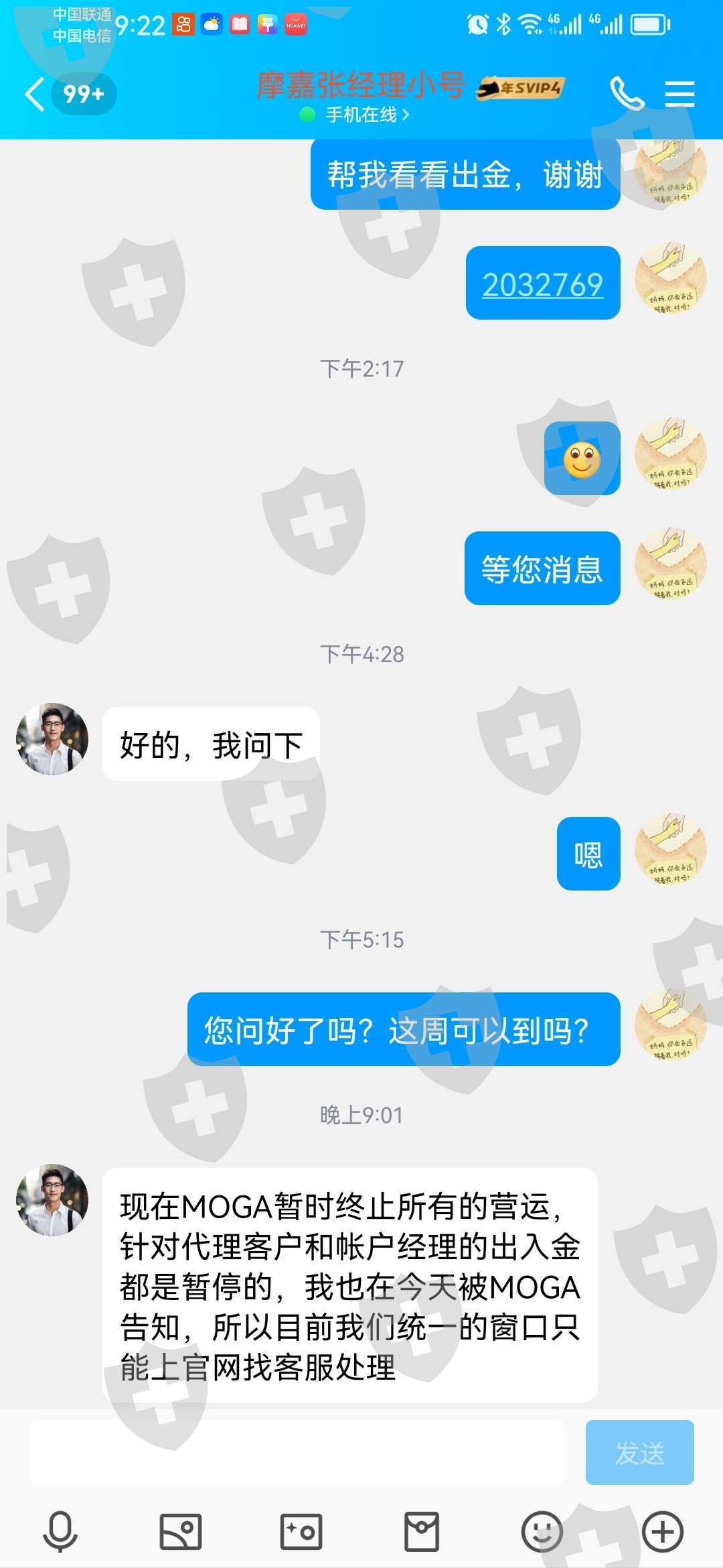 今天我的MOGAFX平台的交易账户2032769,剩余1390美金,申请出金一周多了,今天被客户经理告知现在MOGA暂时终止所有的营运,针对代理客户和帐户经理的出入金都是暂停的,