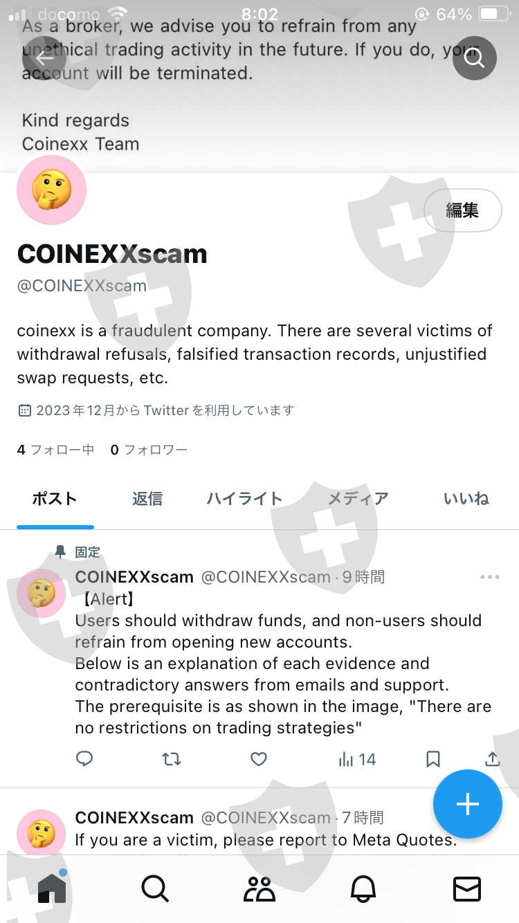 In the past, when we reported other cases of fraudulent withdrawals (GemForex, FXfiar, etc.), MetaTrade's license was revoked, and we are concerned that Coinexx's license may be suspended and its business may be suspended as a result.