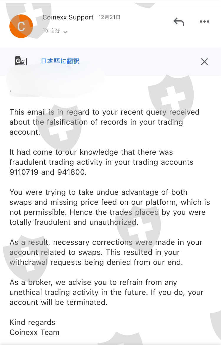 Coinexx 恶意拒绝提款,不当伪造交易记录、不当收取掉期、拒绝提款、取消利润。[警告]用户应撤回资金,非用户应避免开设新账户。以下是每项证据的描述以及电子邮件和支持中相互矛盾的回答。如图所示,前提条件是 "对交易策略没有限制"。这是真的吗?不合理的利润减少和无法出金。据我们确认,有多名受害者,实际受害者人更多。我们向 MetaQuote 报告了拒绝提款造成的欺诈性损失。当我们举报其他欺诈性取款案例(GemForex、FXfiar 等)时,MetaTrade 的执照被吊销,我们认为 Coinexx 的执照也可能因此被吊销,业务也可能因此暂停。如果今后继续诈骗,我们认为应该告诉广大交易者,并采取相应的惩罚措施。[看到此文的大家。如果您是用户,建议您提现。许可证被吊销后,新的存款将被切断,预计还会有更多的用户被拒绝出金。如果您是新用户,我们建议您使用其他公司。他们的点差(EURUSD0.2~0.6)看似很窄,但滑点(EURUSD1.0~2.0)非常可怕,实际交易成本巨大。如果您是受害者,请向 Meta Quotes 报告。