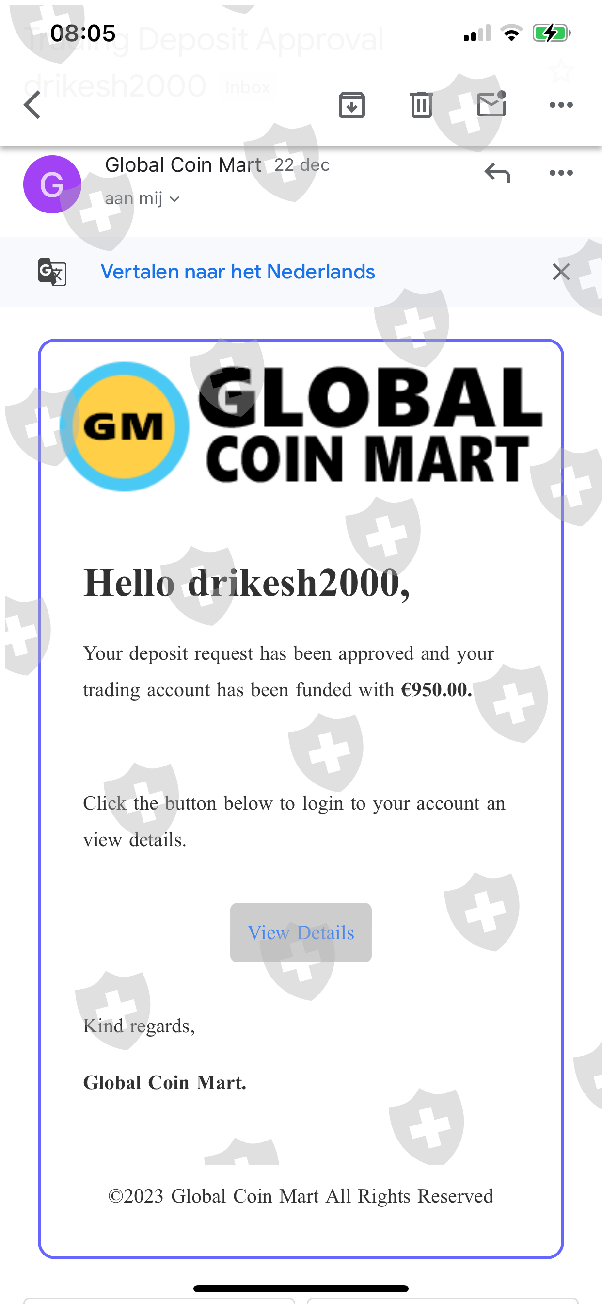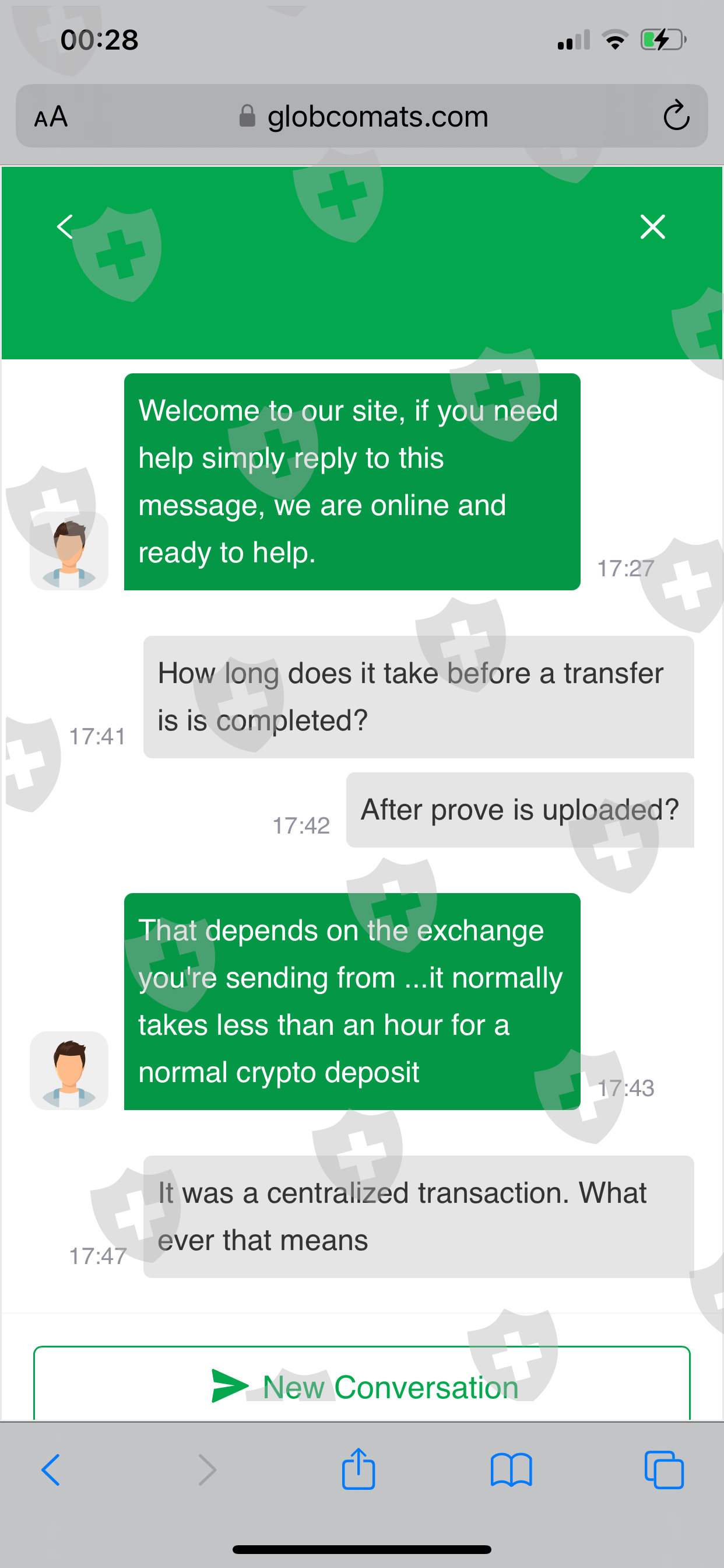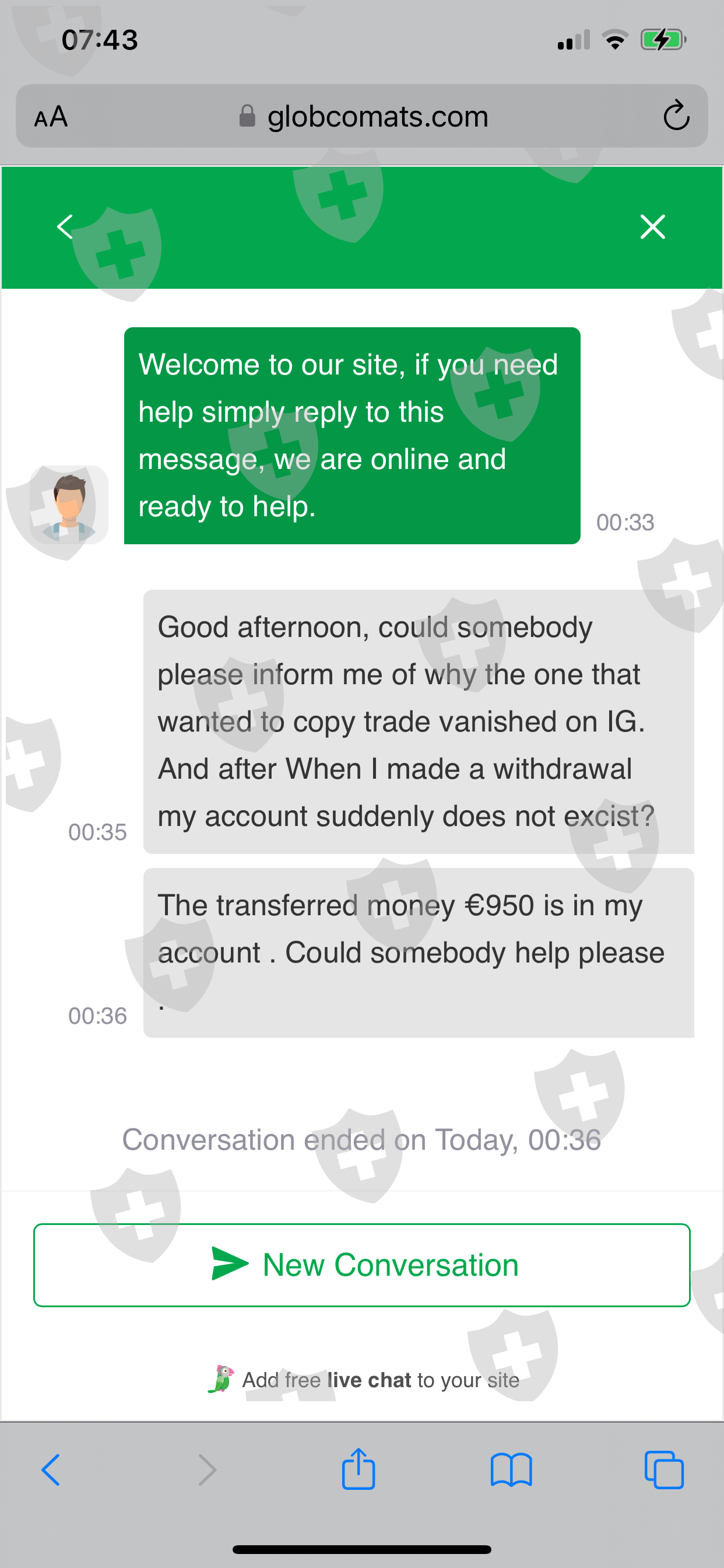 我在网站 www.globcomats.com 上开设了 Global Coin Mart 账户。我的账户已通过验证,资金(950 欧元)已转入我的账户。在注意到我打算跟单的交易员在 IG 上消失后,我试图取款。一天后,我的账户没了。