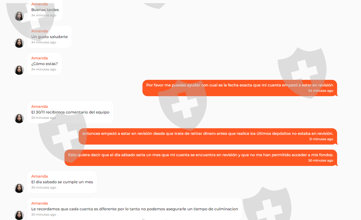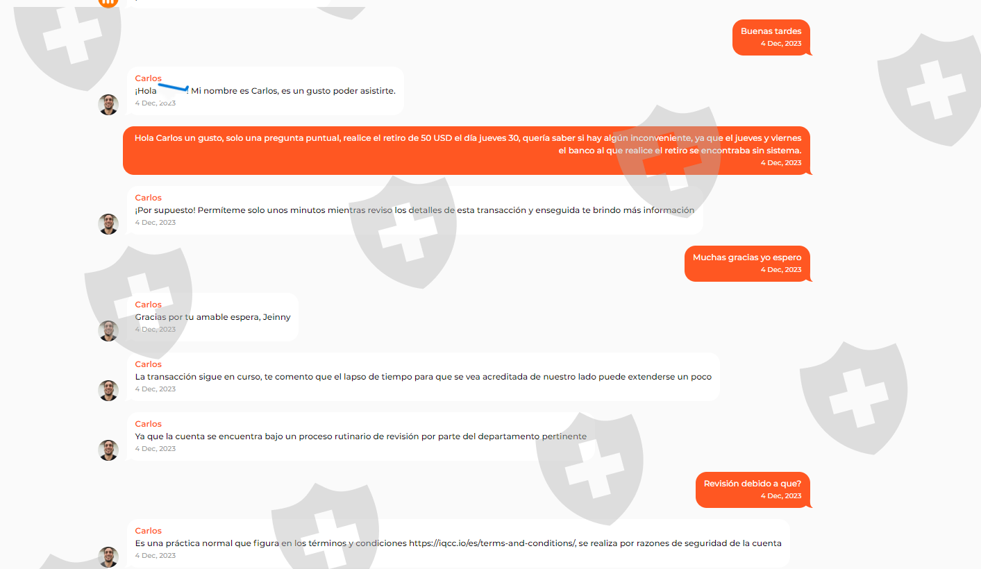 自2023年11月30日以来,我的账户一直在审核中,这引起了我的注意,因为我已经拥有该账户两年了,有几次我烧毁账户并再次存款,但这一次我终于开始盈利,我想要要提取我的第一个 100 美元利润,帐户将受到审查,他们完全没有解释任何内容,并告诉您没有具体的审查时间,并且在审查期间我无法提取资金,无论是我存入的资金还是利润。事实是,我怀疑他们是否会退还我的钱,这就是为什么我决定让他们接触 IQ Option让他们在选择经纪人的时候更加谨慎。