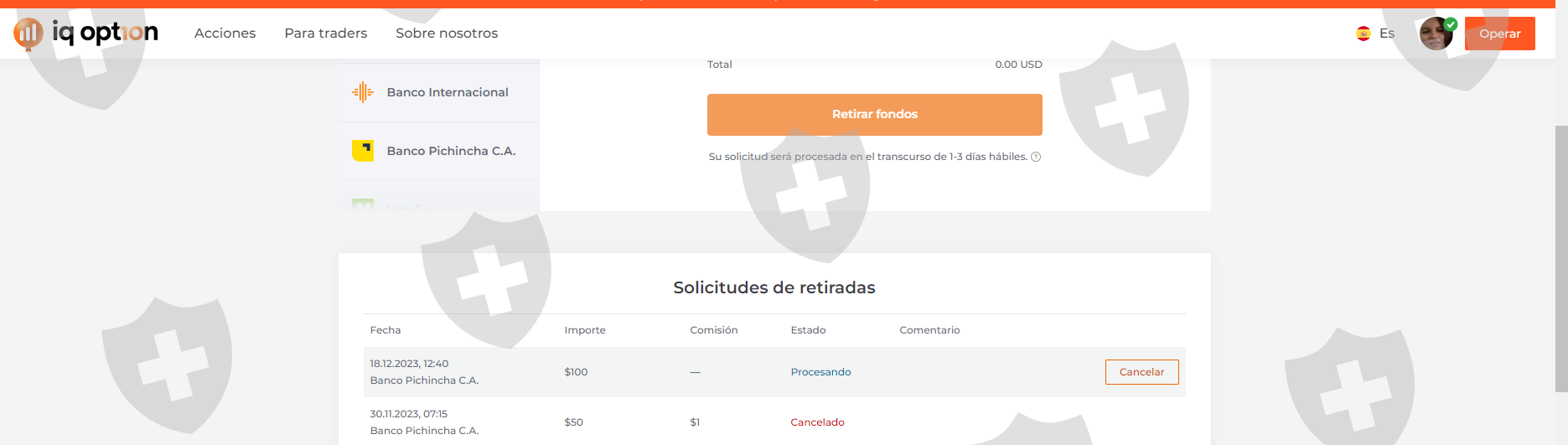 Desde el 30/11/2023, permaneces mi cuenta en revisión, me llama la atención por que tengo dos años la cuenta, en varias ocasiones queme la cuenta y deposite nuevamente, pero esta vez que por fin empiezo a ser rentable y quería retirar mis primeros 100 dólares de ganancia, entra la cuenta en revisión, no explican absolutamente nada y te dicen que no existe un tiempo determinado para la revisión y que mientras permanezca la revisión no puedo retirar el dinero, sea el capital que deposite o las ganancias. La verdad es que tengo dudas que me regresen el dinero, por eso me decidí a exponer a IQ OPTION para que tengan mas cuidado a la hora de escoger un bróker.