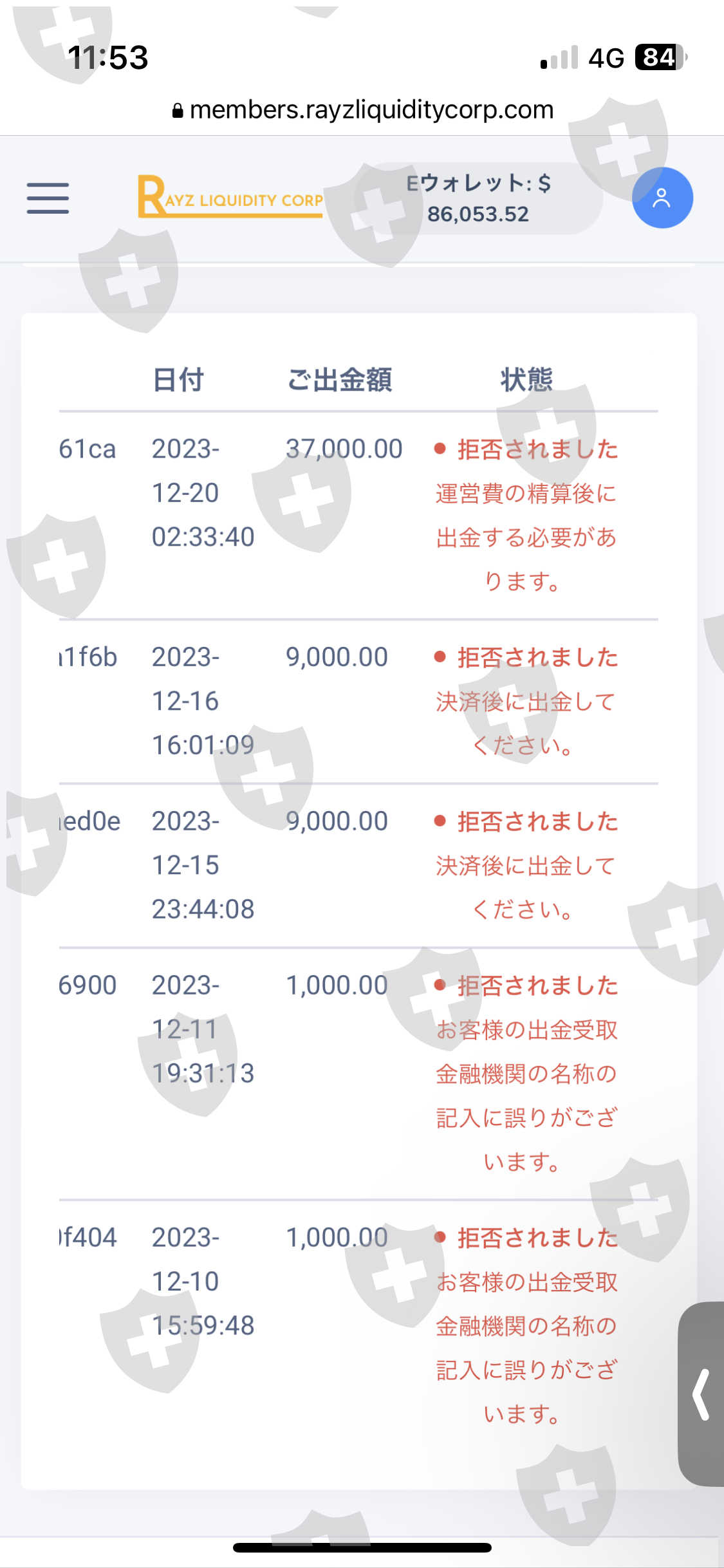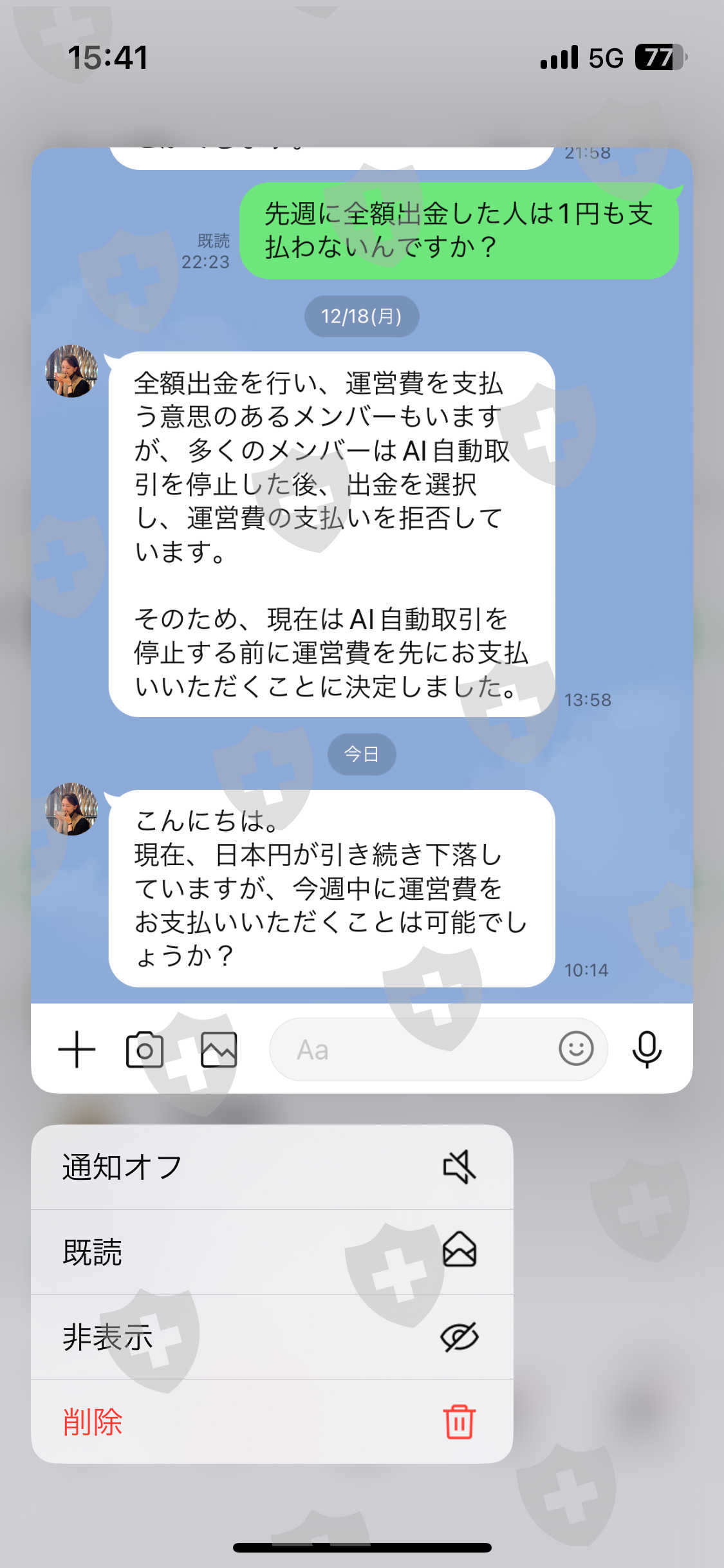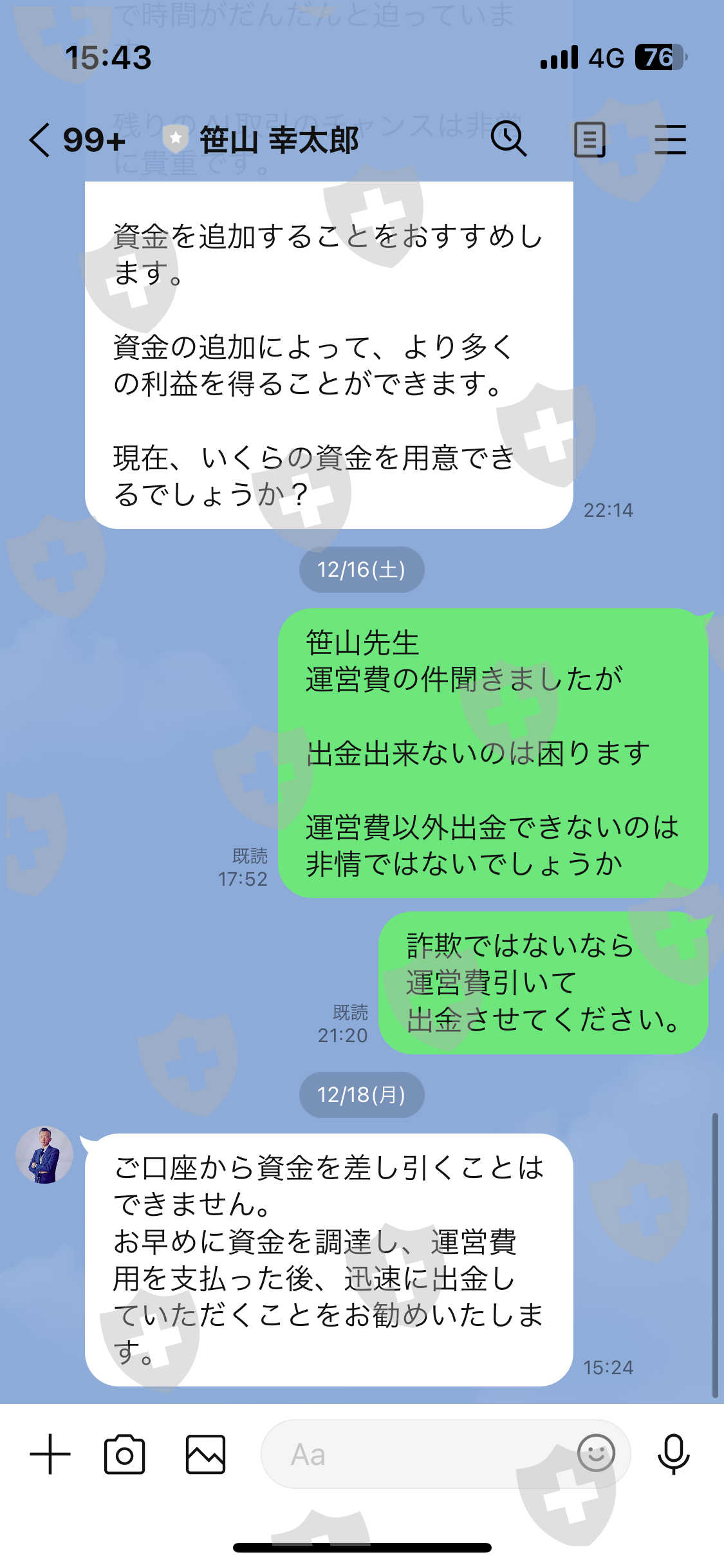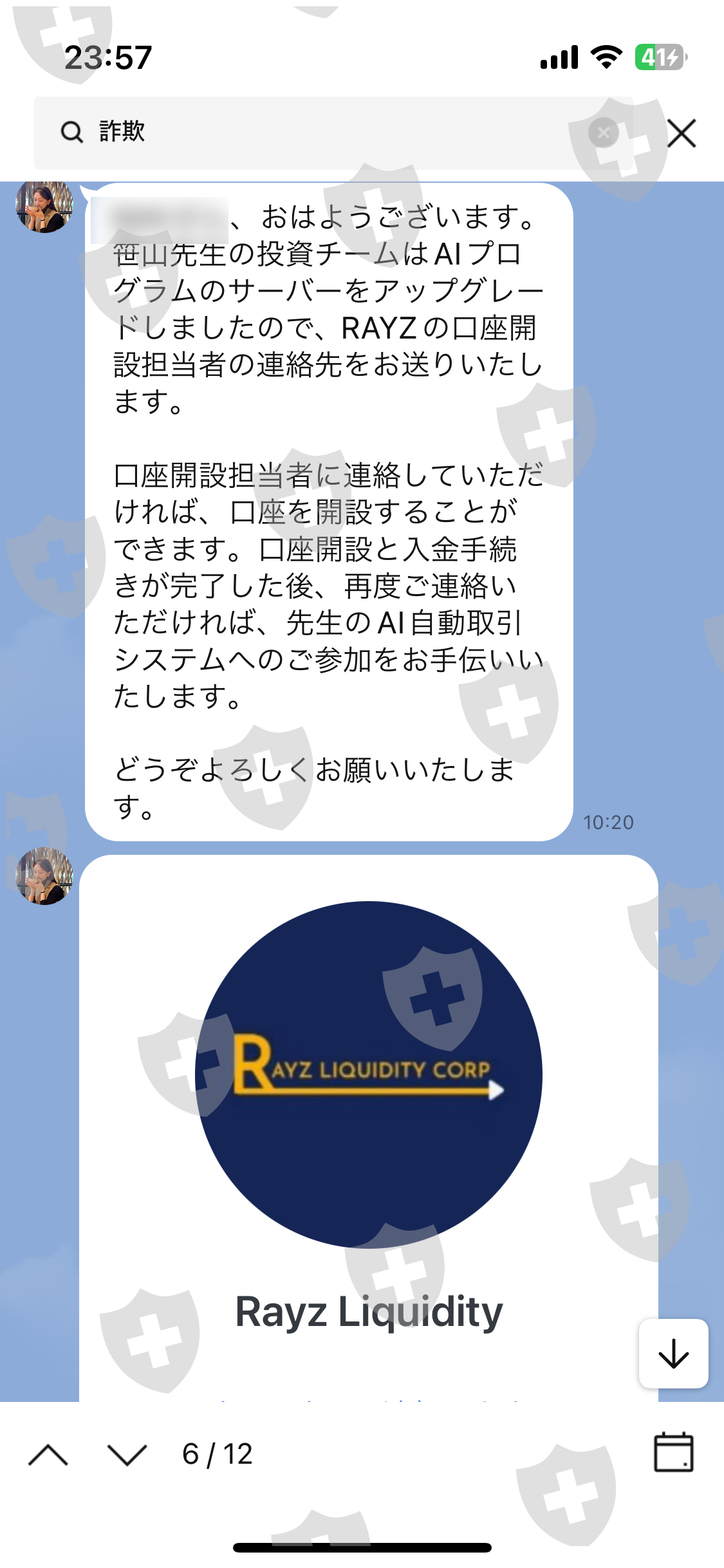 我加入了筱山金融学校的LINE群,筱山光太郎是老师,成田惠美是助理,RAYZ账户的负责人是一个叫大场的人。使用 FXGT 应用程序存入的金额会立即反映,所以我相信它,但实际上......由于该账户由 RAYZ 管理,因此您无法自行提款。每天我都会收到LINE的提醒信息,说我必须支付利润的管理费才能提款。我存了大约500万日元,现在亏本了。镜像账户?嗯,当这个数字增加到1000万的时候我很高兴。无论如何我都想收集一些。