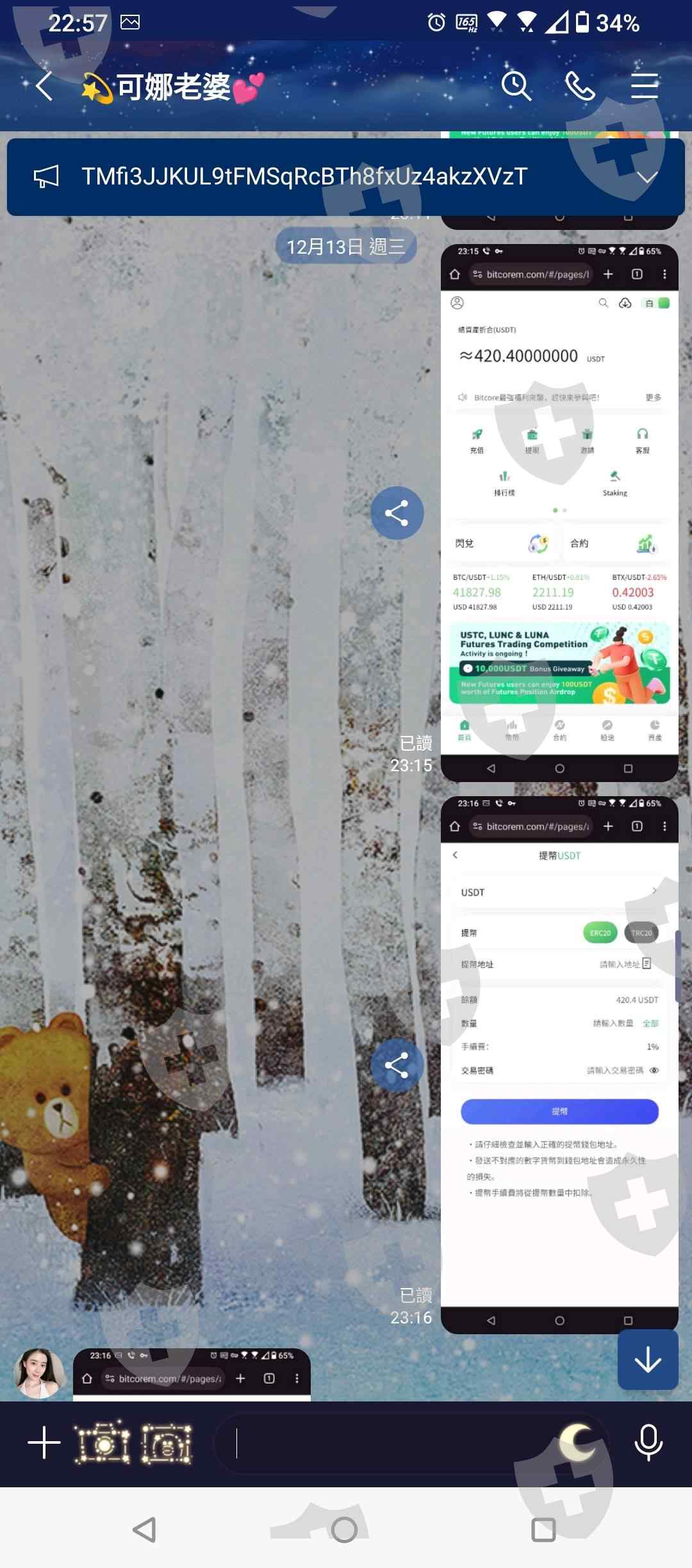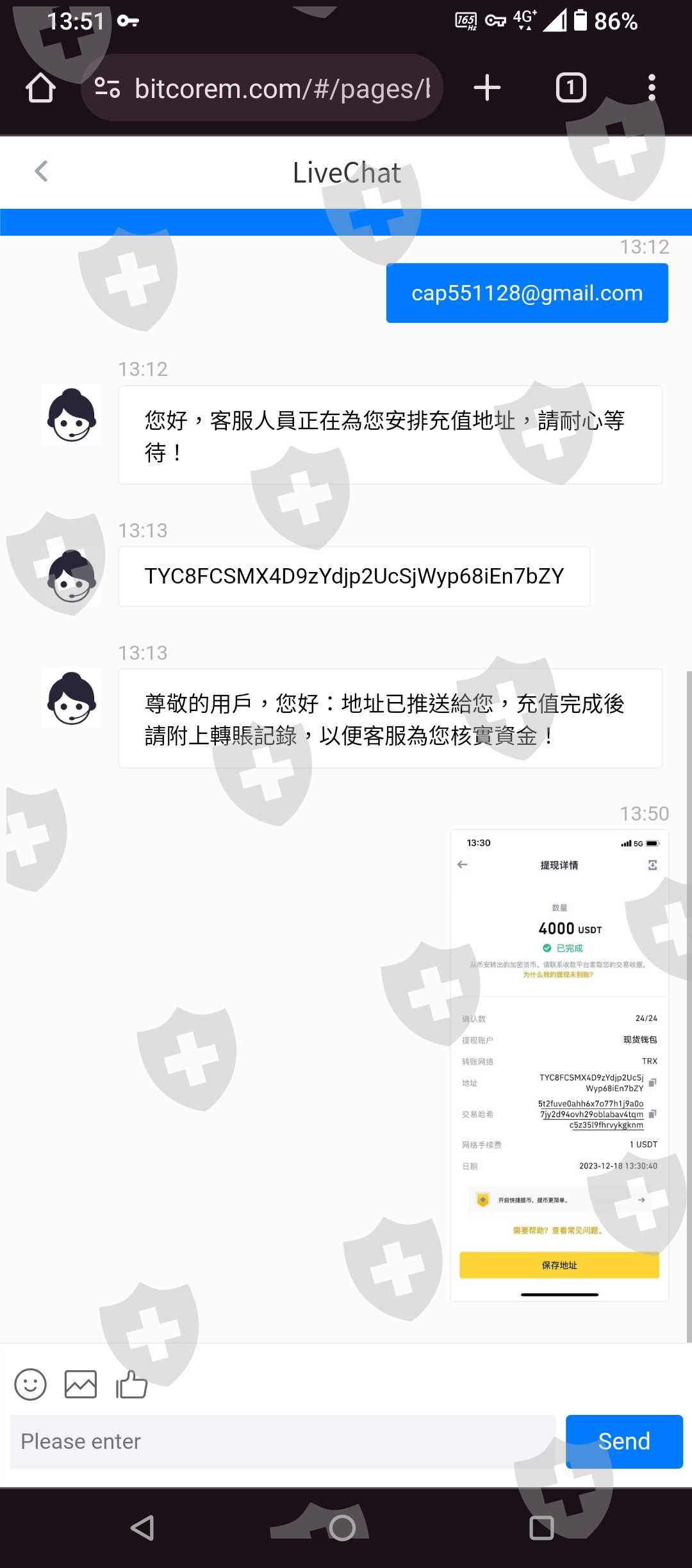 一開始是在ig上有一個陌生女士找我聊天,後面聊一聊說他們珠海那邊ig不方便聊天要求加line,前面幾天聊天都很正常,後面打電話給我跟我說他們公司有在入侵一些公司的數據來達到獲利開始找我一起放幣在平台上,一開始有透過先放幣在okx交易app平台上,再轉到她給我上面bitcorem這個網址上。買幣過程她有提供一個人的帳戶給我讓我匯錢過去給她買幣。一開始確實獲利了也有拿回錢,後面開始慢慢讓我多放一些錢在她給我的平台上面,她請我放10萬進去的時候,我有跟她說如果妳願意在我這帳戶上放13萬進來我就放,結果她為了得到我信任真的放了進來。這種情況讓我開始上網查詢這是不是一個詐騙,所以我昨天去到她給我的平台網址上想把前提現出來,發現一直在審核中就是沒辦法提現出來,問客服卻是跟我說沒有交易流水無法提現,她幾乎每天都會用通話的方式跟我說話,她想跟我視訊,但只有我開而已,這部分她跟我說因為他們公司在做入侵其他公司這部分所以公司規定不能開攝像頭不能拍照,打電話的部分白天晚上都會