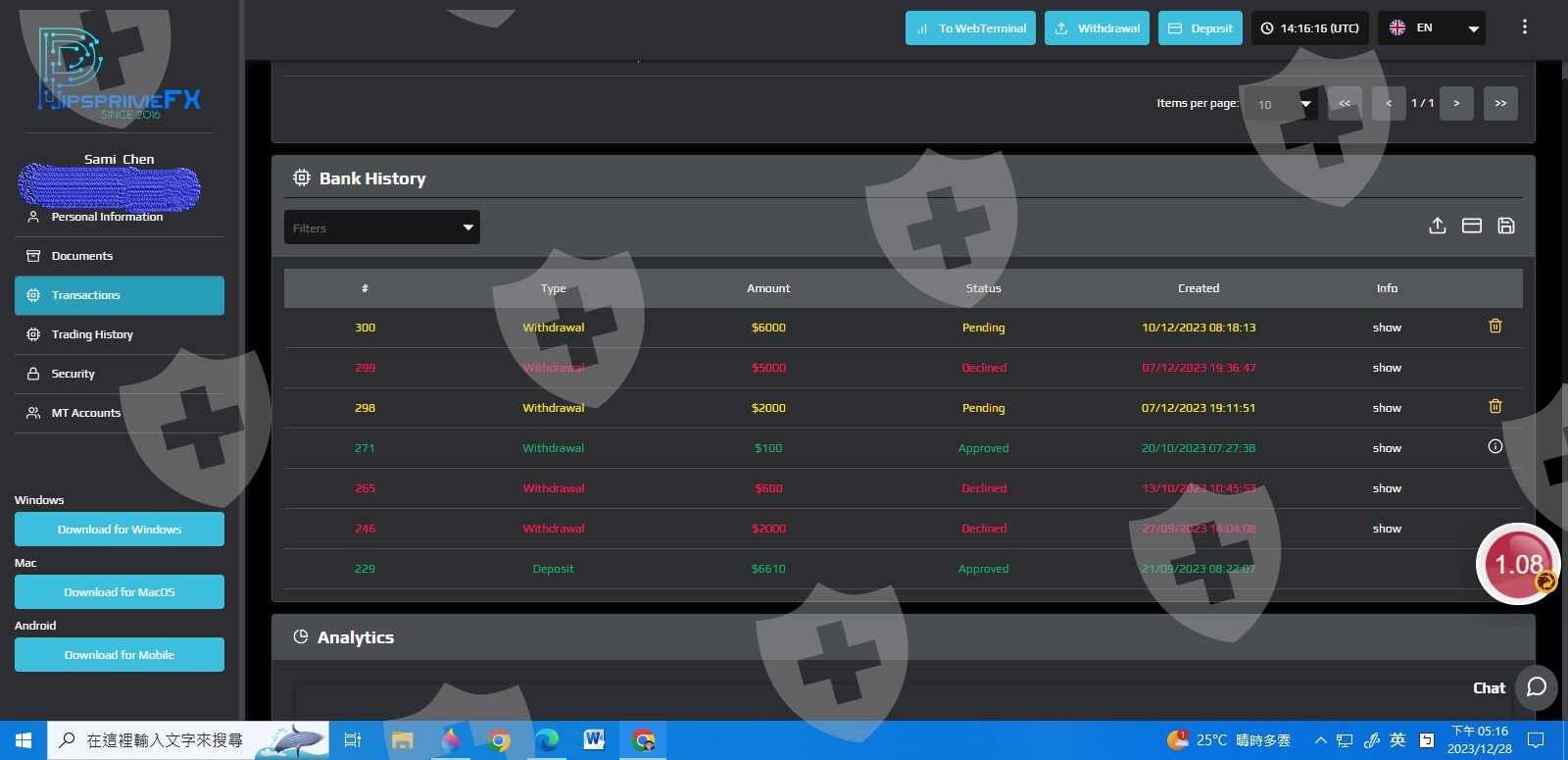 12月7日及10日分別申請出金2000美元及6000美元,迄今(12月28日)仍不處理!!寄電郵給客服3次,也都不回復!!!7th December WD 2000 USD.10th December WD 6000 USD.I sent email 3 times to support@pipsprimefx.com without any reply.It's 28th December now, and this broker hasn't done anything.Very very very bad broker, not trustable...