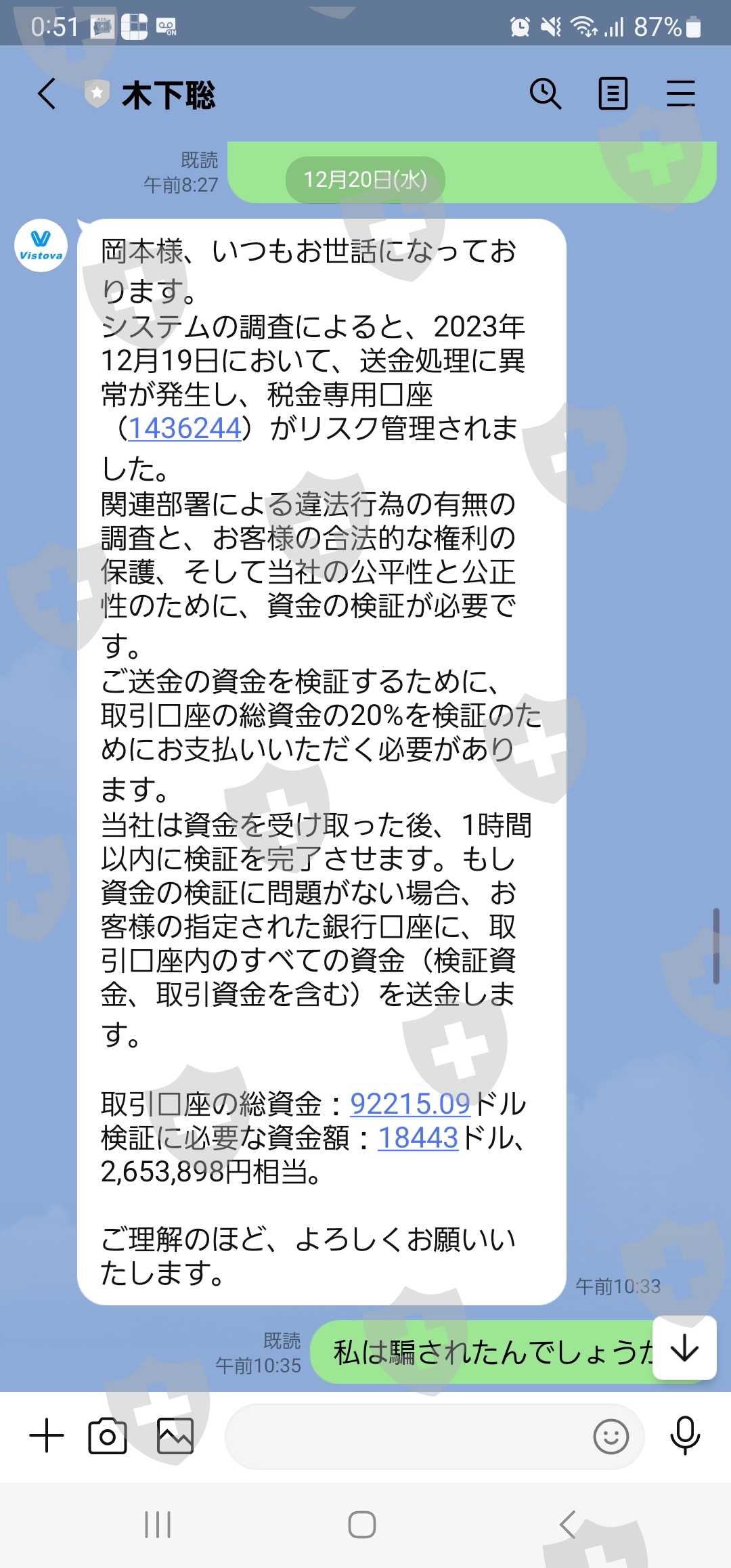 当我申请提款时,我被扣了税,2023年12月19日,汇款过程中出现错误,我的税务账户(1436244)被置于风险管理之下。资金核查是相关部门调查确定是否存在违法行为、保护您的合法权益以及本公司公平公正所必需的。为了验证您的转账资金,您需要支付交易账户总资金的20%进行验证。我们在收到资金后1小时内完成验证。如果资金验证没有问题,我们会将您交易账户中的所有资金(包括验证资金和交易资金)转入您指定的银行账户。交易账户总资金:92,215.09美元 验证所需资金金额:18,443美元,折合2,653,898日元。我收到一条消息说。请立即提款