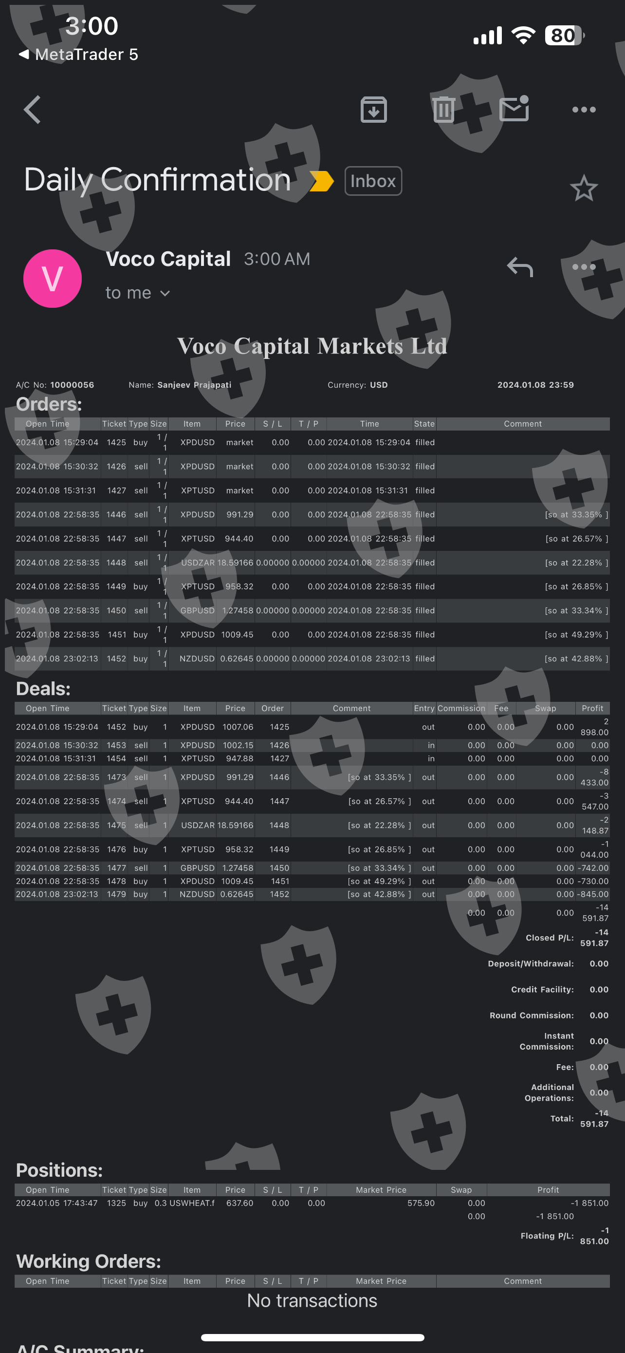 诈骗!!!!!!!!!诈骗!!!!!!!!!诈骗!!!!!!!!!诈骗!!!!!!!!!诈骗!!!!!!!!!诈骗!!!!!! !!!!!!诈骗!!!!!!!!!不要相信这个网站,所有都是假的..给的是假的随机号码!!!!!我不了解也没有经验,损失了所有的钱。下图为证,harrika说服我开设了一个账户。之后,我按照财务顾问 NAME ALI 所说的进行交易,损失了7000 美元。Voco Markets,现在请帮助我拿回所有资金。 否则我将以欺诈罪对你采取法律行动。正是因为我经历了这些,我不会让其他人像我一样,在一周内失去所有的钱。