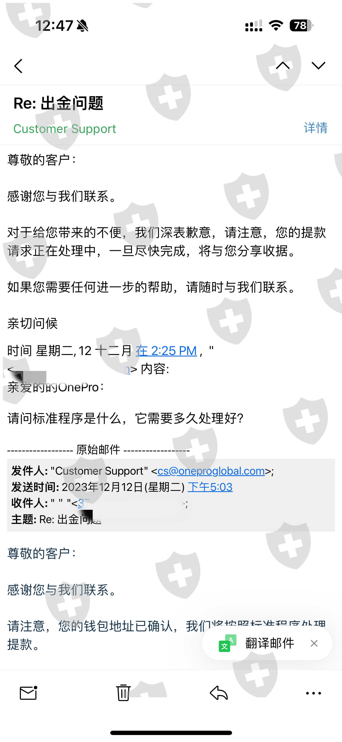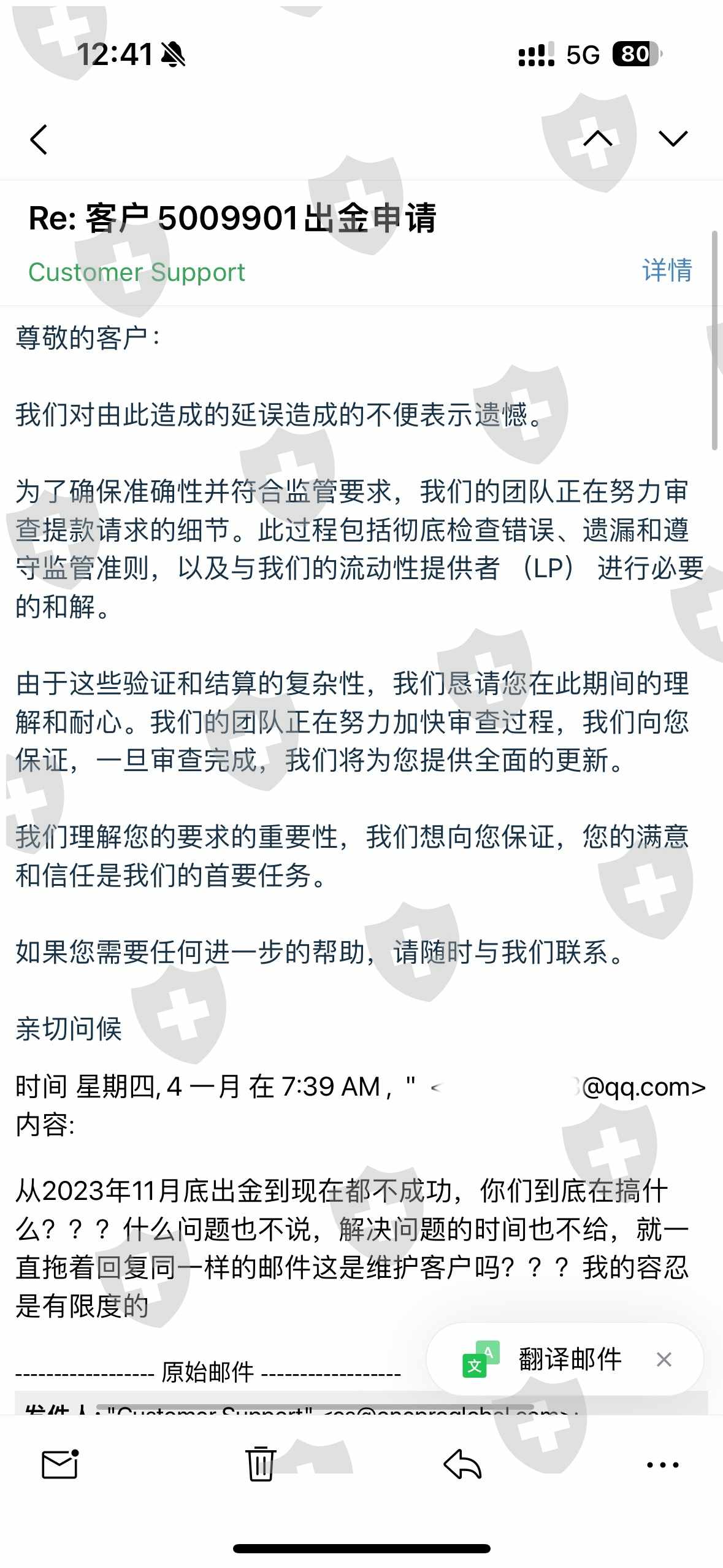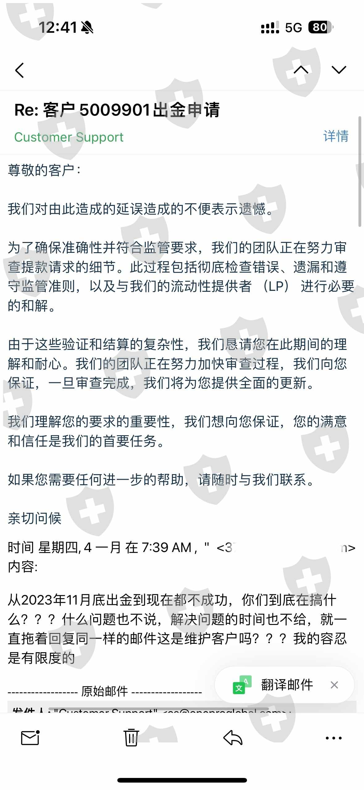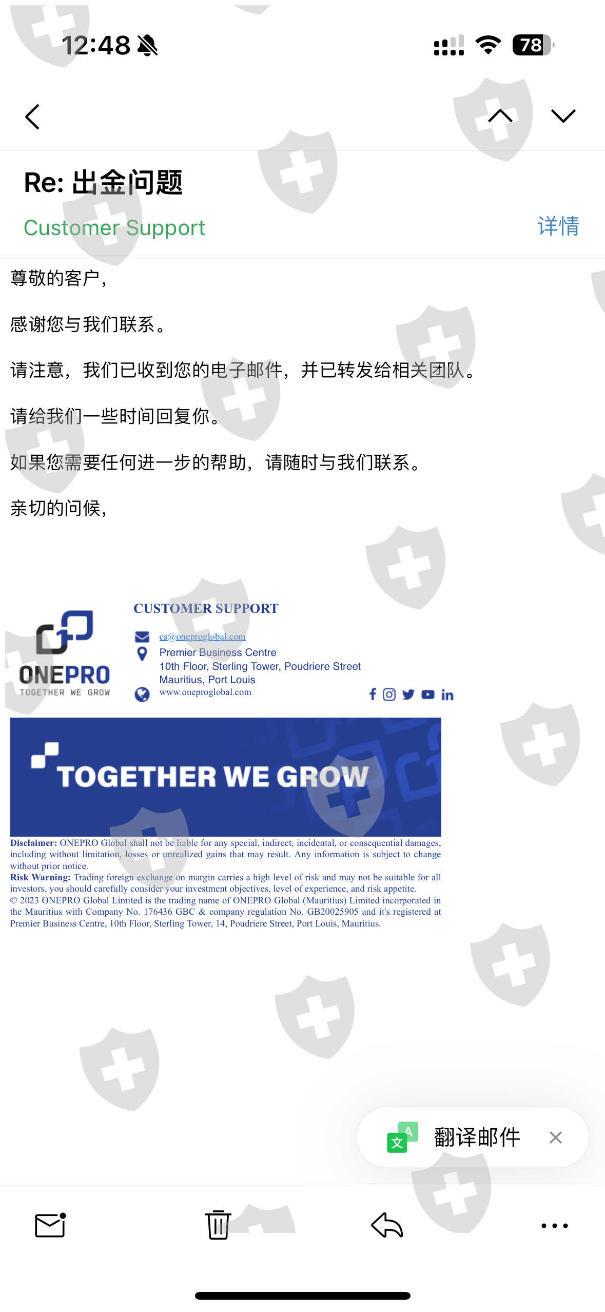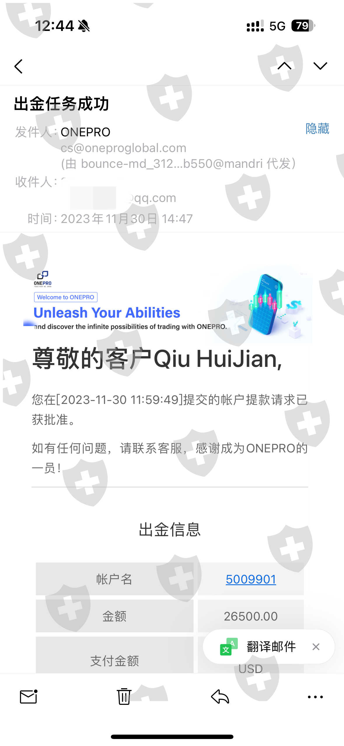 在2023年11月30日在onepro盈利申请出金至今仍未成功。平台一直无论是发邮件回复都是重复的“审核我的订单”这样的字眼就是避而不答。(我的交易订单没有问题,没有短于3分钟,也没有快进快出,也没有借助别的软件做单,纯手工做。)