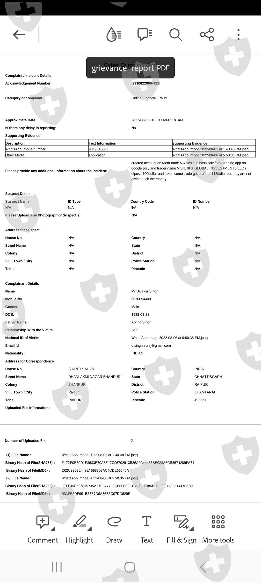 Deposited 100$ in a broker account name Vision FX Global to trade in forex Meta5 and got 200$ credited in broker account by initiating of an unknown person as he told me