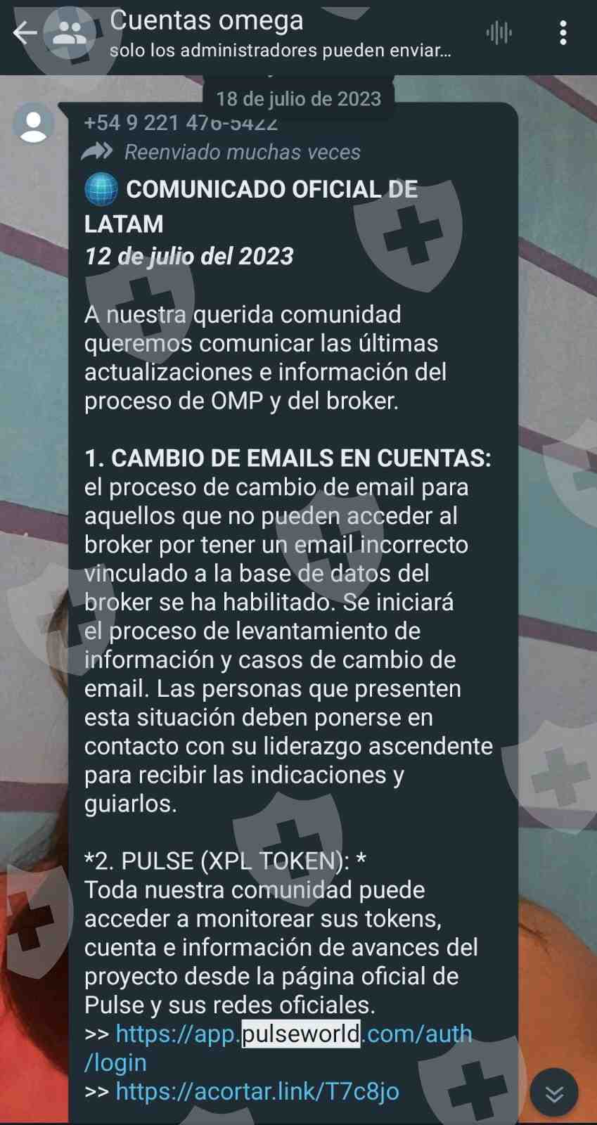 就在 2022 年 5 月 10 日,我投资了大约 500 美元,在他们向我承诺我的钱会成倍增加的情况下,我通过 Bitso 完成了整个转账过程。大约两个月过去了,当我无法再访问我的帐户时,他们告诉我检查我的电子邮件,他们向我发送了一个新密码以进入我的帐户,但我从未收到过该电子邮件,我什至检查了垃圾邮件文件夹,但什么也没有。在得知所谓的黑客攻击所发生的一切之后,页面不再加载,并且他们正在接受审计,据说在审计结束时,他们将进行存款,这是迄今为止从未发生过的事情。他们能够更改密码的帐户,他们能够登录另一个名为 https://app.pulseworld.com/auth/login 的页面,该页面被认为是 omega pro 的合作伙伴,您可以使用您的帐户登录omega账户,但我一直无法登录。直到今天,我不能也不再了解我的钱。