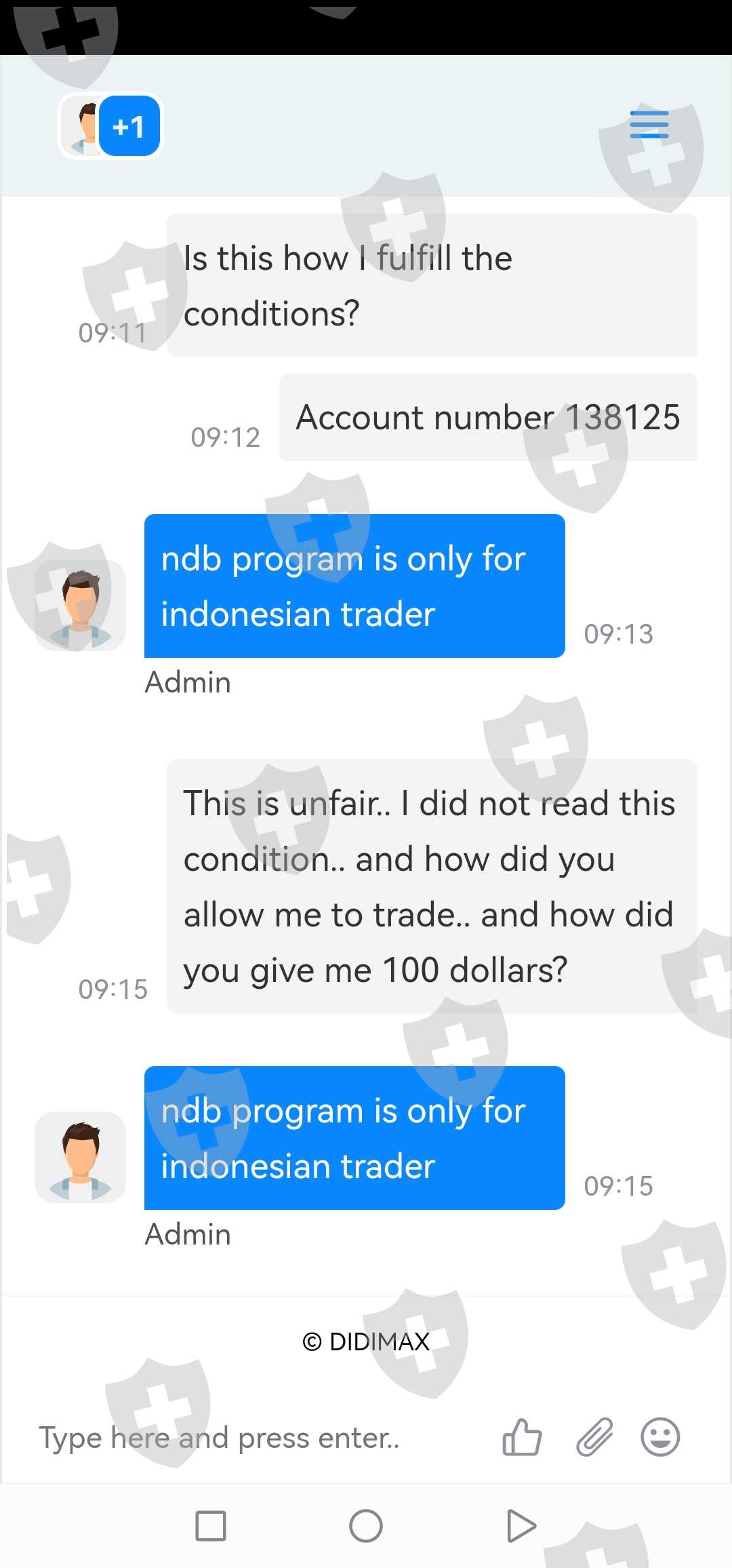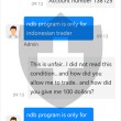 بعد الاشتراك في NO DEPOSIT BONUS $100 قامو بايداع 100 دولارفي حسابي وبعد اكمال الشروط والربحاخبروني بأن هذ البرنامج فقطللاندونيسين. . هذا احتيال. . .لماذا لم تضع هذا الشرط من بين الشروط ولماذا تم منحي100دولار من البداية