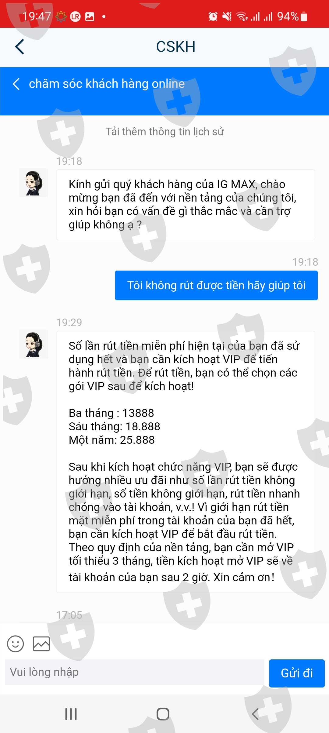 Tôi rút tiền trong nền tảng IG 2 lần đầu thì rút được bình thường. Rút lần 3 thì nền tảng bắt tôi nạp tiền Vip mới cho rút, tôi thấy điều này hết sức vô lý. Giờ tôi không có tiền nạp Vip nên tôi không thể rút được tiền đồng nghĩa với việc tôi sẽ mất trắng tài khoản. Vui lòng hỗ trợ tôi rút tiền.
