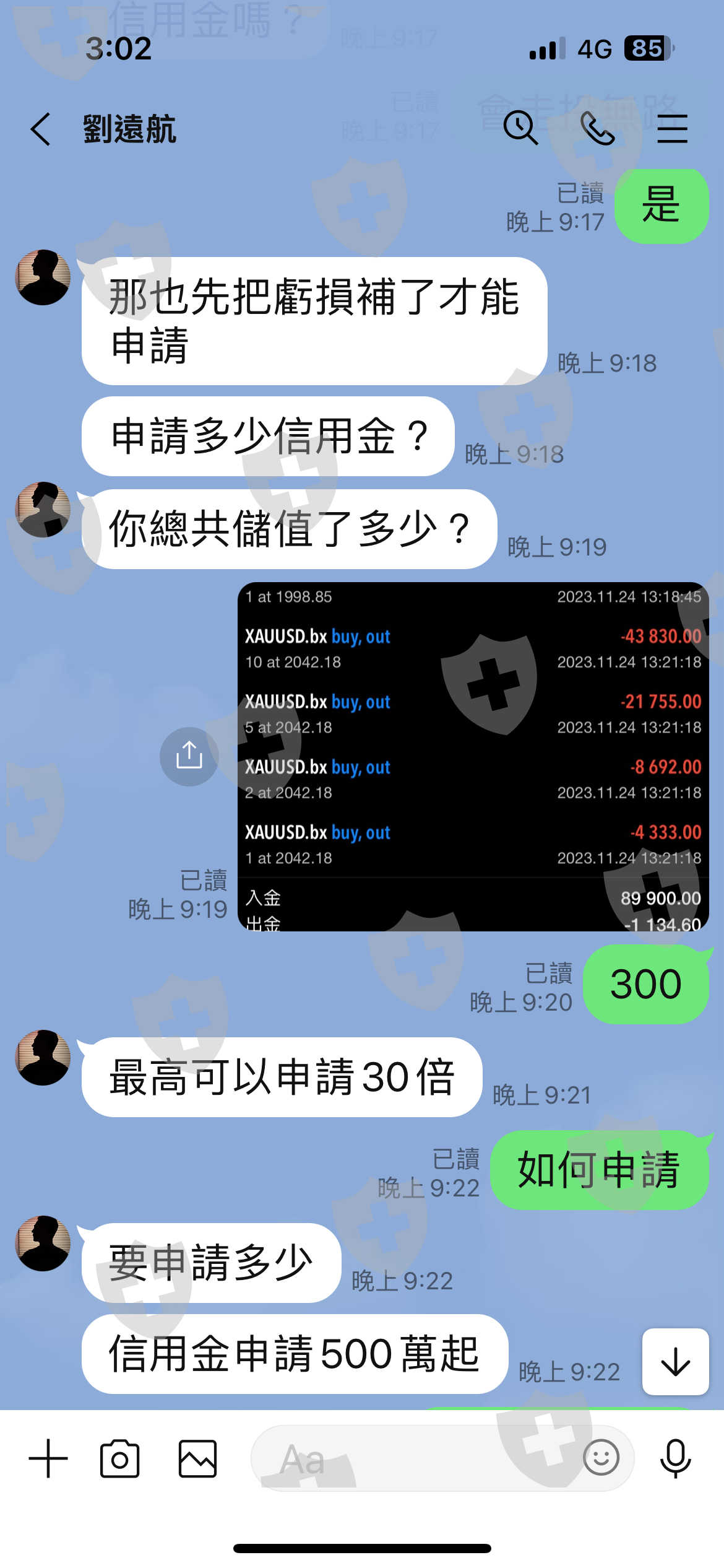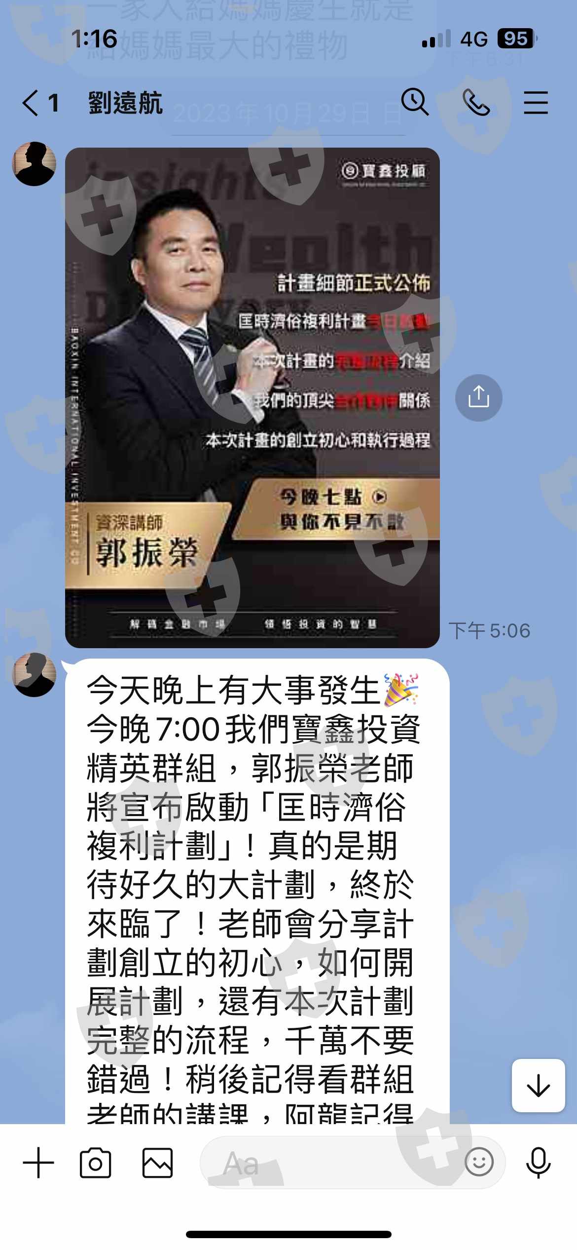 於2023年9月初在FB -頁式廣告加入寳[d841][dcfe]投顧由劉遠航帶領下而操作台股每日晚上由老師郭振榮在line群組中名稱寳鑫投顧精英小隊分析台股,9月底因台股不易操作10月中旬推出差價合約用台幣更換USDT幣於10/25左右由劉遠航鼓吹之下保證獲利但須抽高分成並說在股市虧的會在補償,帶領在Vistova開戶申請帳號 而操MT5 每次入金需找V-陳致遠由他找U商並給錢包地址更換USDT幣. 出金設定金融卡自行提領,起初投資現金30萬台幣在劉遠航帶領每天2次操作操作並控制在三分之一水位而有獲利並出金3次過共36000元而相信,在平台上上下震盪4000點而爆倉一共3次資產為負數有補足一共投入340萬台幣最後於11/27跟寳鑫投控劉遠航連絡可借500萬信用金起,跟V-陳致遠要了錢包地址並入金.想早點獲利並還錢歸還日為12/6。起初只說不能出金提領他們無法控制,並沒有說會把帳戶改為信用戶,於11/28再度於V-陳致遠確認帳戶為信用戶控管,無法提領當下有跟劉遠航提出抗議並恊商先將20天於12/5分成繳清約300萬後,信用金的部份由他處理等提領後再歸還由他提供錢包地址再匯入,我跟劉遠航說明要繳納分成和歸還信用金須提領出來劉遠航說如不還不信用金及分成一切交由平台法務處理12/6 V陳致遠說信用金不還一切交由法務處理及相關法律問題我說好一切等法務處理 我有問到是法務出面就能解決所有出金問題 他說是的對
