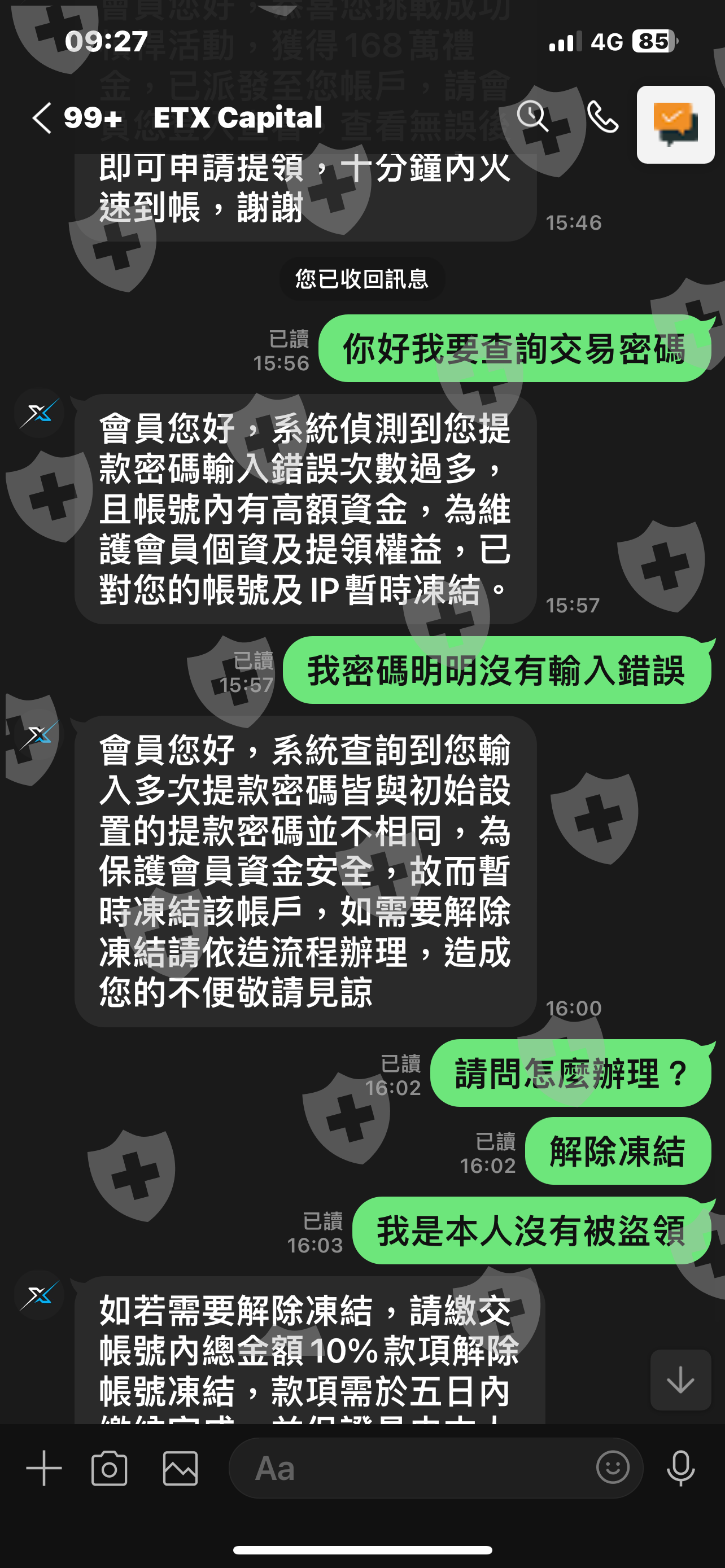 以輸入錯誤密碼為由凍結帳戶,要付總資產的10%出金費,才能重設密碼及提領出金