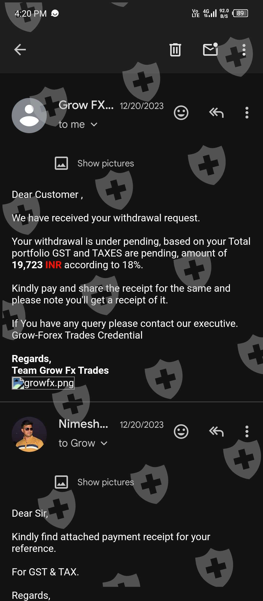 I have open account in GrowFx Trade. And invest total 50000 INR rupees. They was trade and make a profit. When I was placed request for withdrawal so, they was send mail to pay GST & TAX. I have also pay GST TAX (Screen shot of mail attached in this). But still they have not credited my amount in my bank.