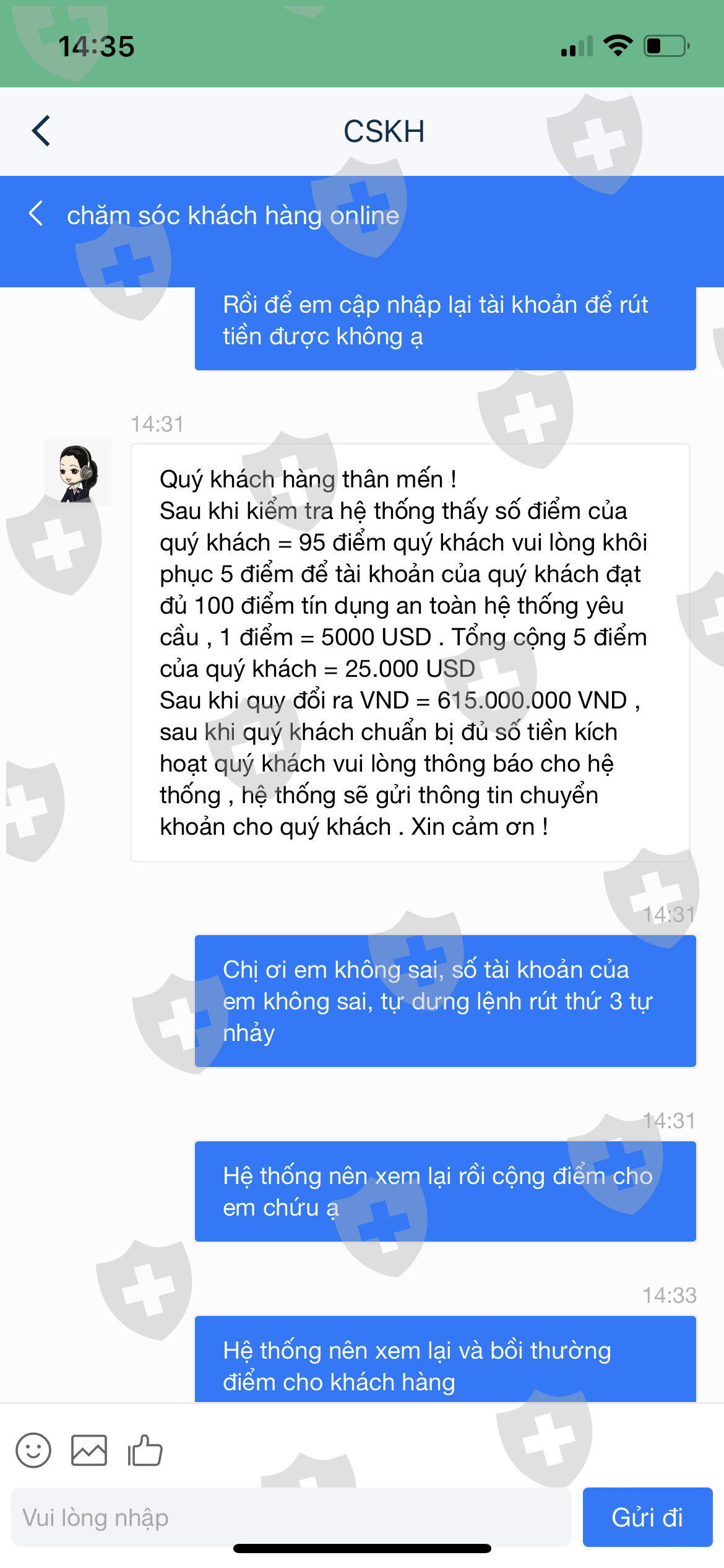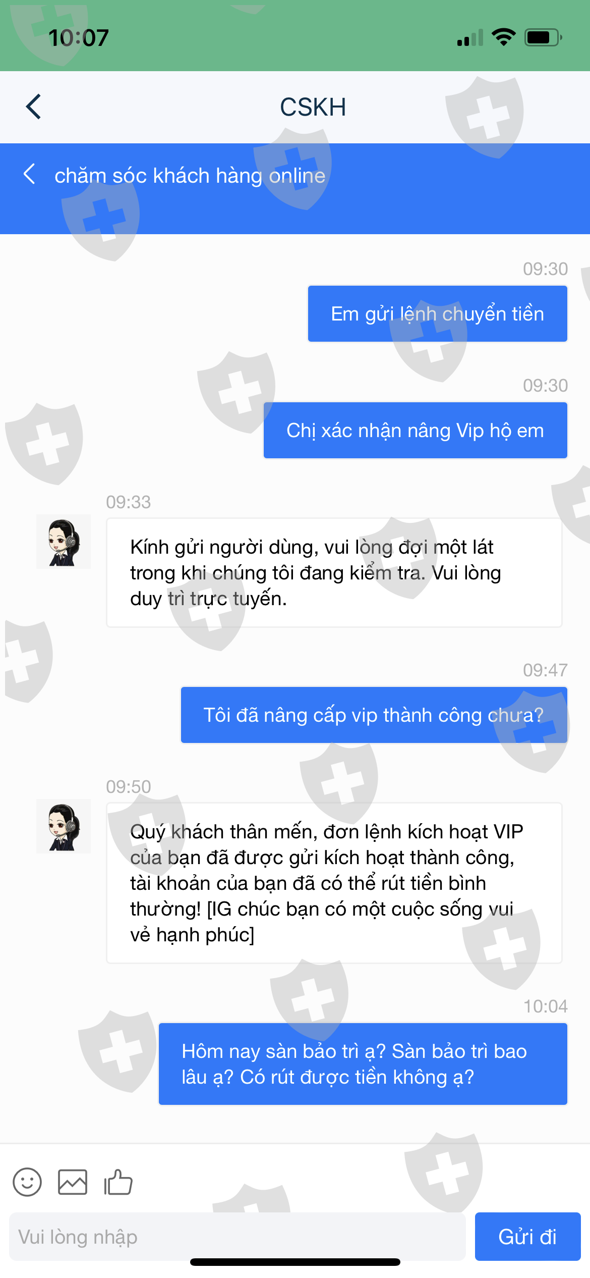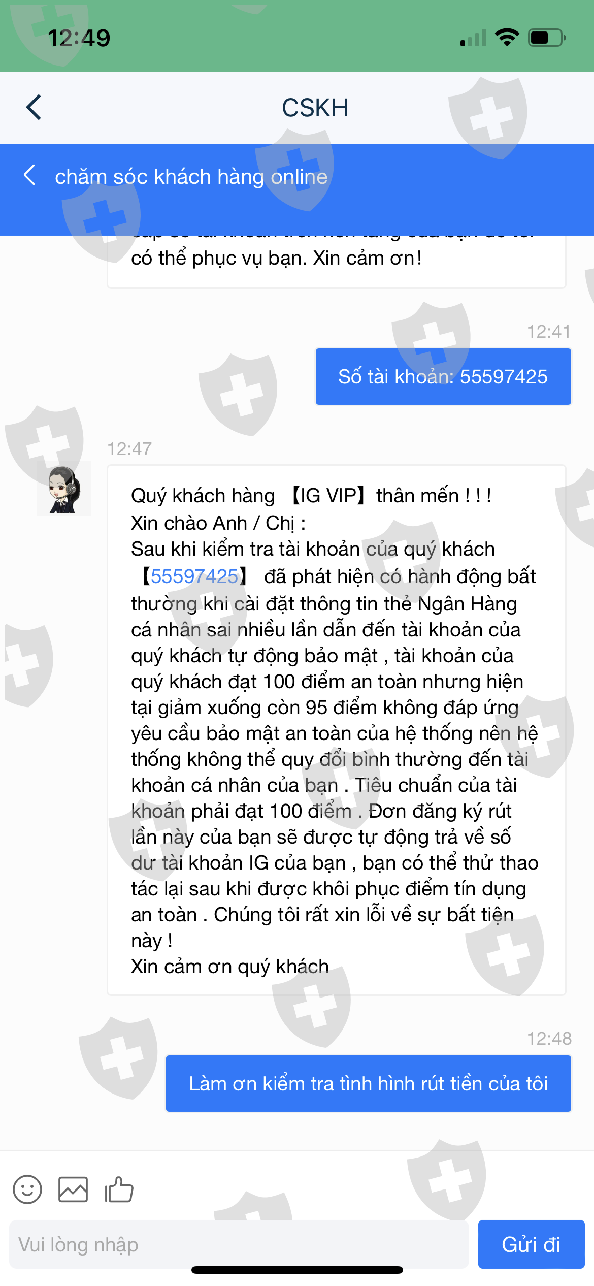 Tôi có sử dụng app IG VIP để đầu tư từ ngày 28/12/2023. Sau khi rút tiền được 2 lần, app yêu cầu tôi nâng vip mới được rút tiếp. Tôi đã nạp tiền nâng vip nhưng vẫn không thể rút được tiền. Họ trừ điểm và bắt tôi phải nạp thêm để nâng điểm rút tiền.