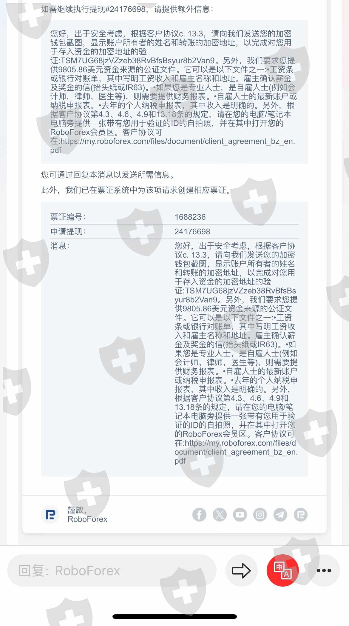 2023年10月份入金10000美金,交易一个多月盈利约1200美金,账户无缘无故被冻结,同时无法出金。联系客服后总是要提交资料,提交了三个月资料还是不符合要求,就是黑平台,请大家远离Roboforex黑平台