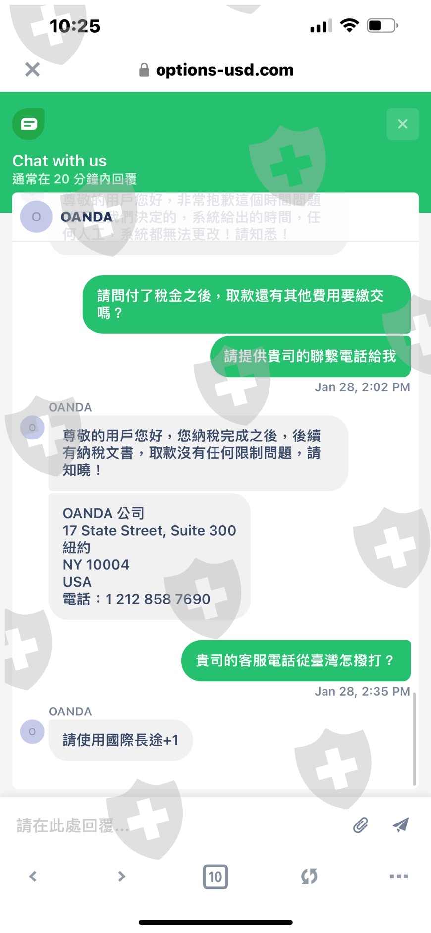 options-usd.com平台客服自稱是OANDA公司,交易獲利後要求出金4萬U遭拒,客服表示因帳戶總資產超過中華民國國稅局的納稅規定,需在48小時內繳稅總資產的20%,後來凍結我帳戶,七天內解除凍結每日案千分之三扣違約金。經查證OANDA總公司此為假平台假網站。