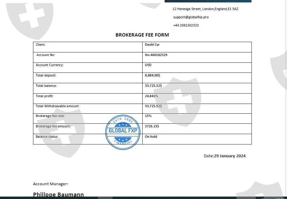 2024 年 1 月初,一位在 GlobalFXP 在线交易服务公司工作的所谓交易员 Philippe D. Bowmann 通过电话联系了我。我开始投资 250 美元,他赚了一点利润,他和我一起提取了我的银行帐户中的利润给了我信心。我又投资了大约 2000 美元,用比特币支付给他,股票市场和加密货币订单的利润上升了。我很怀疑,我问了他很多问题,但他们设法说服我投资更多。 3 周后,这些头寸的利润达到 24,841 美元。我的 GlobalFXP 账户余额为 33,375 美元。在这个阶段,我已经从 Trust Wallet 投资了大约 9000 美元的比特币。在收到我的钱之前我必须向经纪人支付 15% 的佣金,而且不可能从我的利润中扣除。所以我支付了 3726 美元的佣金。菲利普告诉我,他用比特币将我的存款转入了我的信托钱包。随后,一个自称在区块链工作的人要求我向他支付 3000 美元的区块链网络保险,一旦验证完成就会返还给我。我问问题,我看得出来他们想让我流血直到最后。我被皇家骗了。我总共损失了约 12,000 美元我掌握的信息(见图)Philippe David Bowmann,(647) 374-5429,加拿大多伦多 philippedbaumann@globalfxp.pro 交易员 CRD 4208267