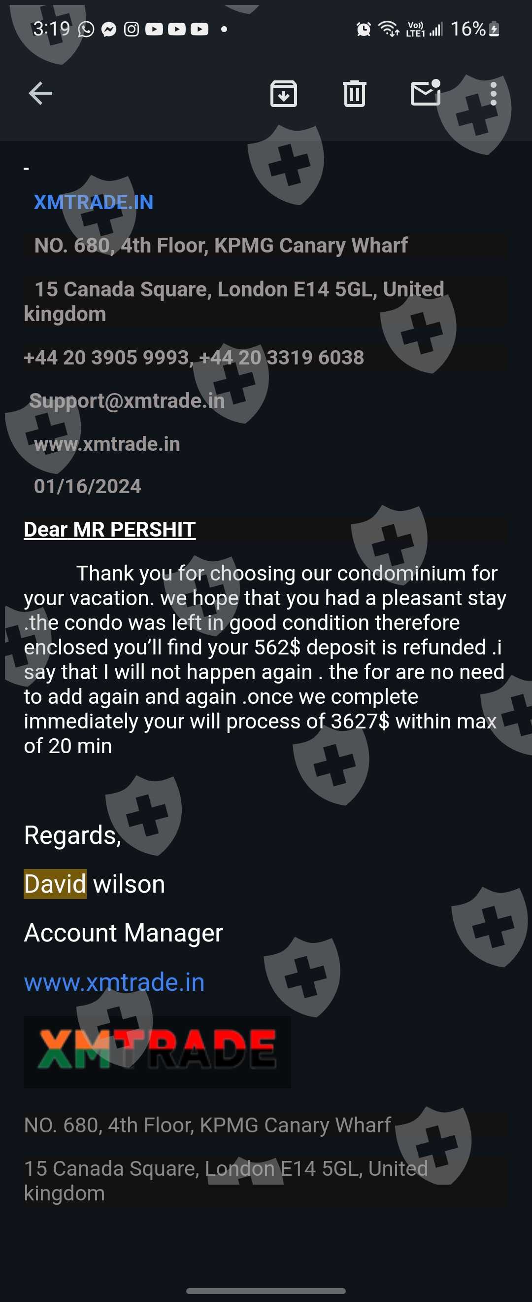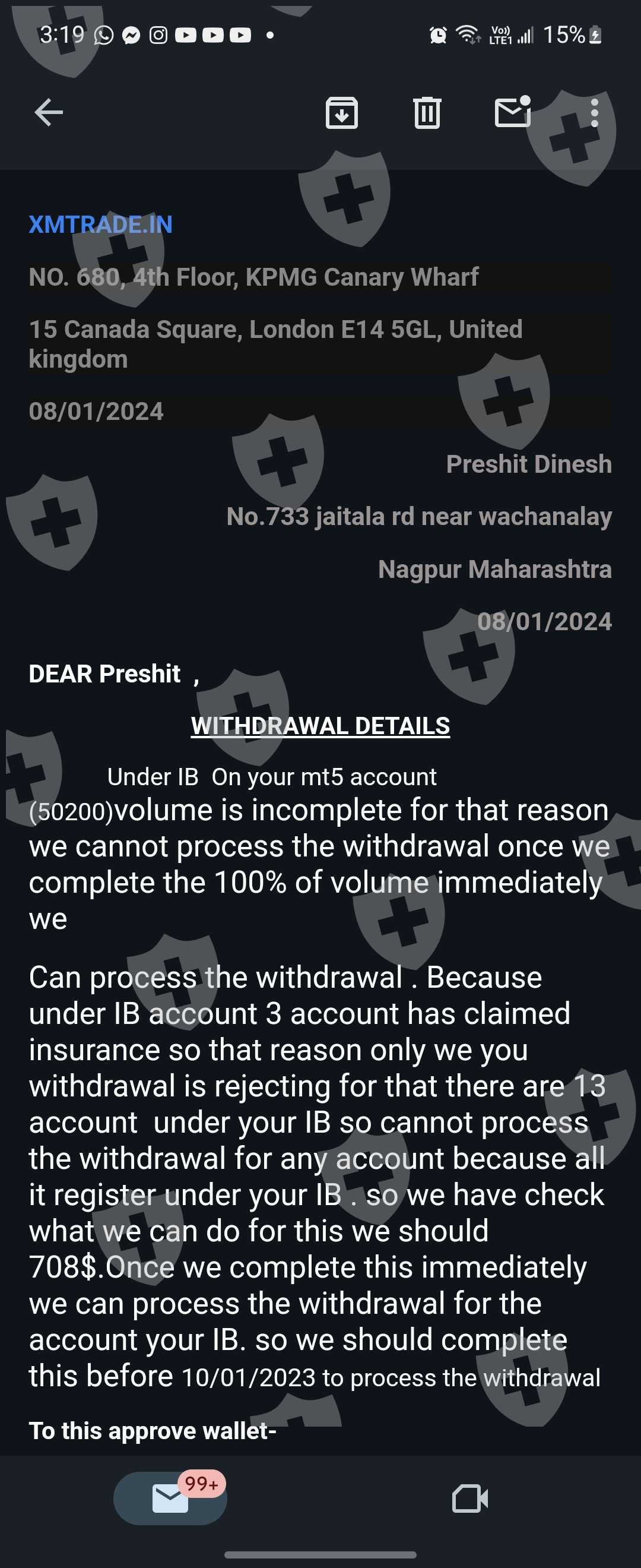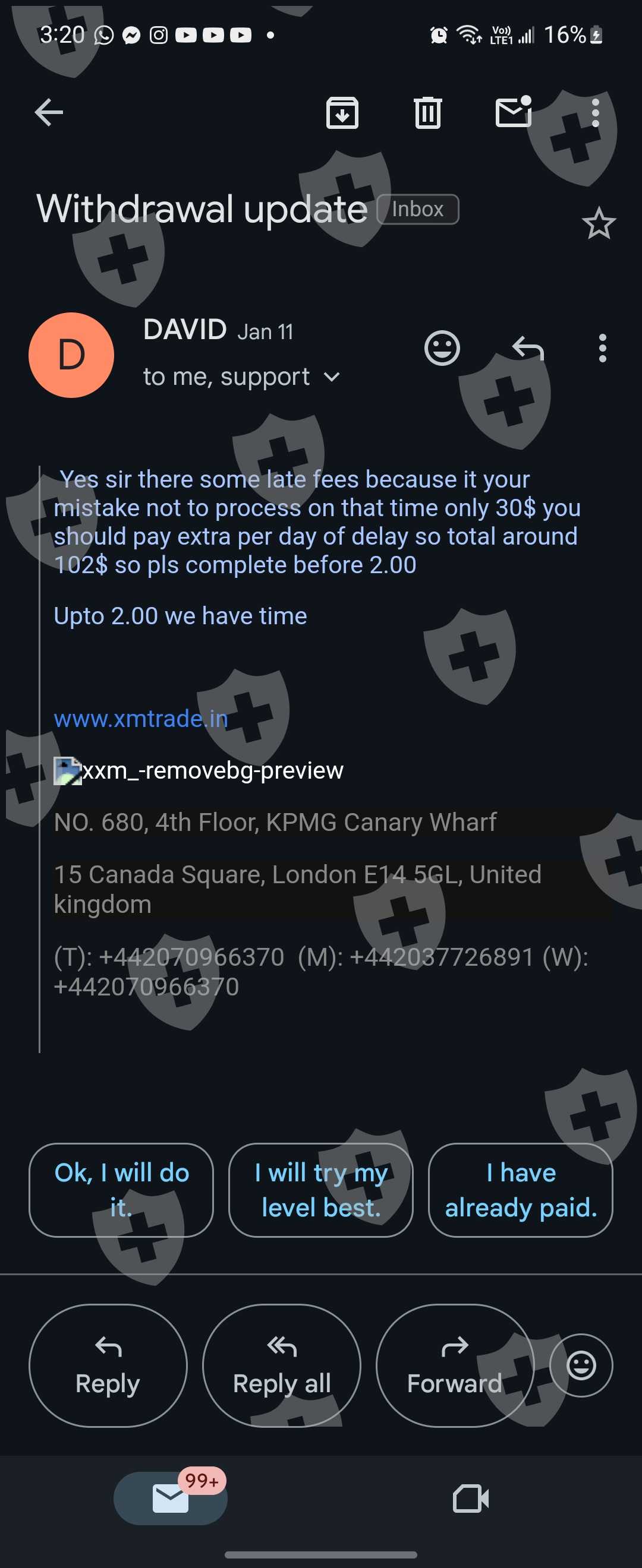 xmtrade the website name is xmtrade.in I provide them clients and they told me I am ib approx I have a withdraw of 16k$ they are asking me to pay 700$ for claiming insurance otherwise all my clients account will freeze and if I payed that amount they will provide me the withdrawal in just 20min and when I payed they are asking me for 30$ extra for late fees and after I payed 730$ they are asking me for to pay 560$ extra for withdraw fees and all that fees are refundable but they are all laying everytime and I am in very difficult situations please please help me someone how Can I solve this problem otherwise I have to do suicide just because of that company because if that money is mine I am not worried about any thing but it's about other people's money so that's my my clients are trusting me and i payed them money buy borrowing money on intrest I given them approximately 1100$ for nothing in my pocket but they are not even providing me a single $ in my binance ac please help me or guide me how can I get out through that problem or hire me I want money otherwise thy are doing scam and lots of people scam and diye just because of there fault please some help me I am very thankful to any one
