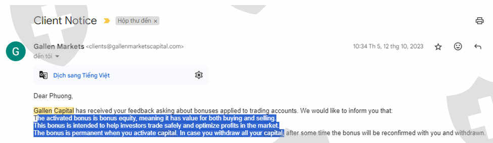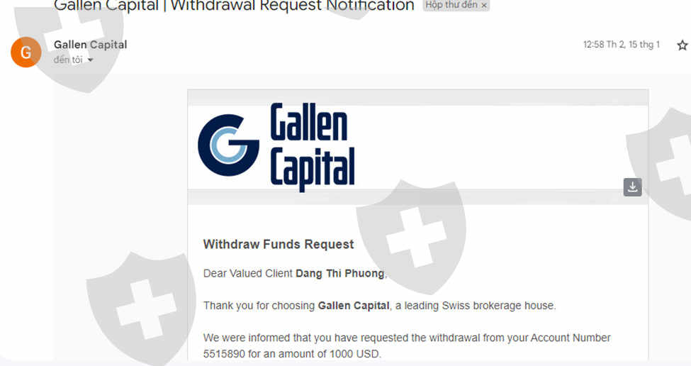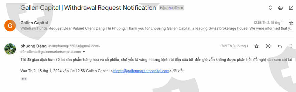 我存入资金并在交易所进行交易 Gallen Capital.2024年12月14日,我存入资金到mt5账号5515890,交易了一段时间。12月28日,我下了提现指令,但交易所不允许提现,支持报告交易量不够。如果交易量不提现,据说我必须交易保证金的30%才能提现。2024年1月10日,我交易了大约50手产品,主要是黄金,我下了提现订单。但仍然没有执行,支持人家告诉我交易量不够,2024年1月15日,我交易了70多手产品,下了提币单,还是不行,收到邮件询问兑换的事情,我还没有收到这个问题的回复,1月19日,我交易了90手产品,下了提现单,还是收不到,2024年1月26日,场内自动提现了我的资金(5000美元),我没有下了提款单,我没有收到这个提款单,也没有收到钱回到我的银行账户,楼层还提取了楼层承诺永久奖金的奖金(10,000美元),让我的账户变得脆弱,楼层增加了交易费来补偿。烧毁了我的账户。楼层烧毁了我的账户,我就这个问题向楼层发送了电子邮件,但没有收到任何回复,支持人员报告系统错误,我不得不用我的原件存钱资本新交易所提供整治支持,场内自动向客户提款属于严重违规行为,如果是系统错误,需要有明确的解释,退还账户并赔偿客户。我期待尽快获得支持