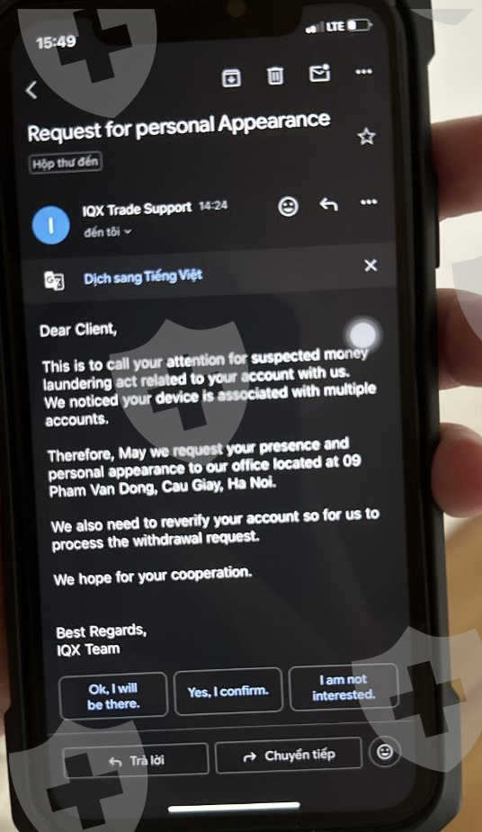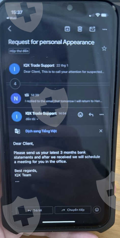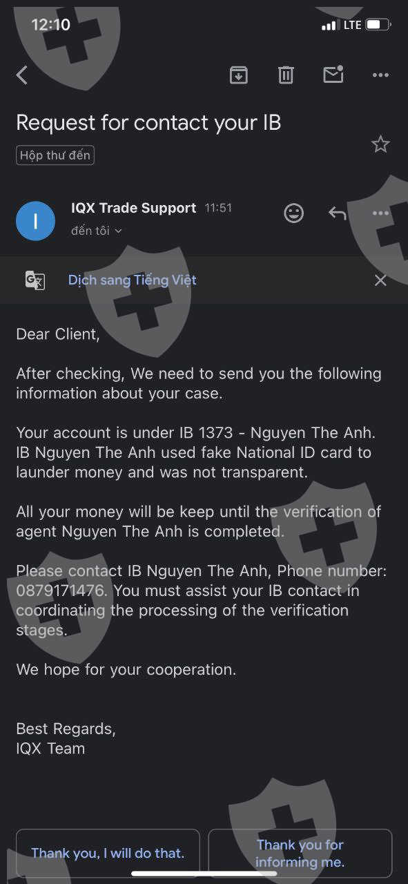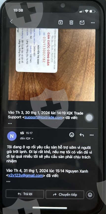 Tuy nhiên IQX Trade không cho rút tiền và gửi mail nghi ngờ rửa tiền yêu cầu chúng tôi hợp tác và trình diện tại Văn Phòng. Mẹ tôi năm nay 72 tuổi, giữa trời lạnh 8 độ của HN, IQX hành hạ 1 bà già đi đi lại lại, khi mẹ tôi lên vp IQX HN thì có được 2 bạn tên Khánh tiếp, và hôm đó cũng có 2 bạn nữa lên đòi tiền do IQX không trả và mẹ tôi nói thấy 2 bạn đó quay lại clip thì bị những người đàn ông ở đó dọa nạt, bắt xóa. IQX sau đó liên tục gửi mail, bắt mẹ tôi già cả phải đi sao kê và làm đủ thứ theo họ yêu cầu. Nhưng cuối cùng chúng tôi nhận được mail IQX nói chúng tôi rửa tiền và tự phải đi tìm IB mà đòi tiền. Đây là hành vi lừa đảo không thể chấp nhận được, vì tôi có đầy đủ chứng từ nạp tiền lên sàn iqx, không phải đưa tiền cho bạn IB, và đến nay do không thể liên hệ được bạn IB đó nên tôi mới phải trực tiếp đi tìm cách lấy lại tiền cho mẹ mình